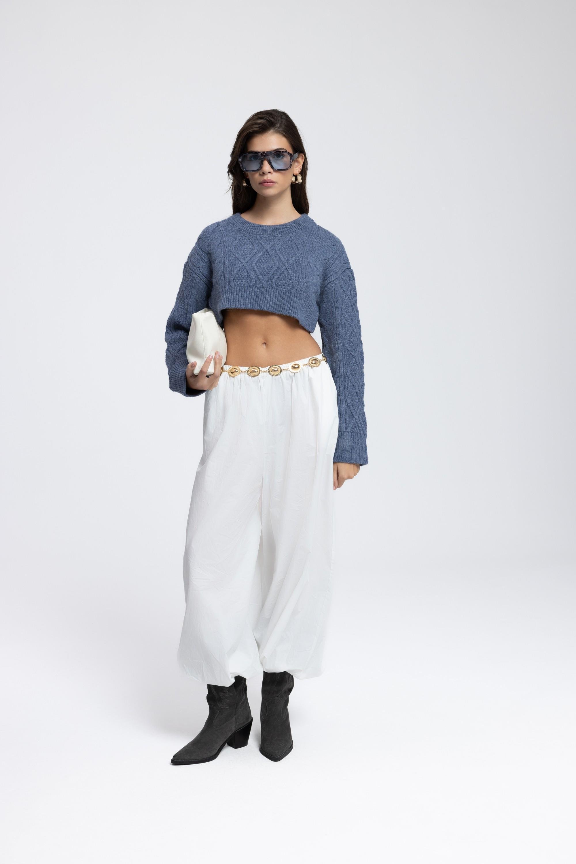 Rahat formda, uzun kollu ve bisiklet yakalı örgü desenli crop kazak
