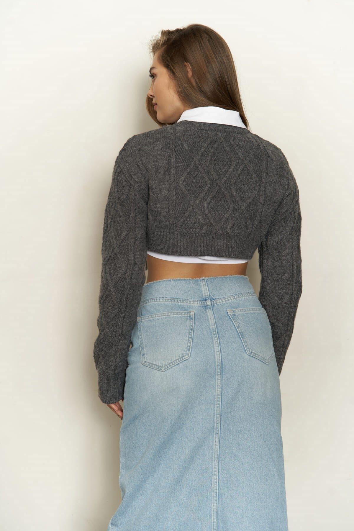 Rahat formda, uzun kollu ve bisiklet yakalı örgü desenli crop kazak