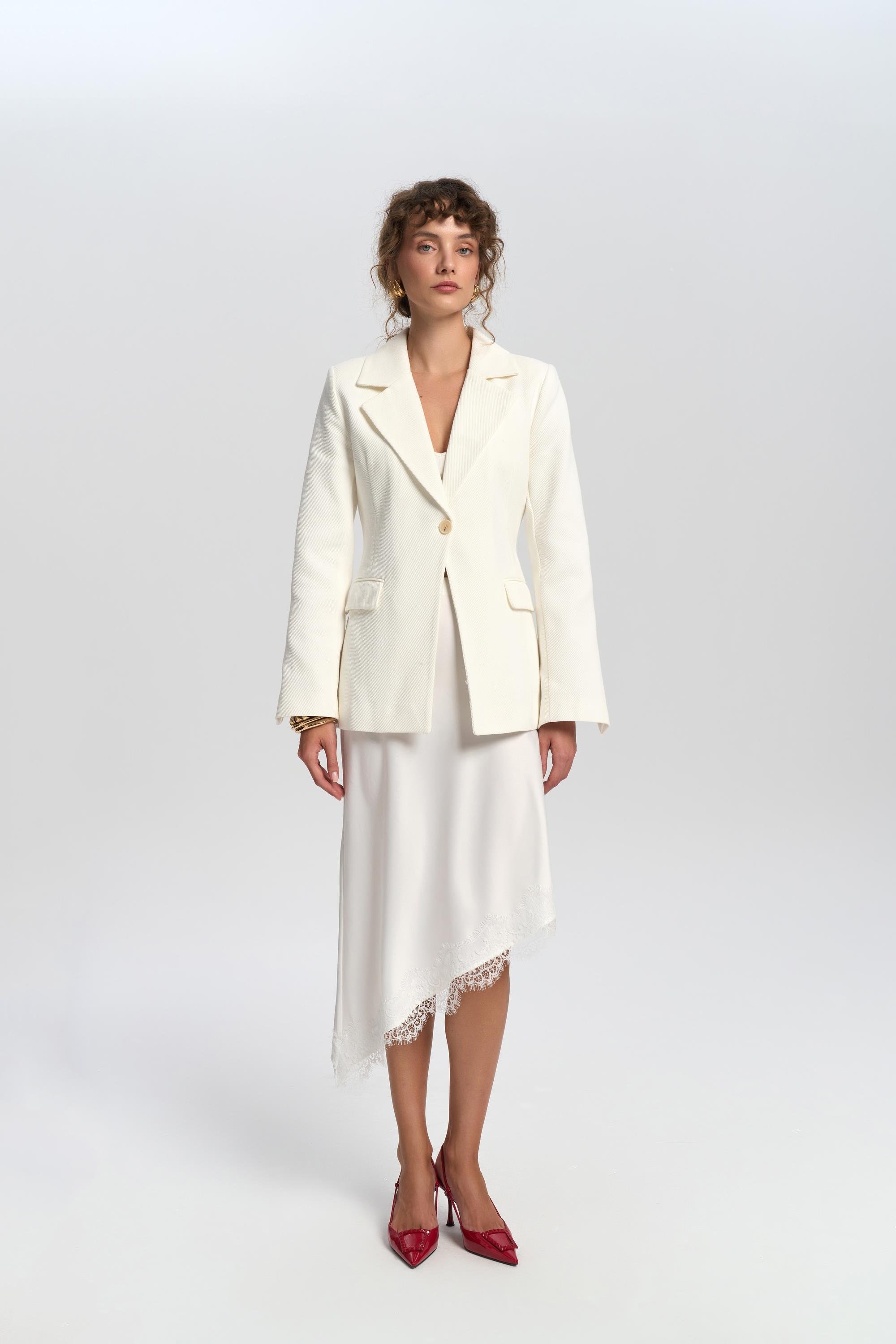 Vücuda oturan, etek ucu A-kesim blazer ceket. Önü düğme kapamalı ve kapaklı cepli. Vatkalı, uzun kollu özel tasarım blazer.