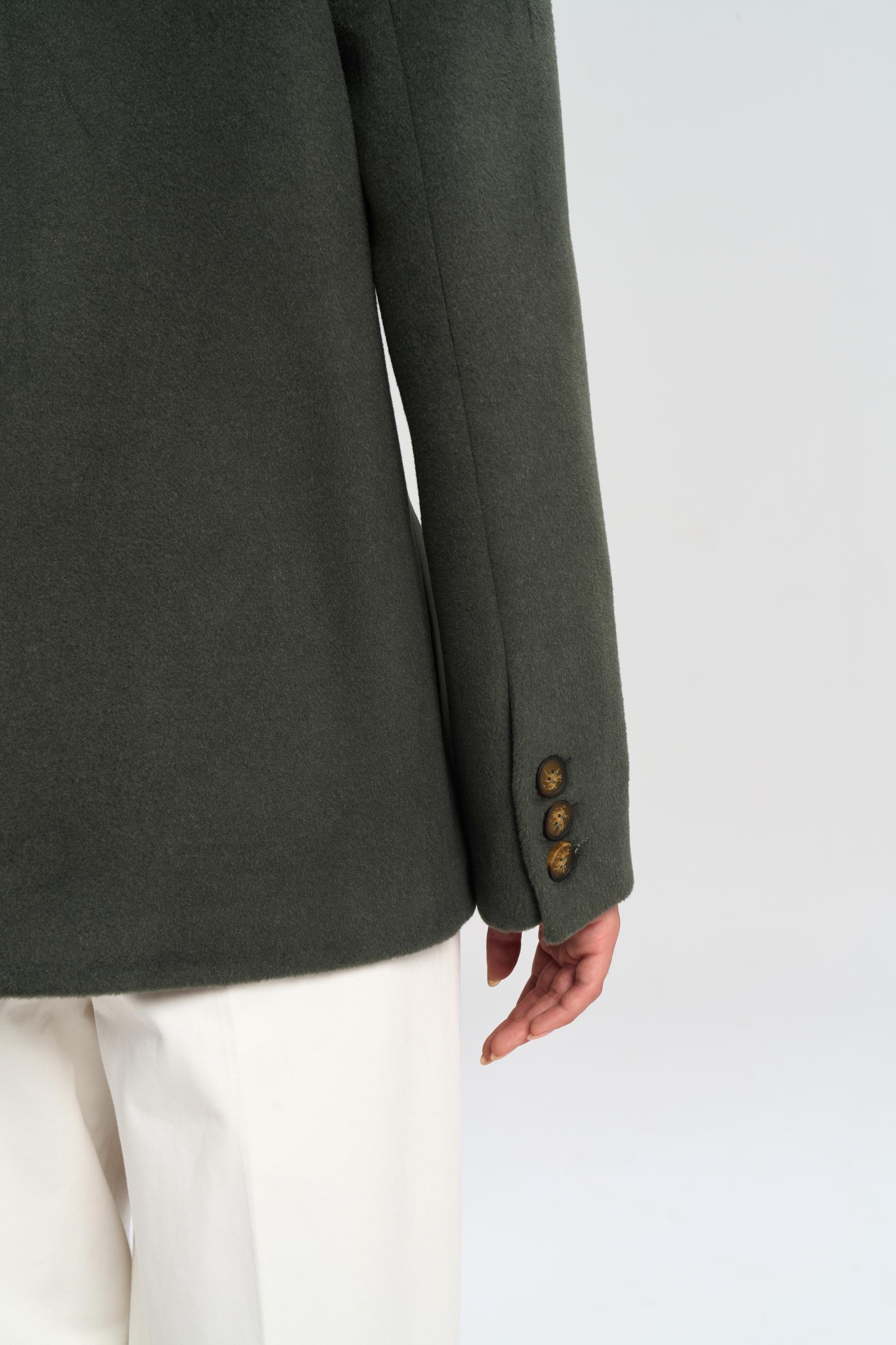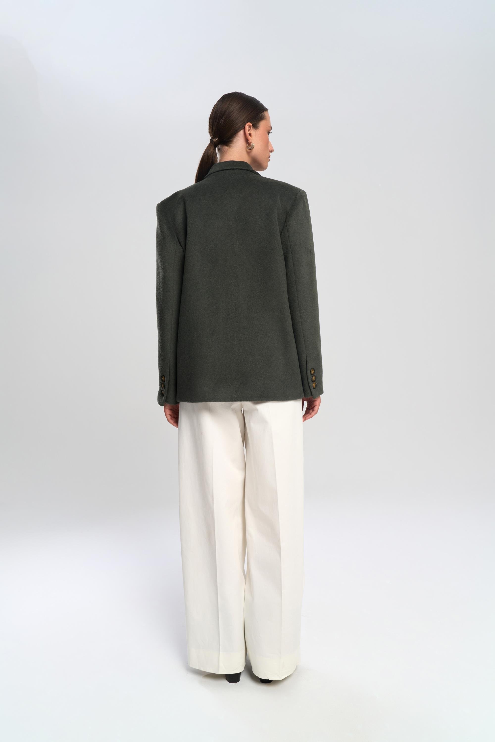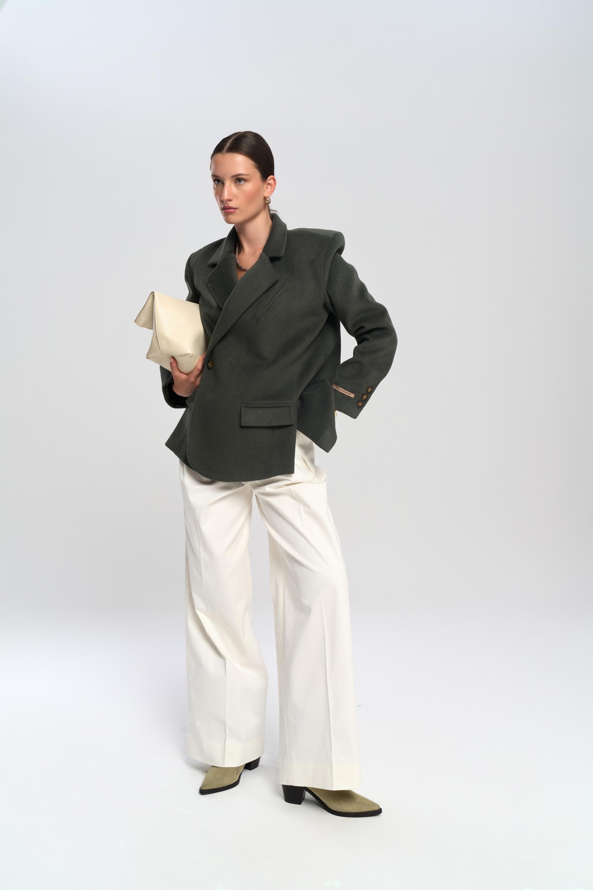 Vatkalı, düz kesim rahat formda, asimetrik ön kapama ve önü yırtmaç detaylı blazer ceket.