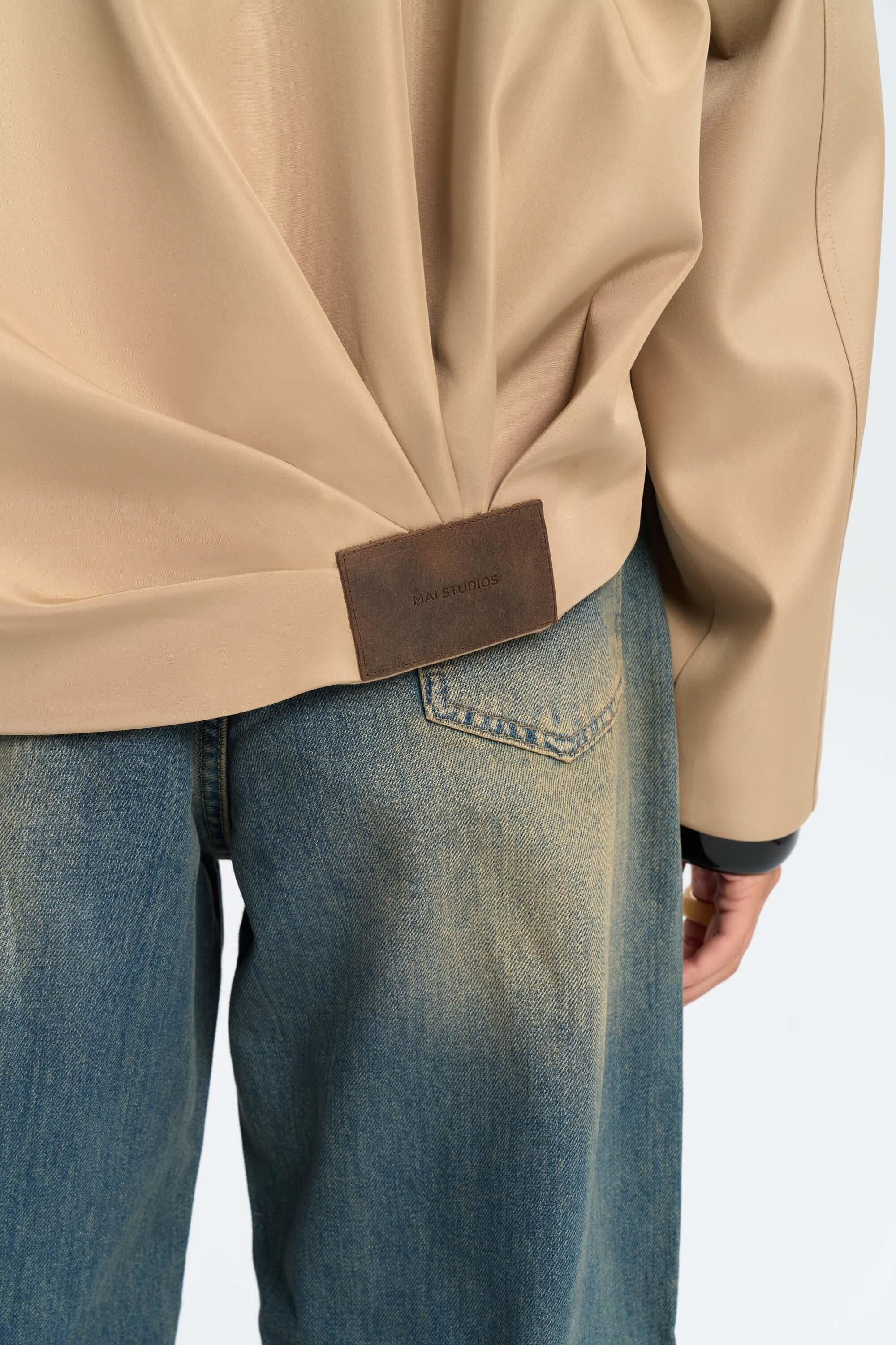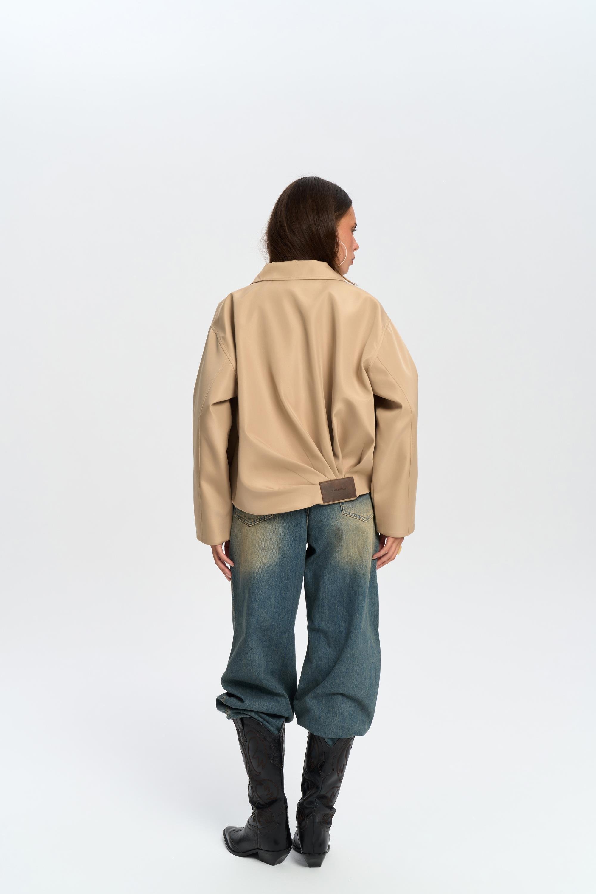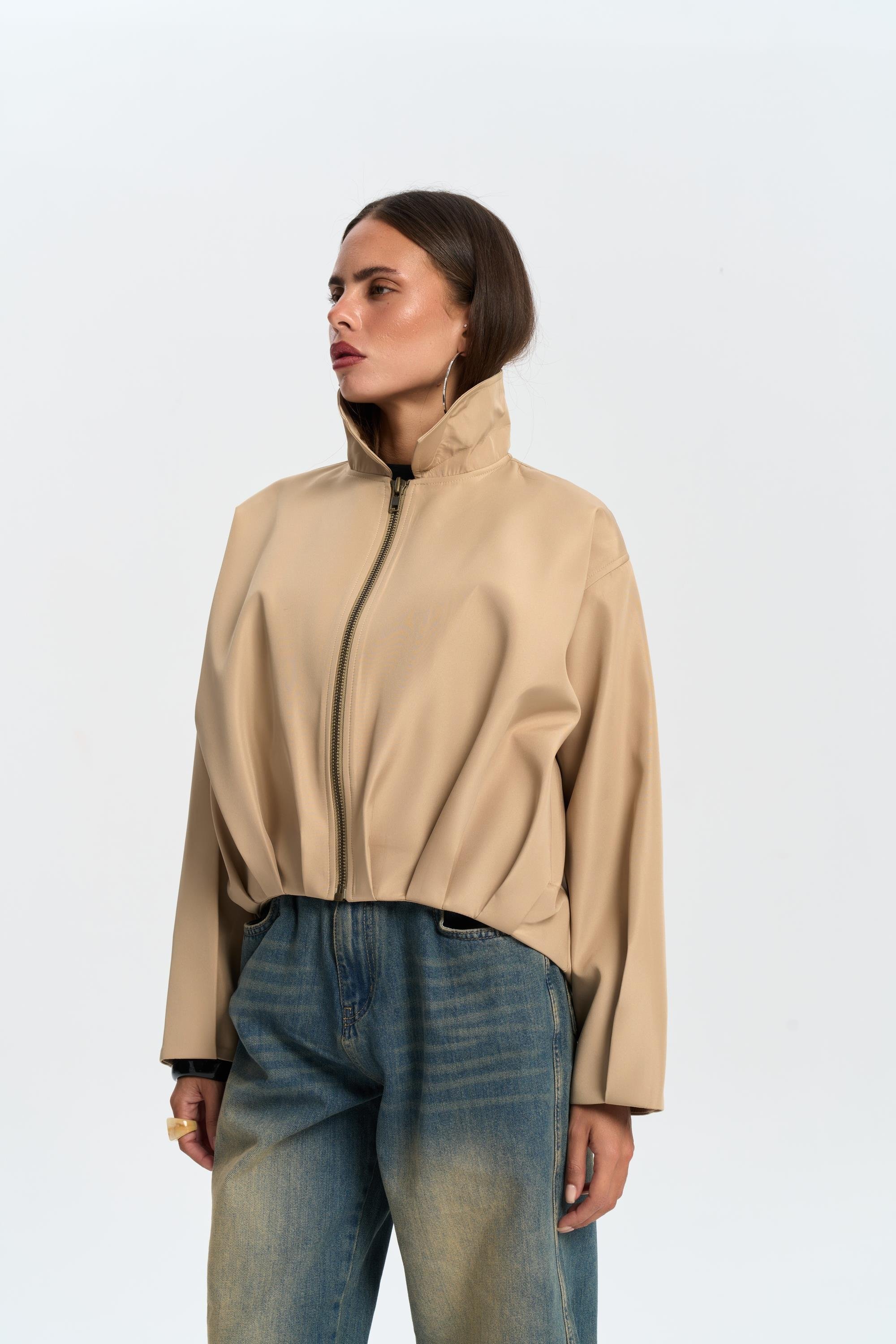 Hafif oversize, rahat formlu, ön ve arkada tasarım pili detaylı, ön kapaması fermuar detaylı cepli, su itici kumaş özellikli bomber ceket.