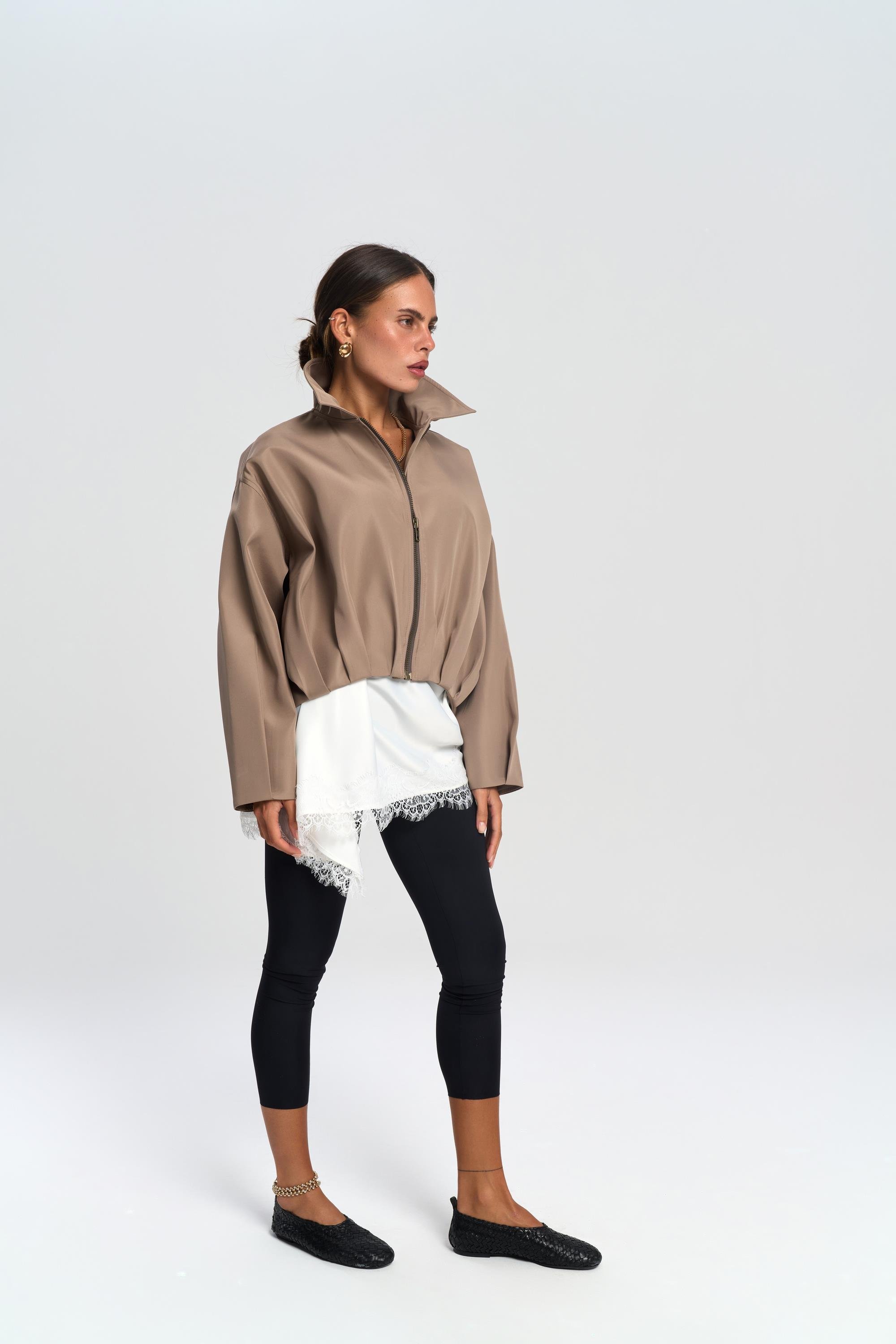 Hafif oversize, rahat formlu, ön ve arkada tasarım pili detaylı, ön kapaması fermuar detaylı cepli, su itici kumaş özellikli bomber ceket.