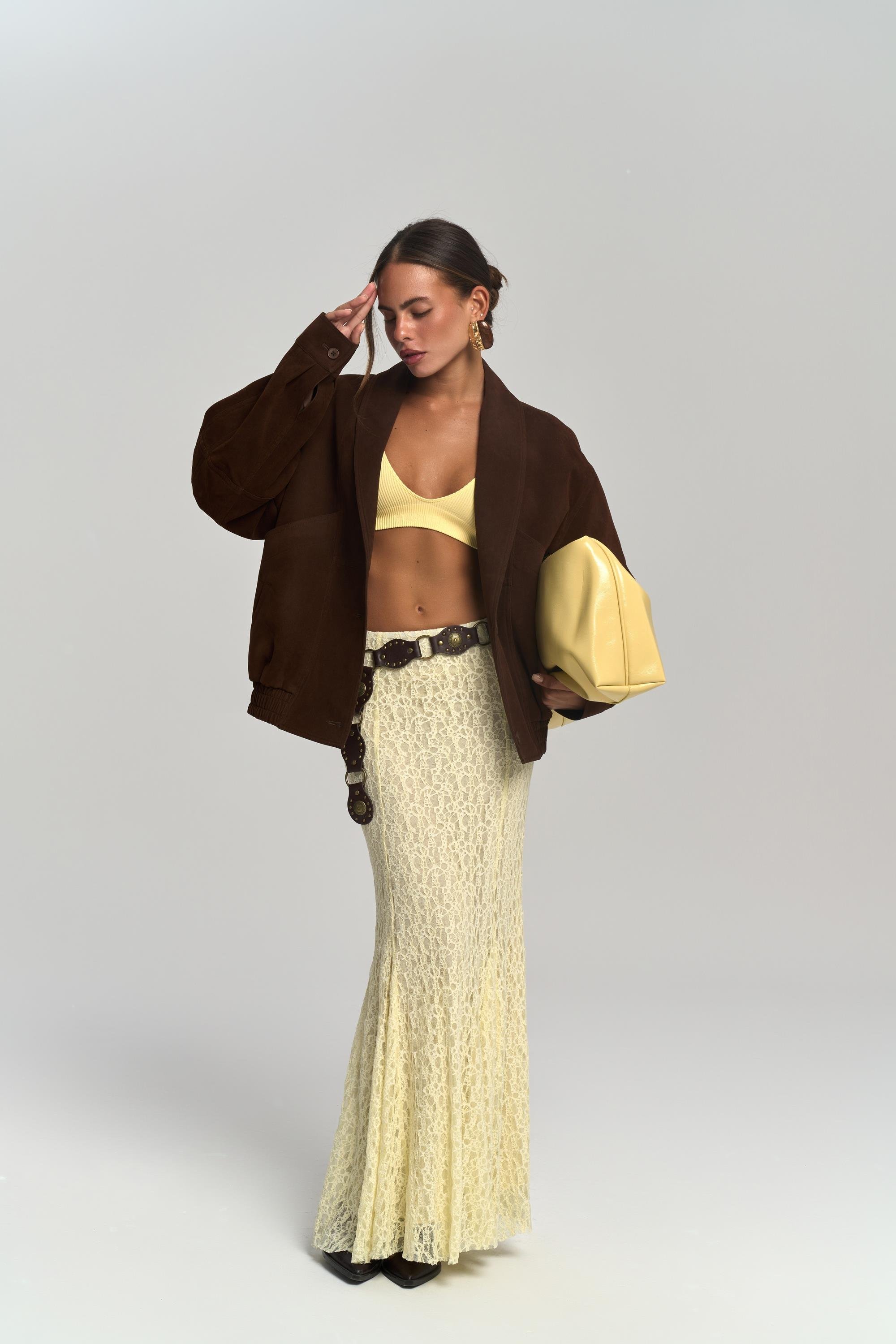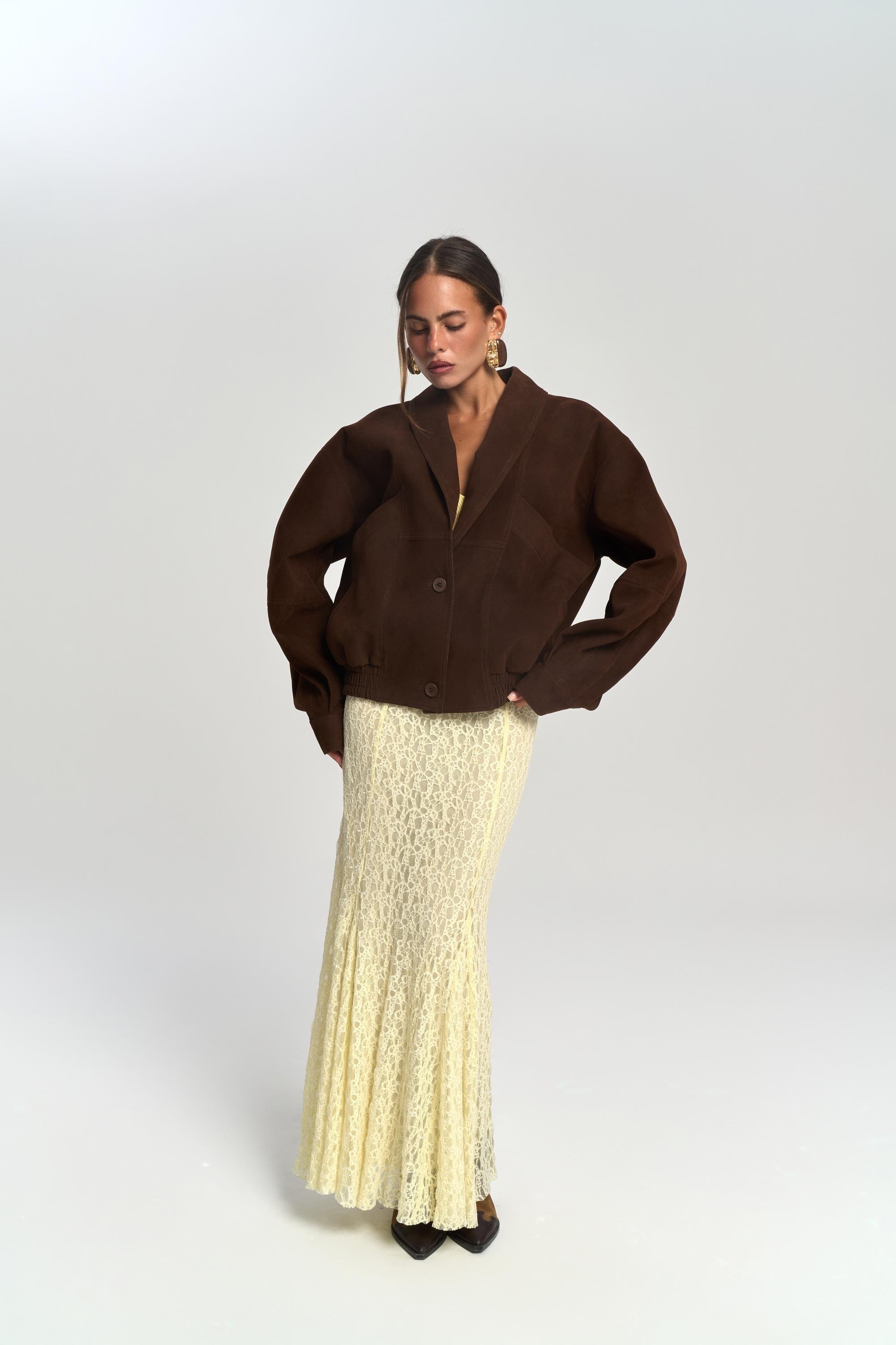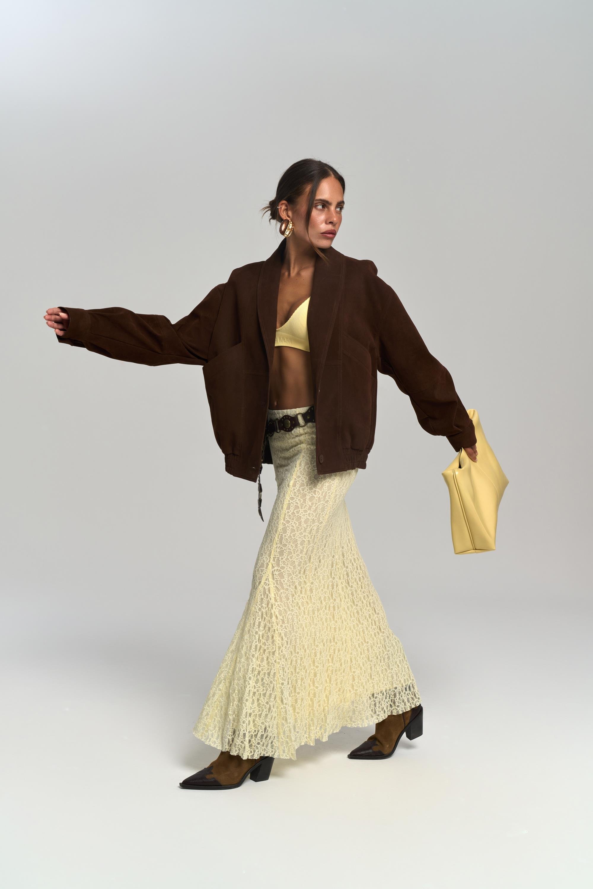 Unisex şal yaka, boyfriend formlu detaylı, çift cep ve kolda manşet detaylı etek. Ucu lastikli süet, bomber ceket.