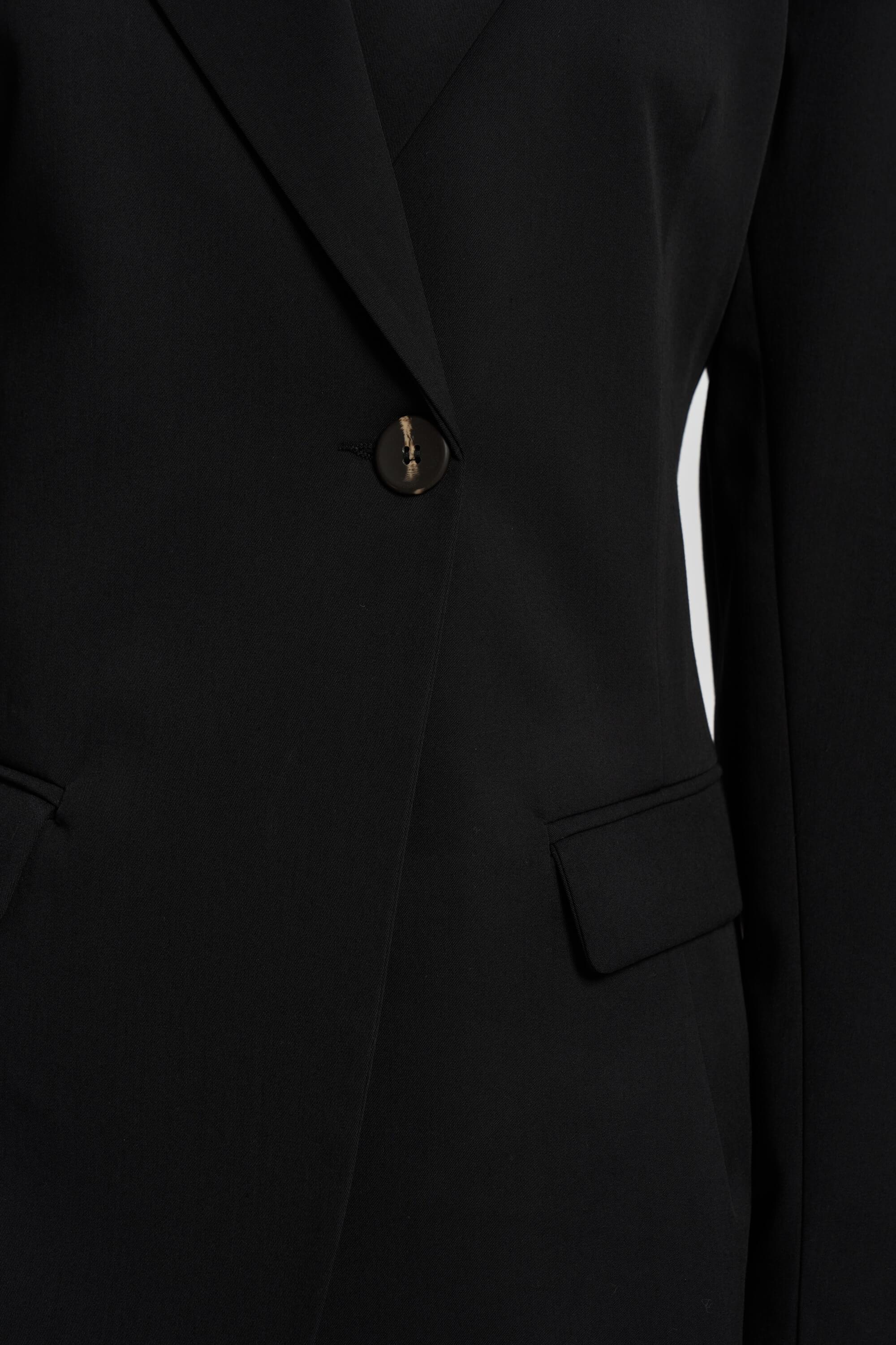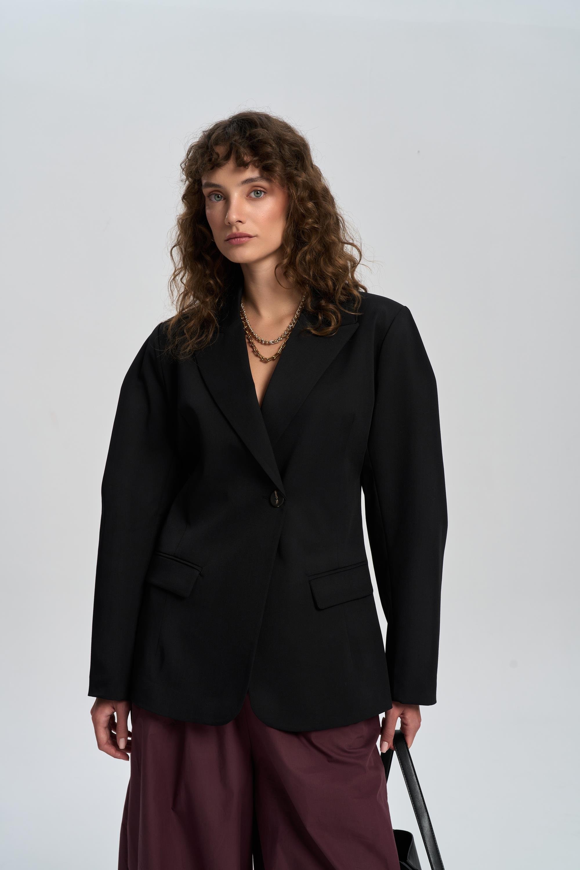 Fitted waist blazer. Padded shoulders, long sleeves with buttoned cuffs, faux pocket appearance. Double pleat detail on the sleeves. Double-breasted button closure. Fully lined special design. Leather-printed logo detail on the back.
