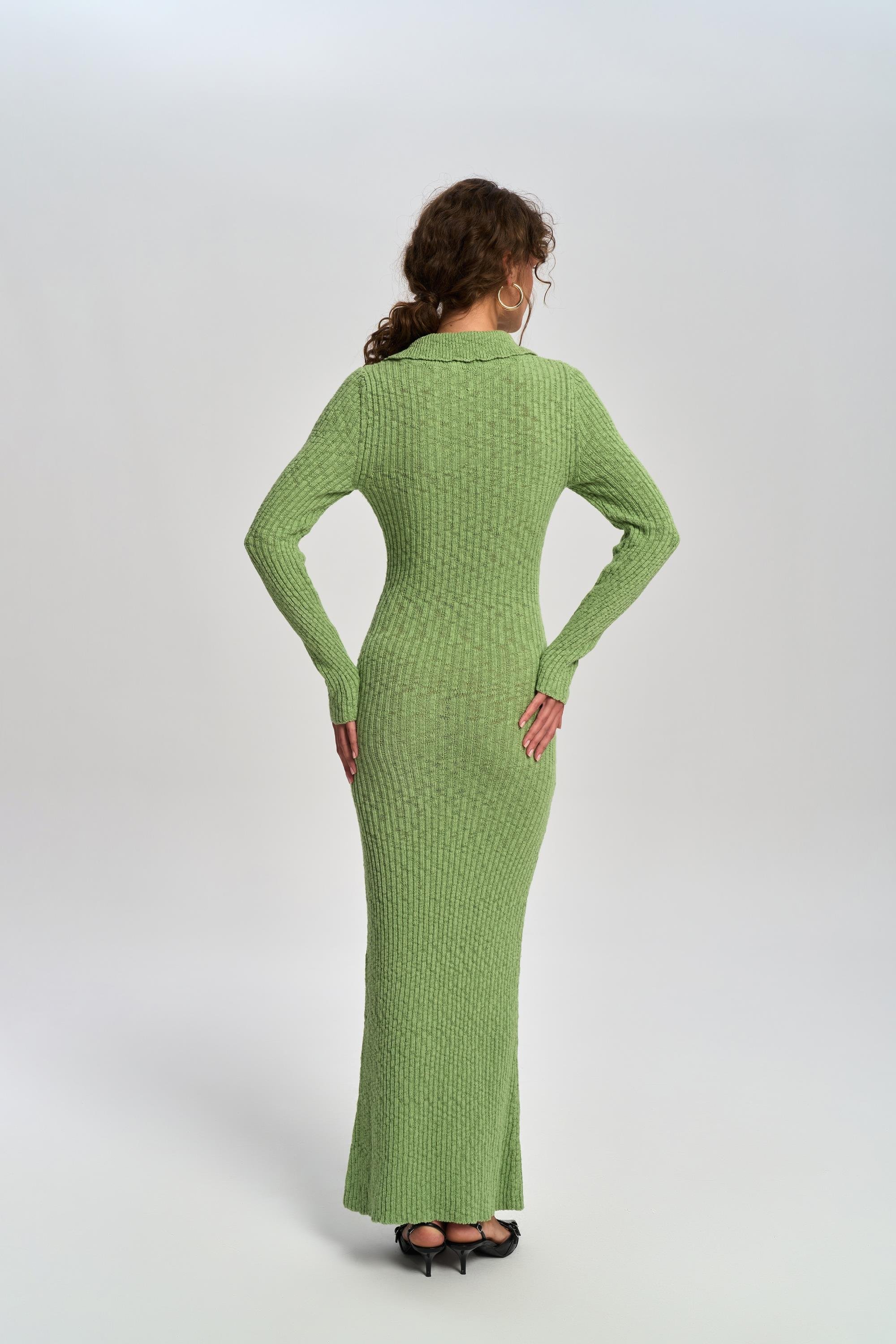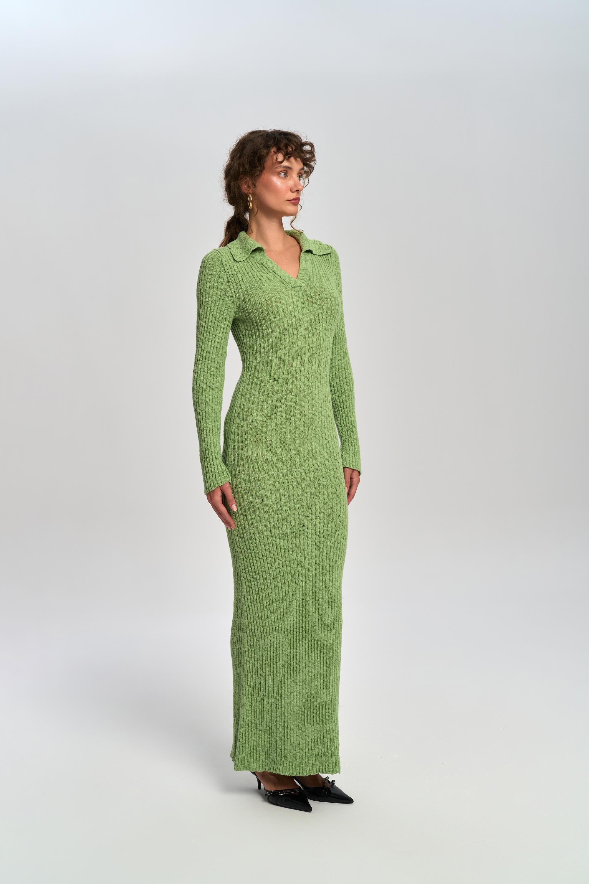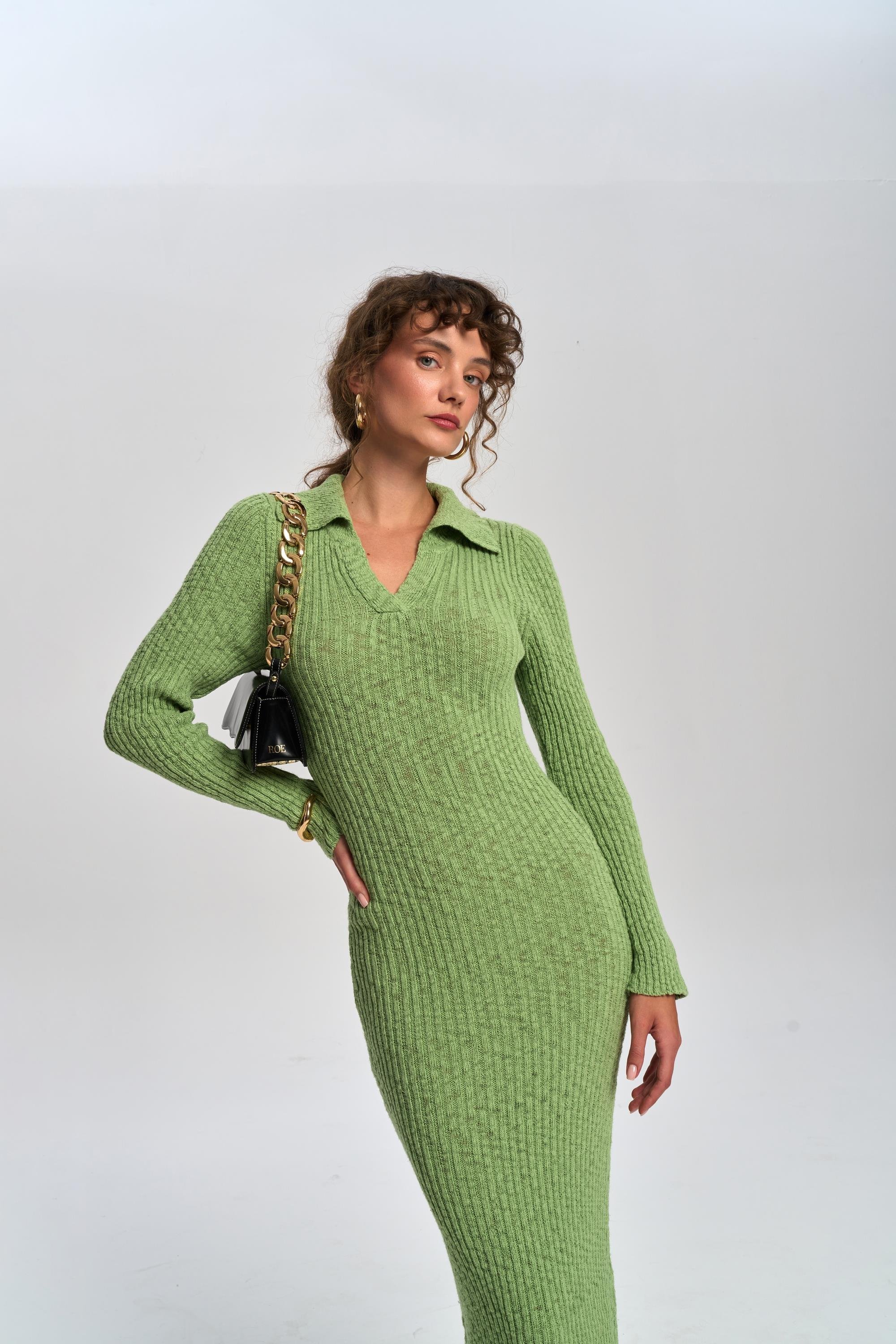 Bedene oturan formda, polo yakalı ve uzun kollu fitil örgü triko maxi elbise.