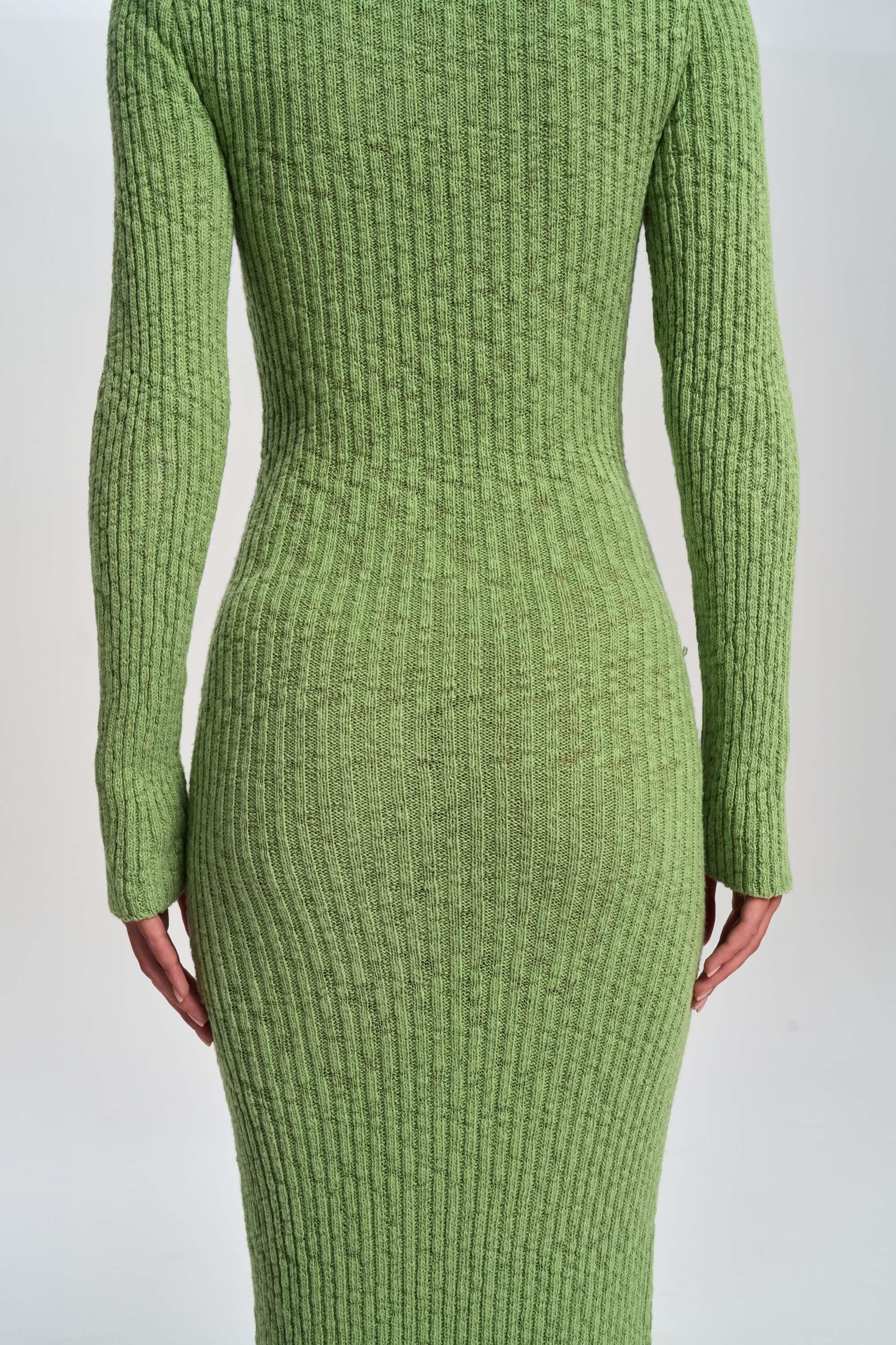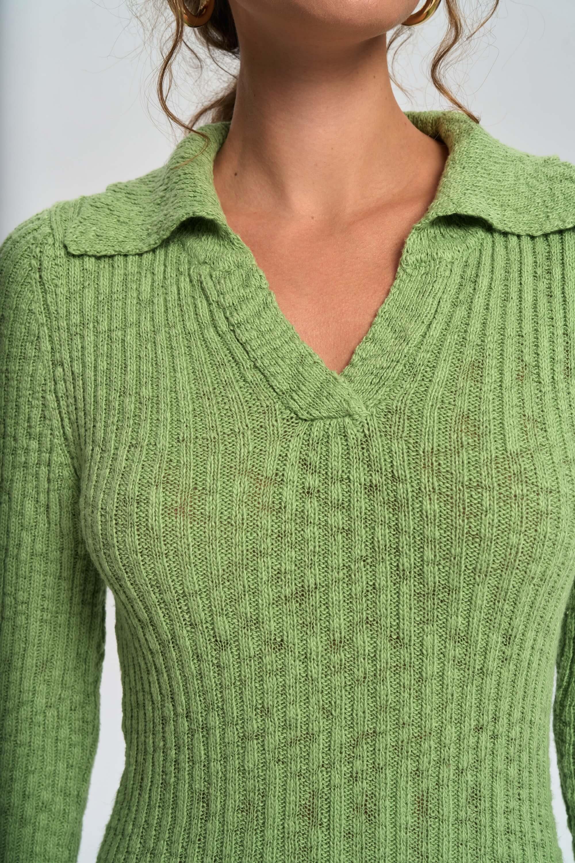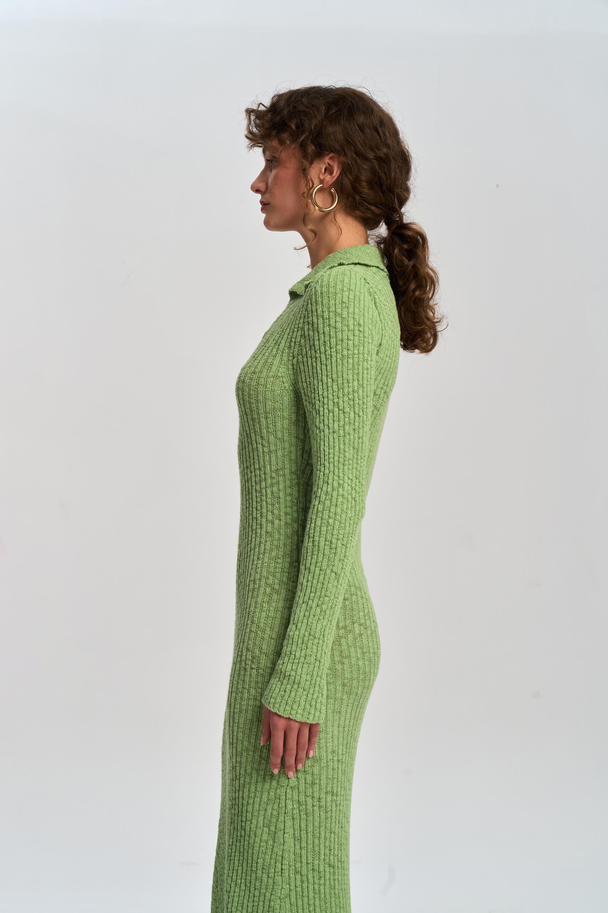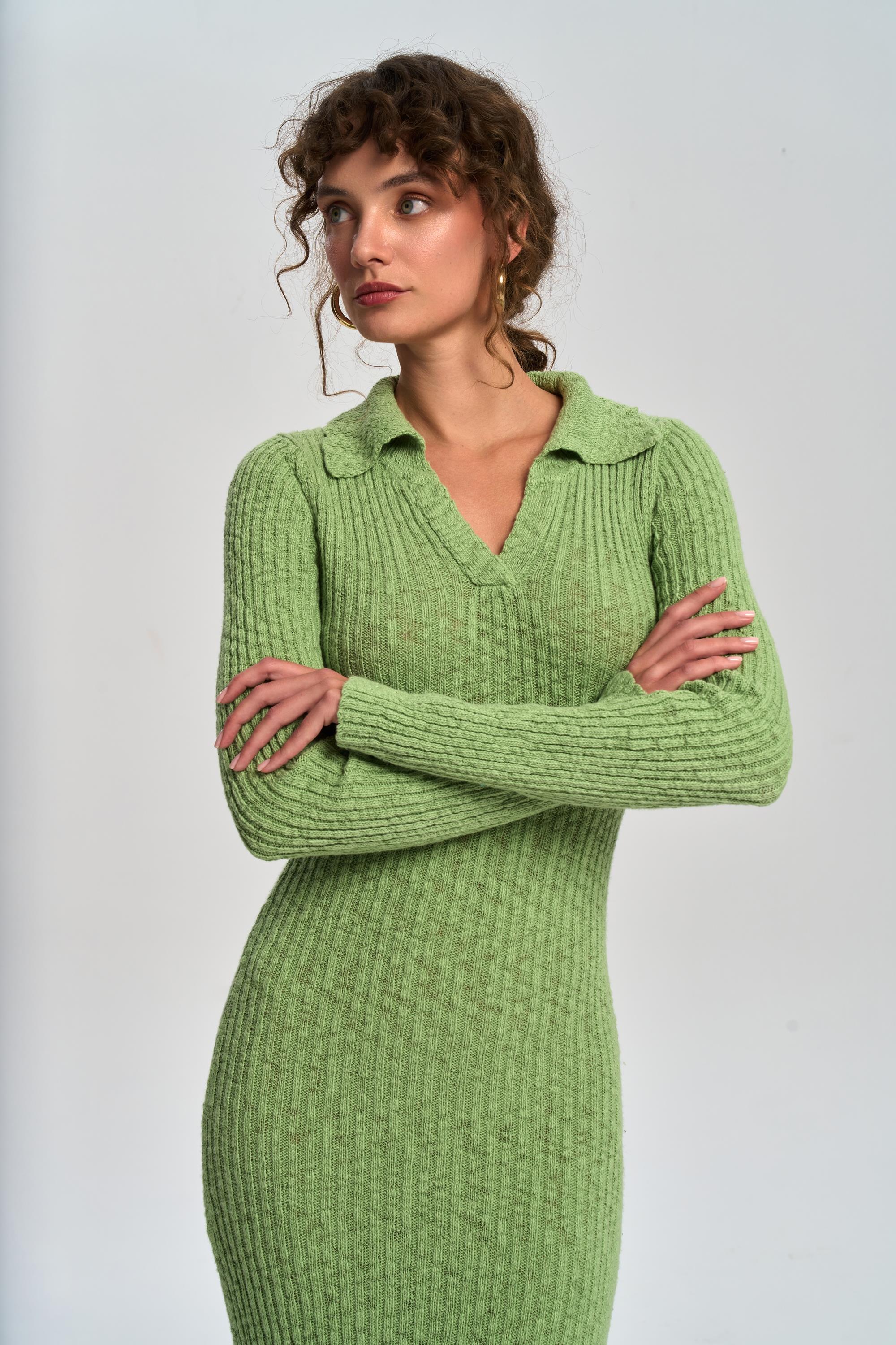 Bedene oturan formda, polo yakalı ve uzun kollu fitil örgü triko maxi elbise.