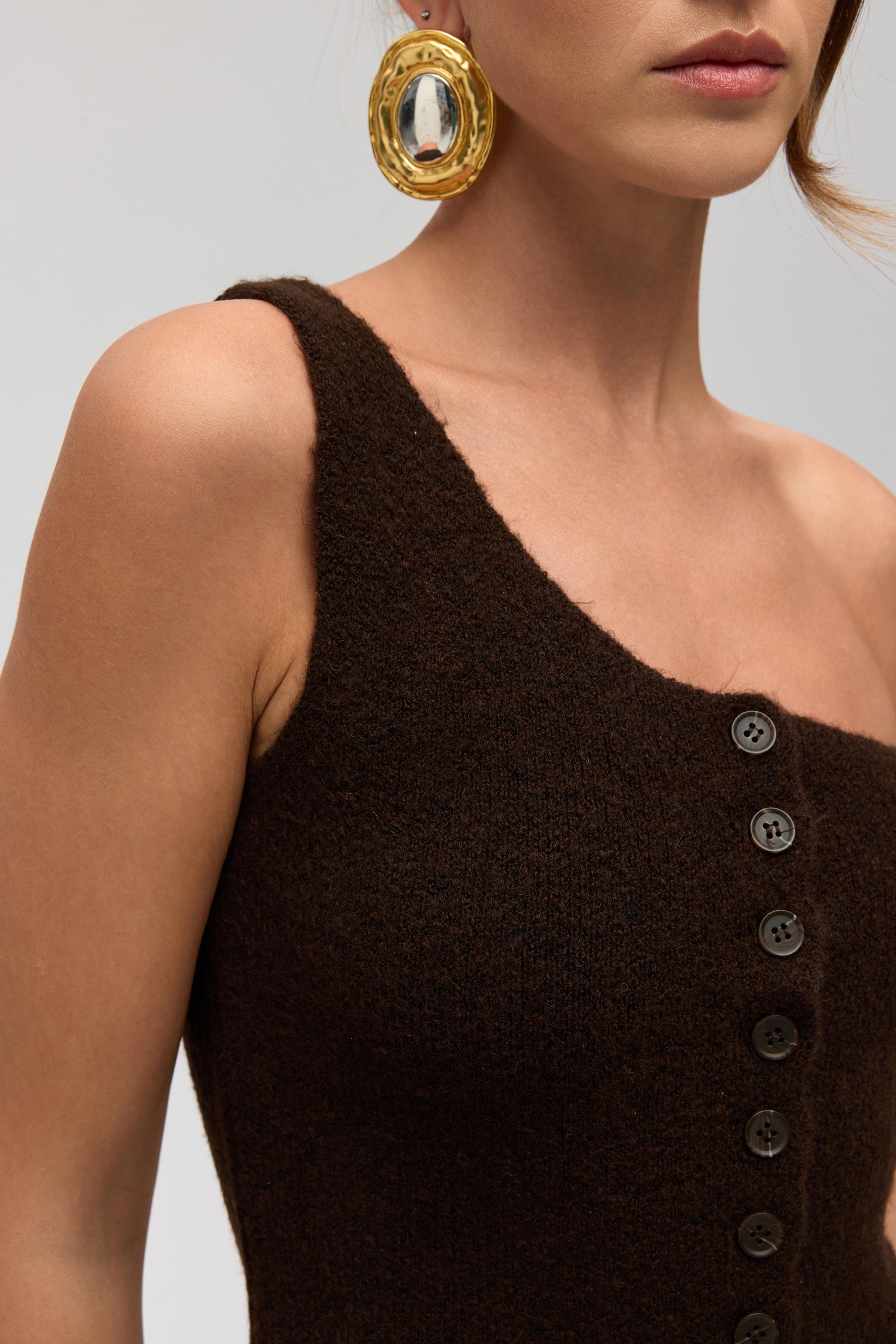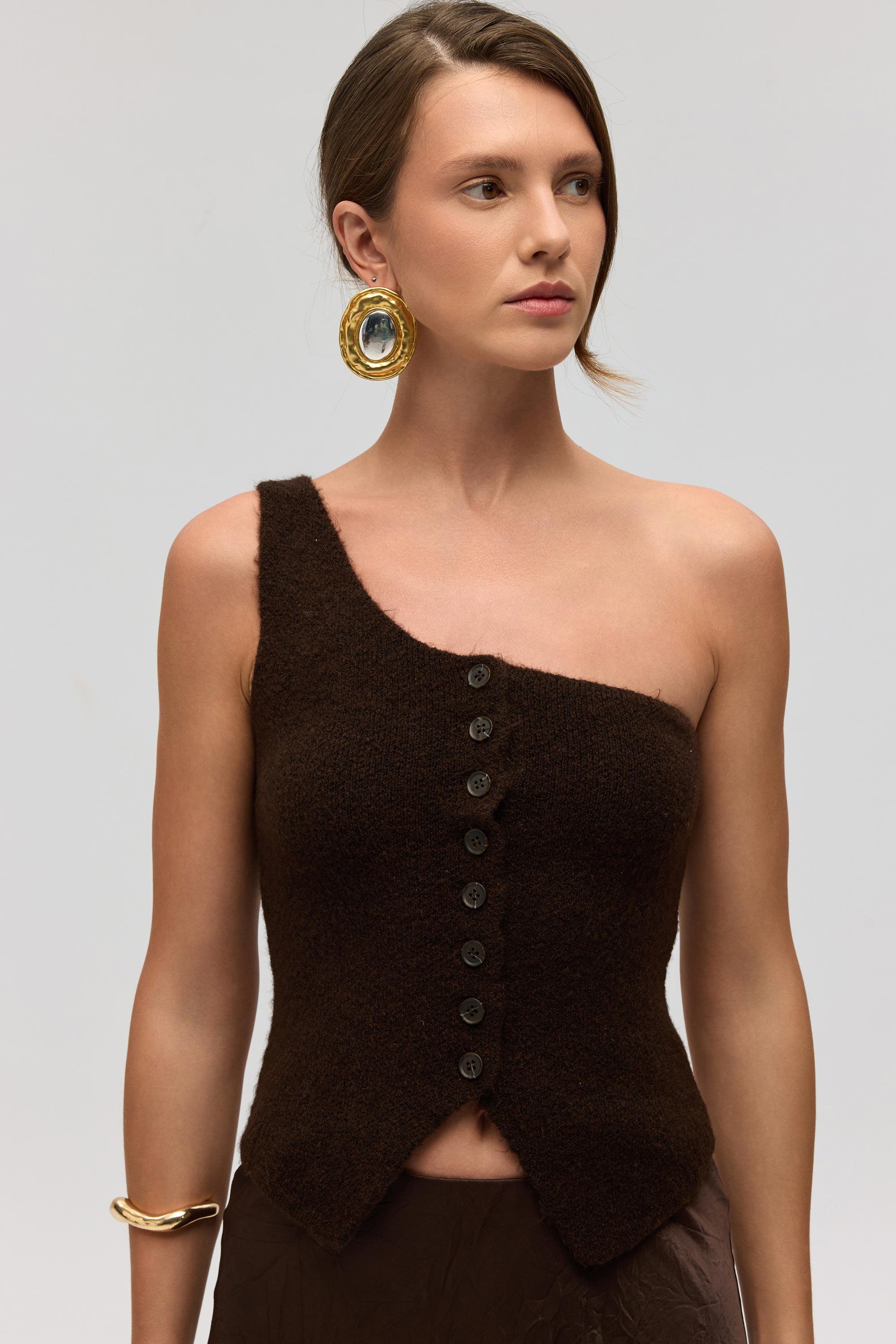Bedene göre şekil alan, önden düğmeli, asimetrik tek omuzlu, etek ucu üçgen detaylı triko crop.