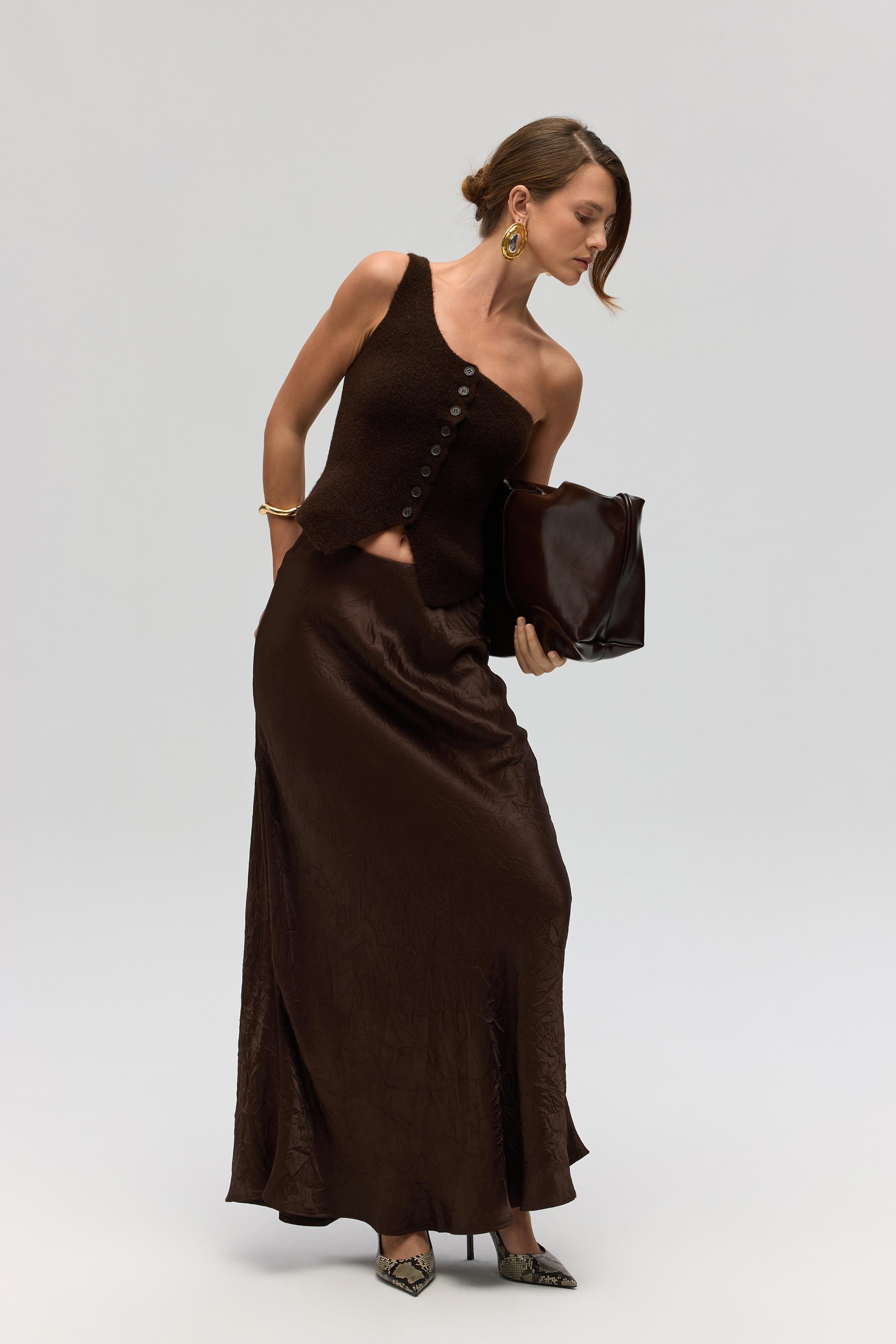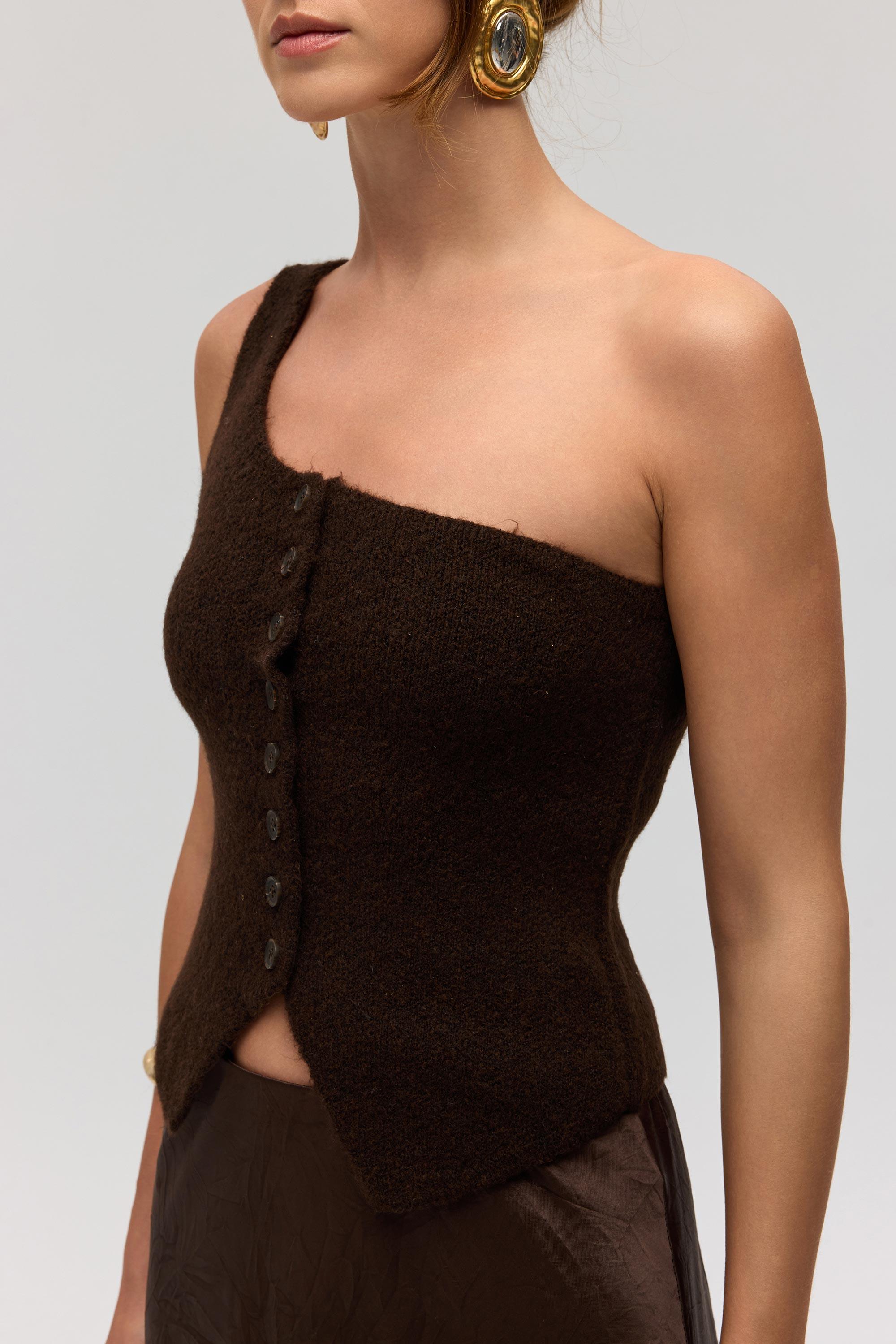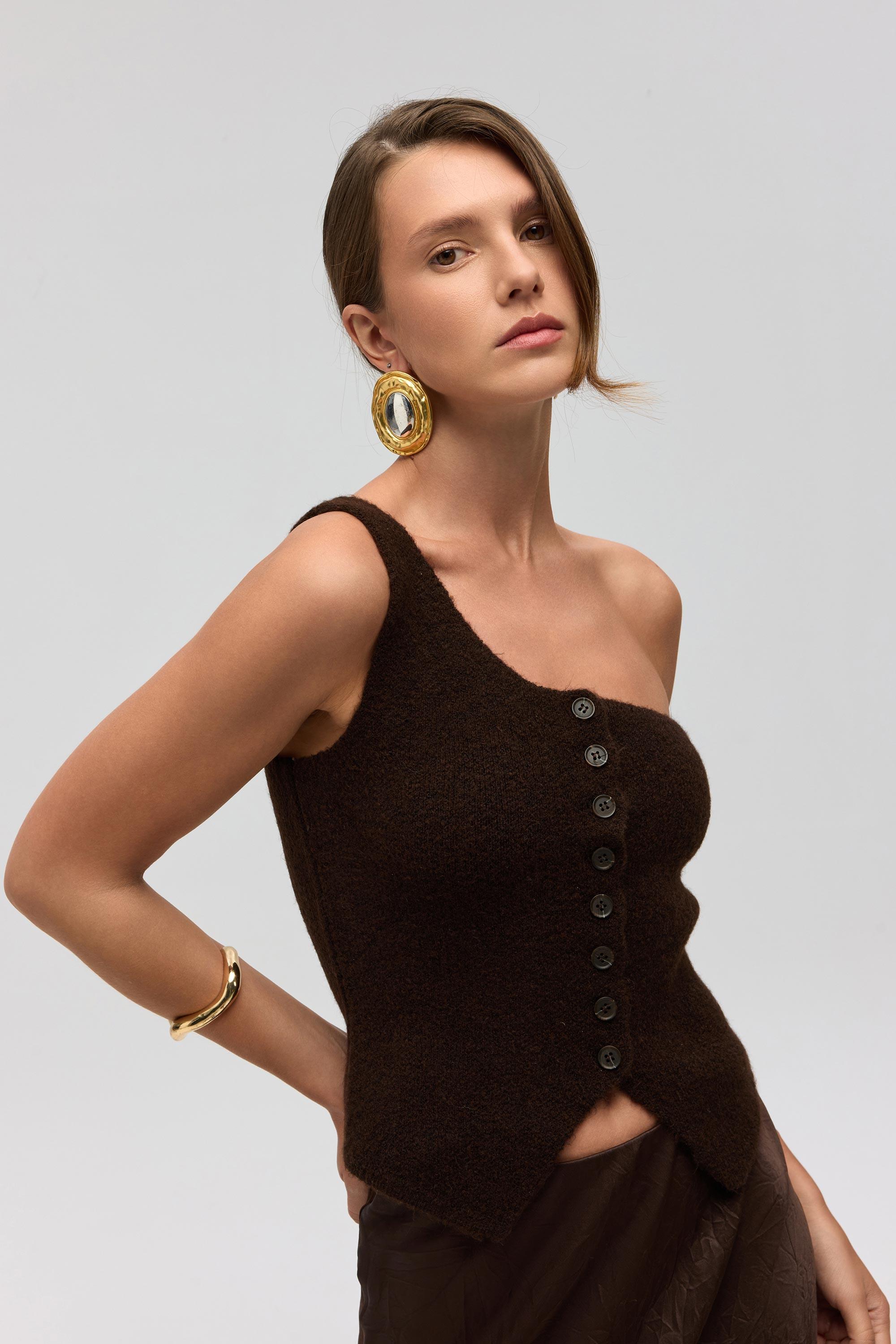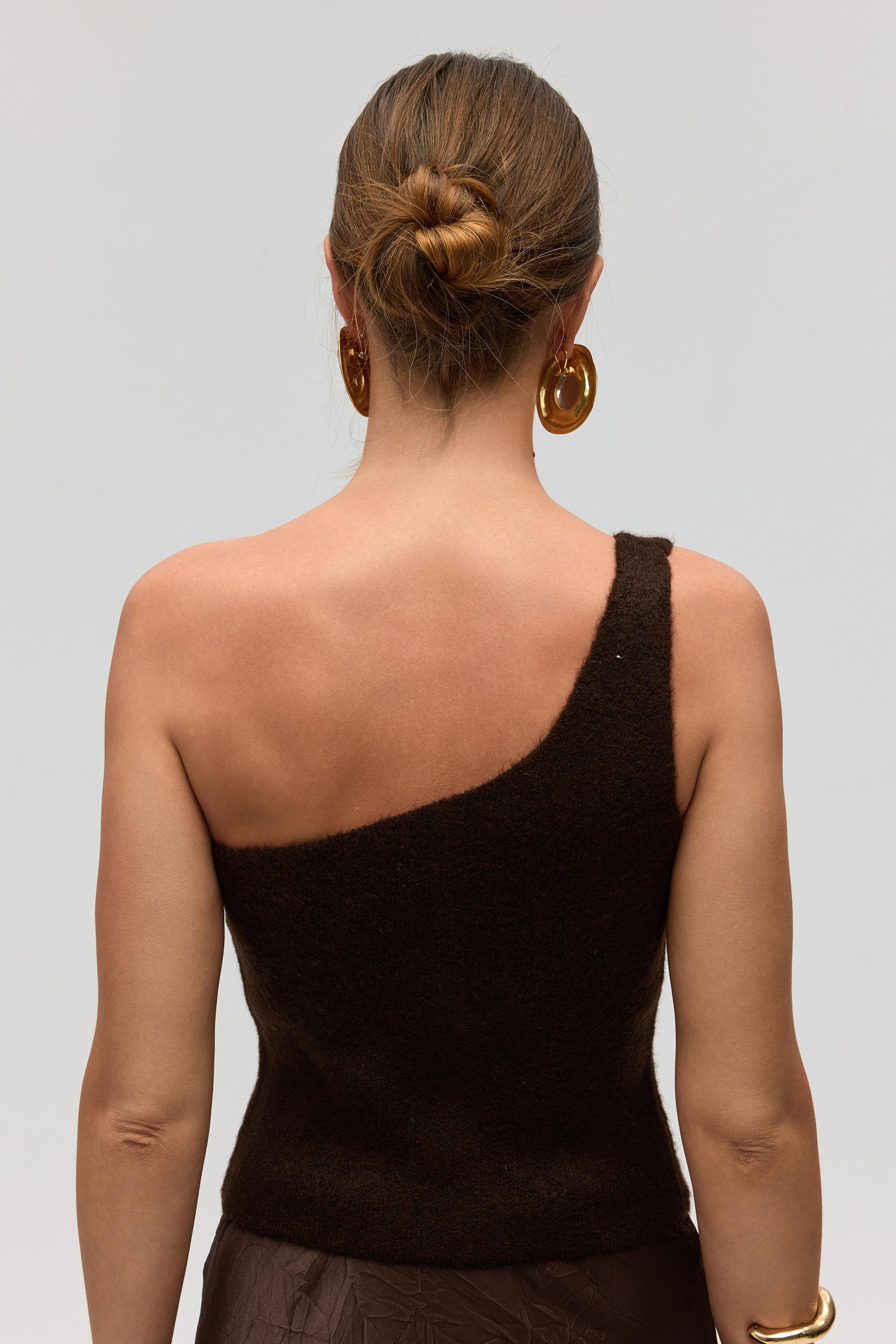 Elvar Tek Omuz Kahve Triko Crop