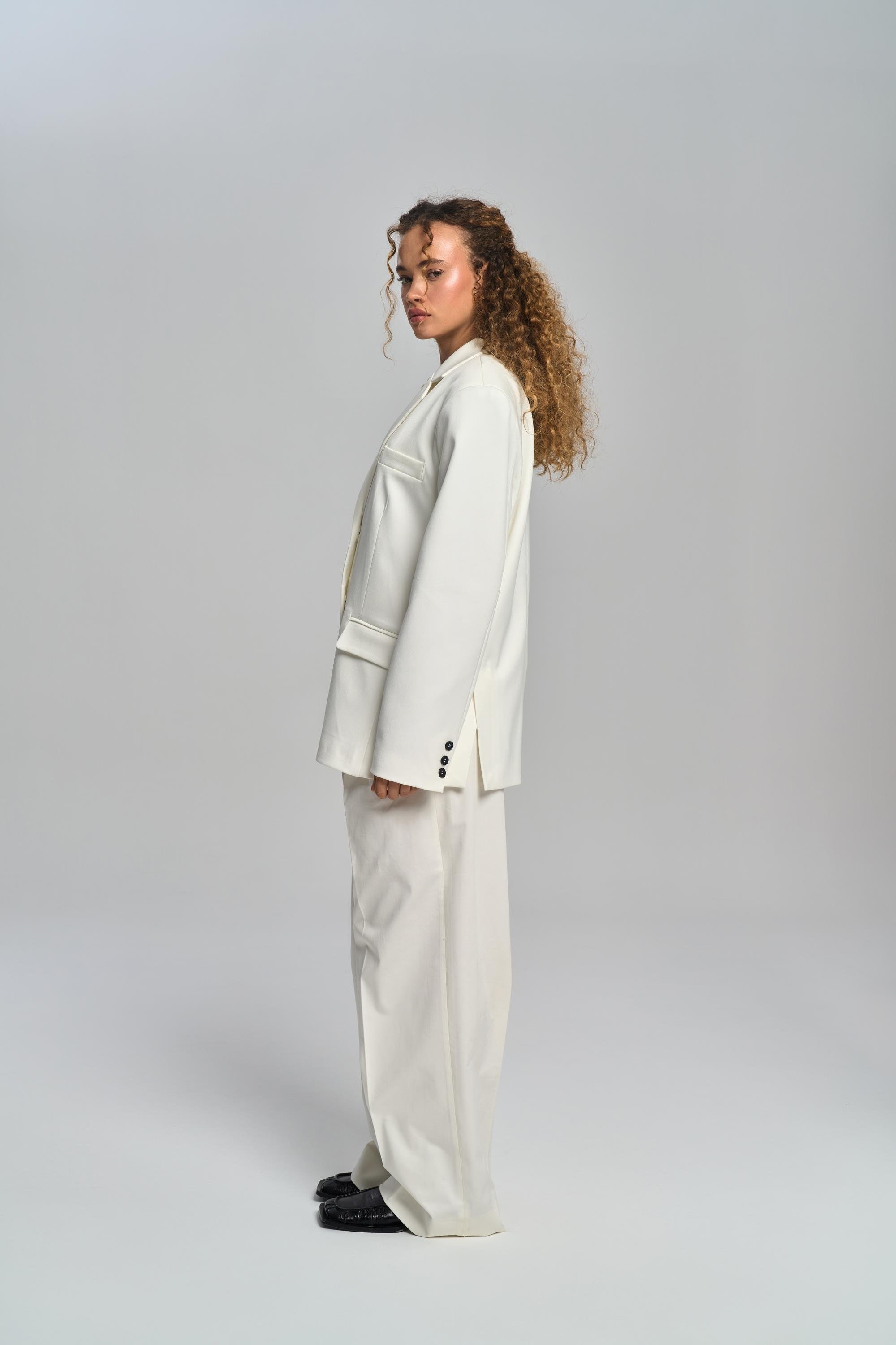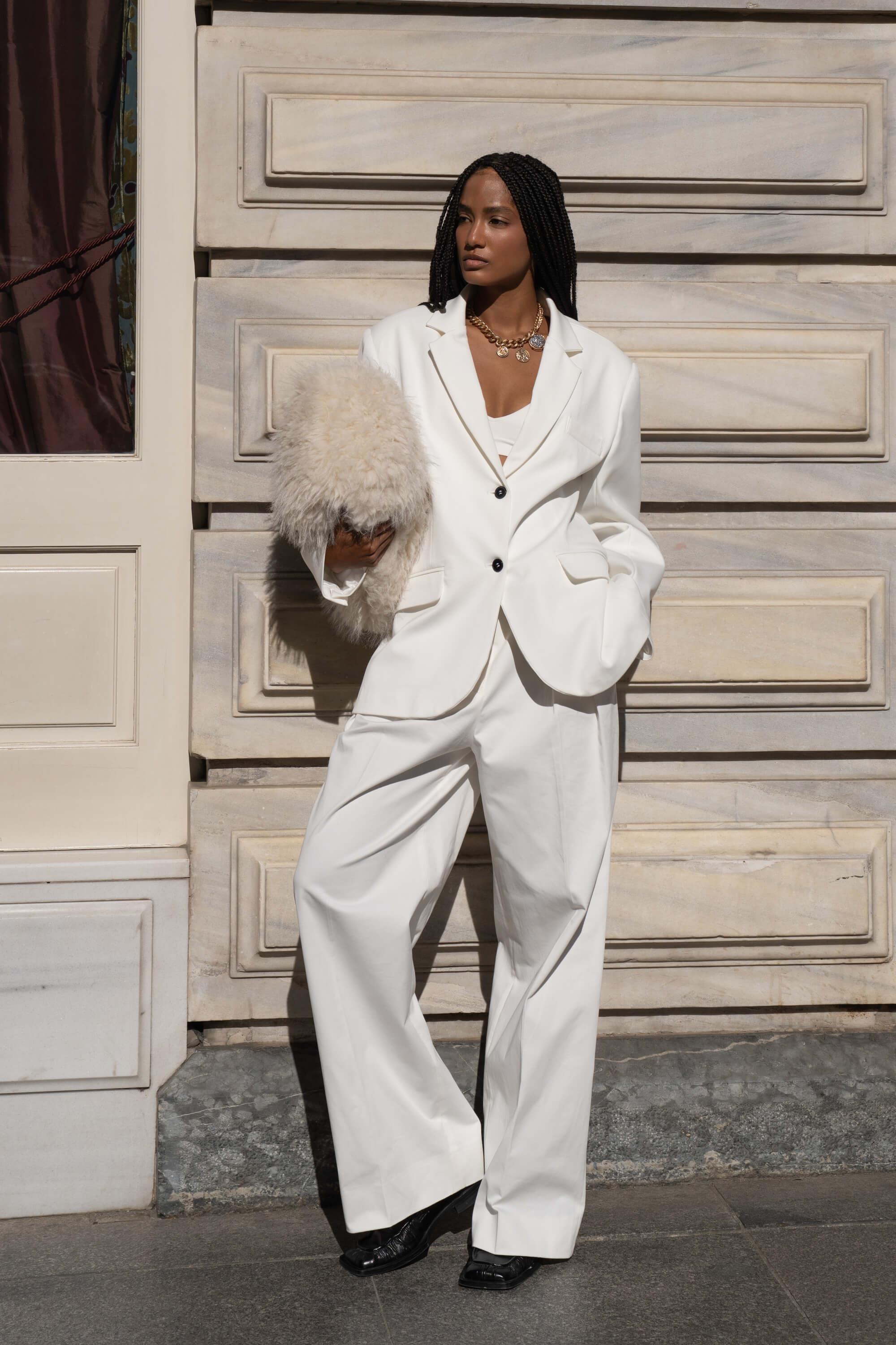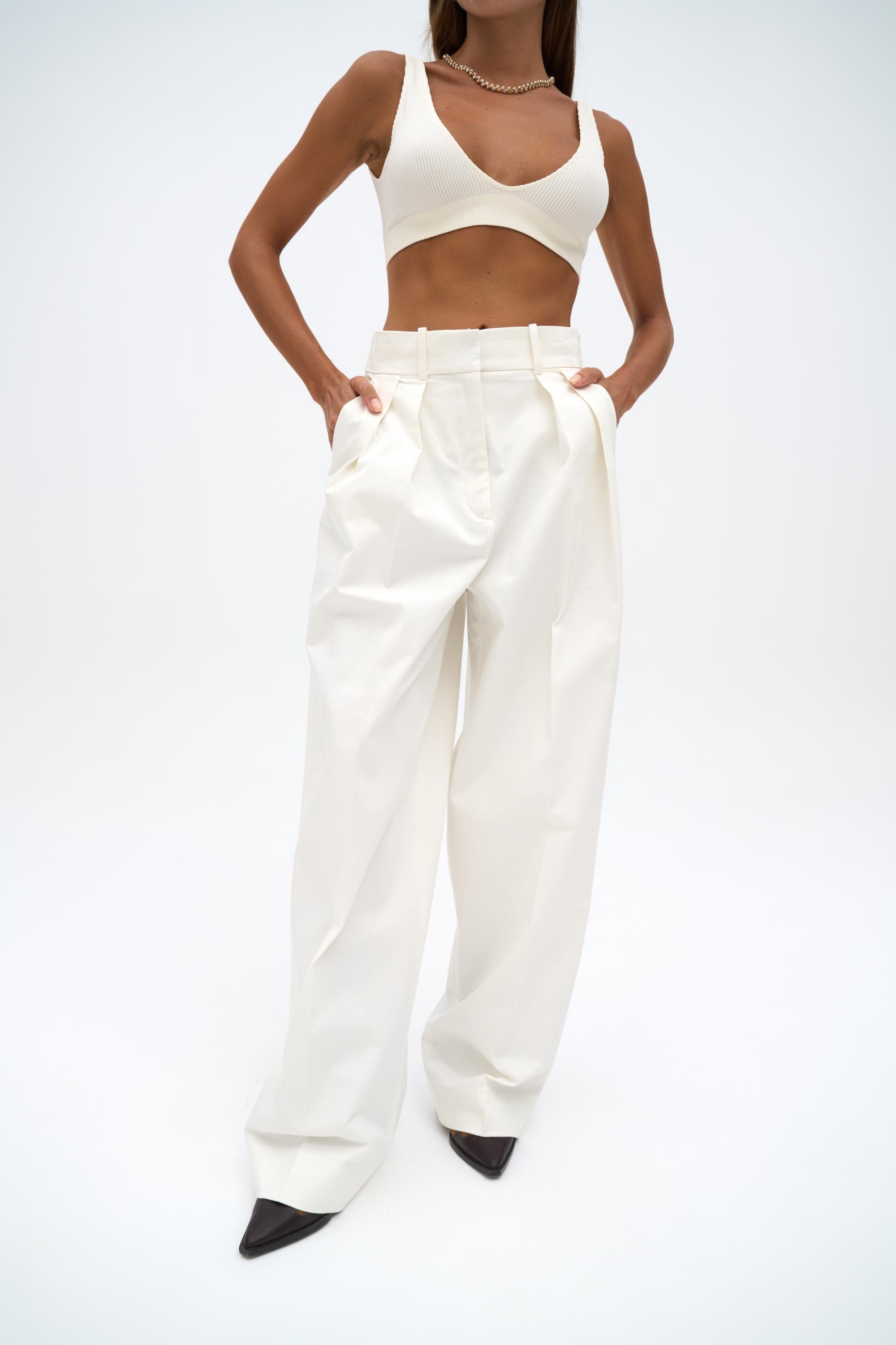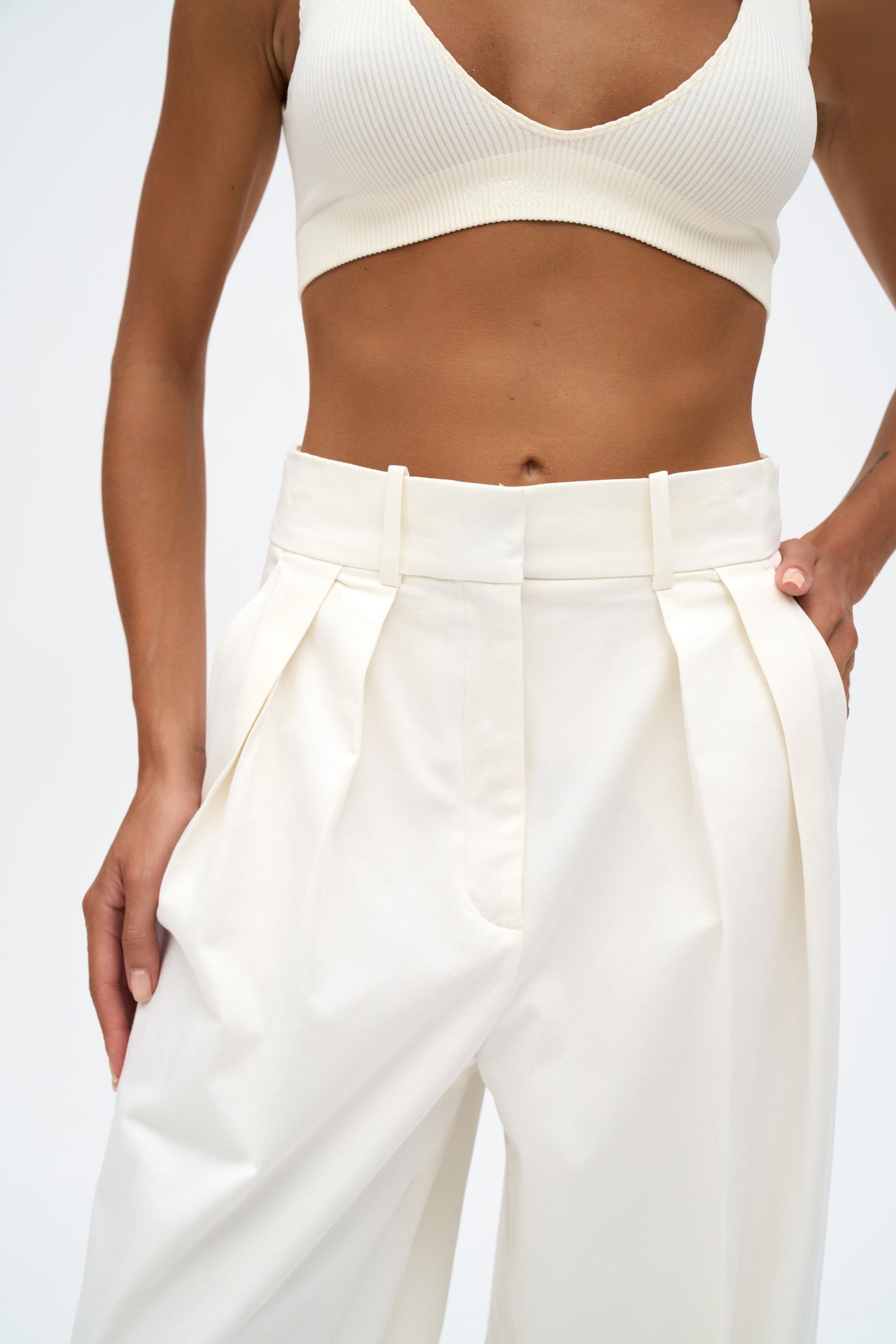 Çift pileli, köprülü, cepli rahat formda bol paça, likralı ve pamuk karışımlı pantolon.