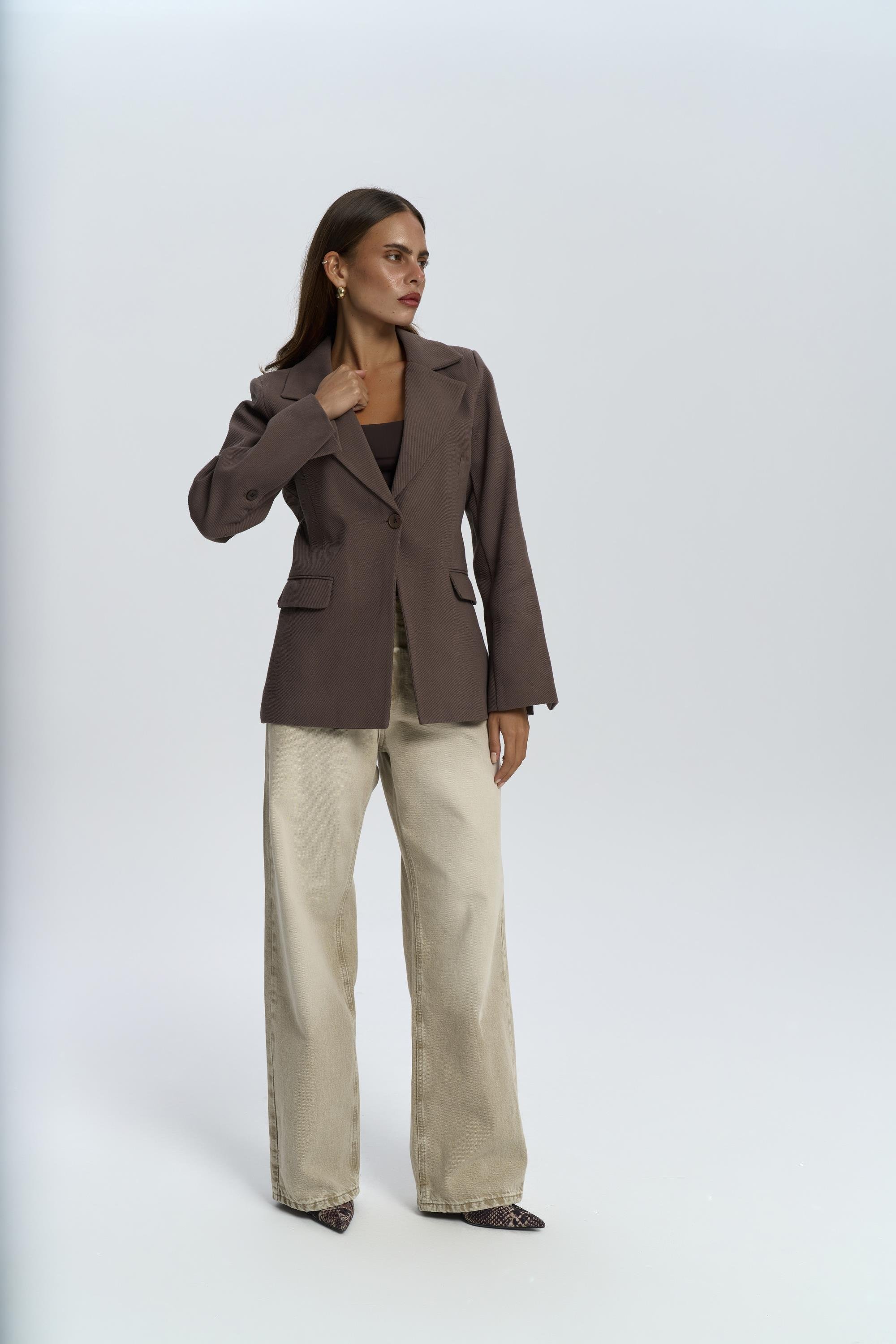 Vücuda oturan, etek ucu A-kesim blazer ceket. Önü düğme kapamalı ve kapaklı cepli. Vatkalı, uzun kollu özel tasarım blazer.
