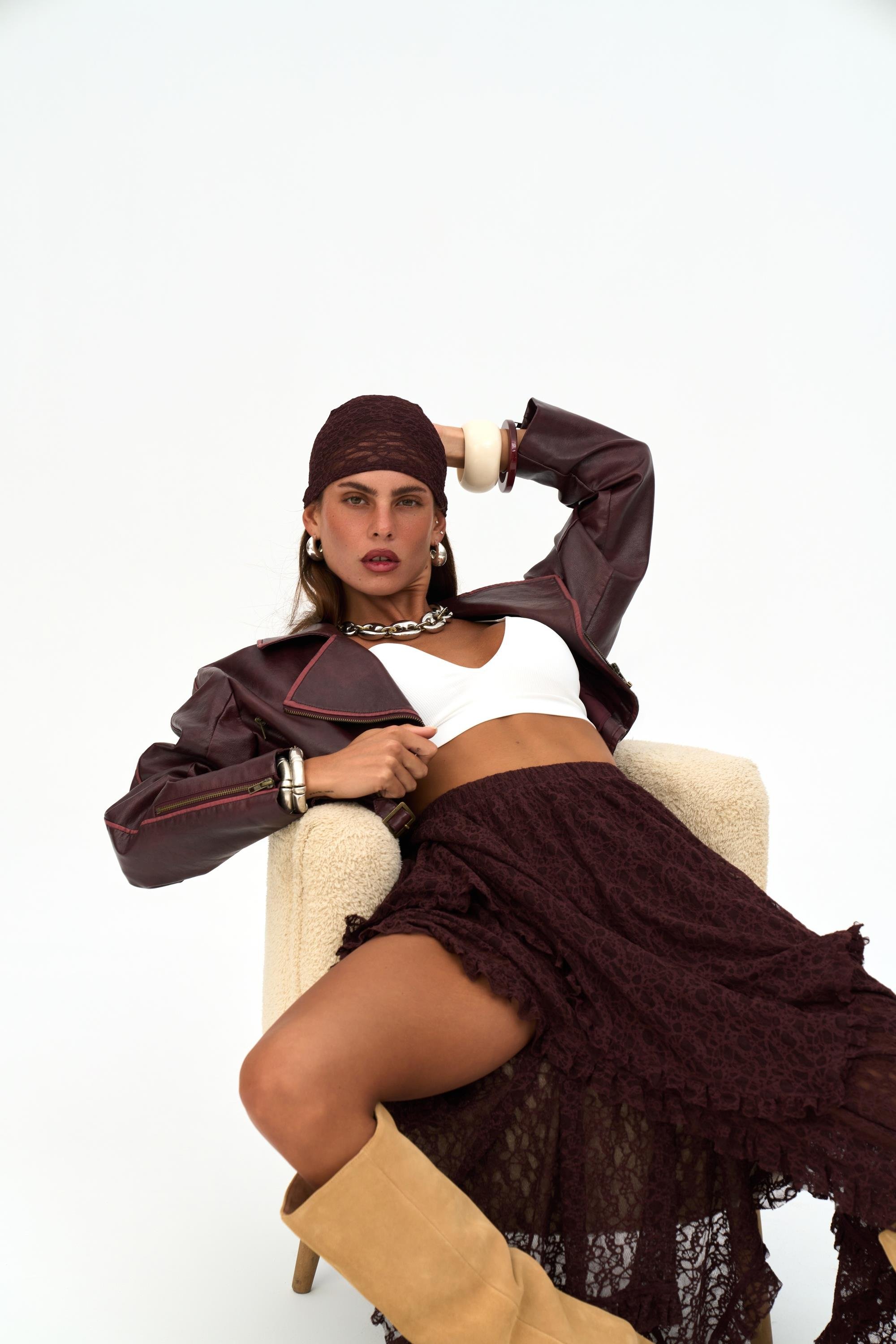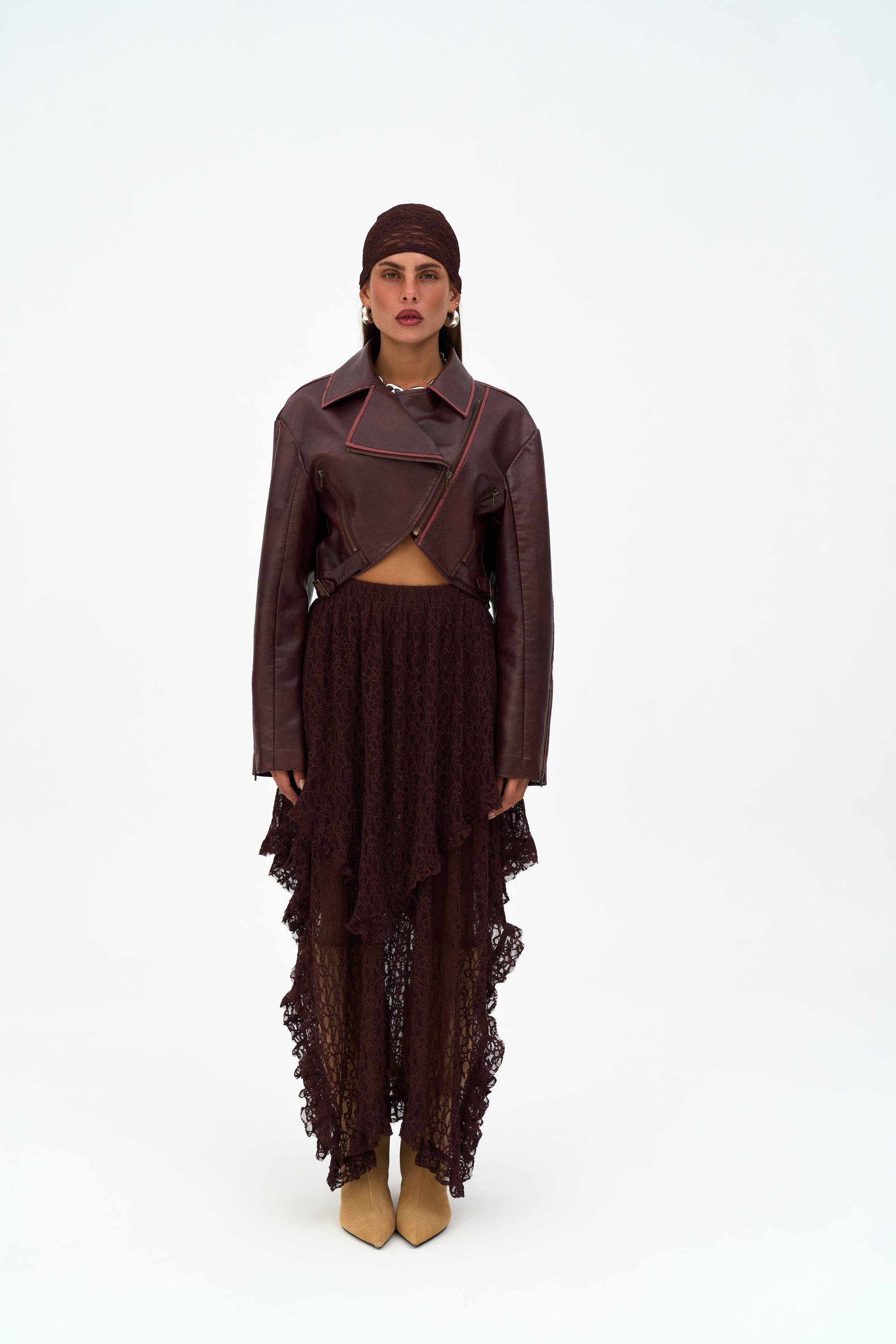 Hafif bedene oturan, düşük omuz formlu, asimetrik metal fermuar kapamalı, metal aksesuarlı kısa suni deri ceket.