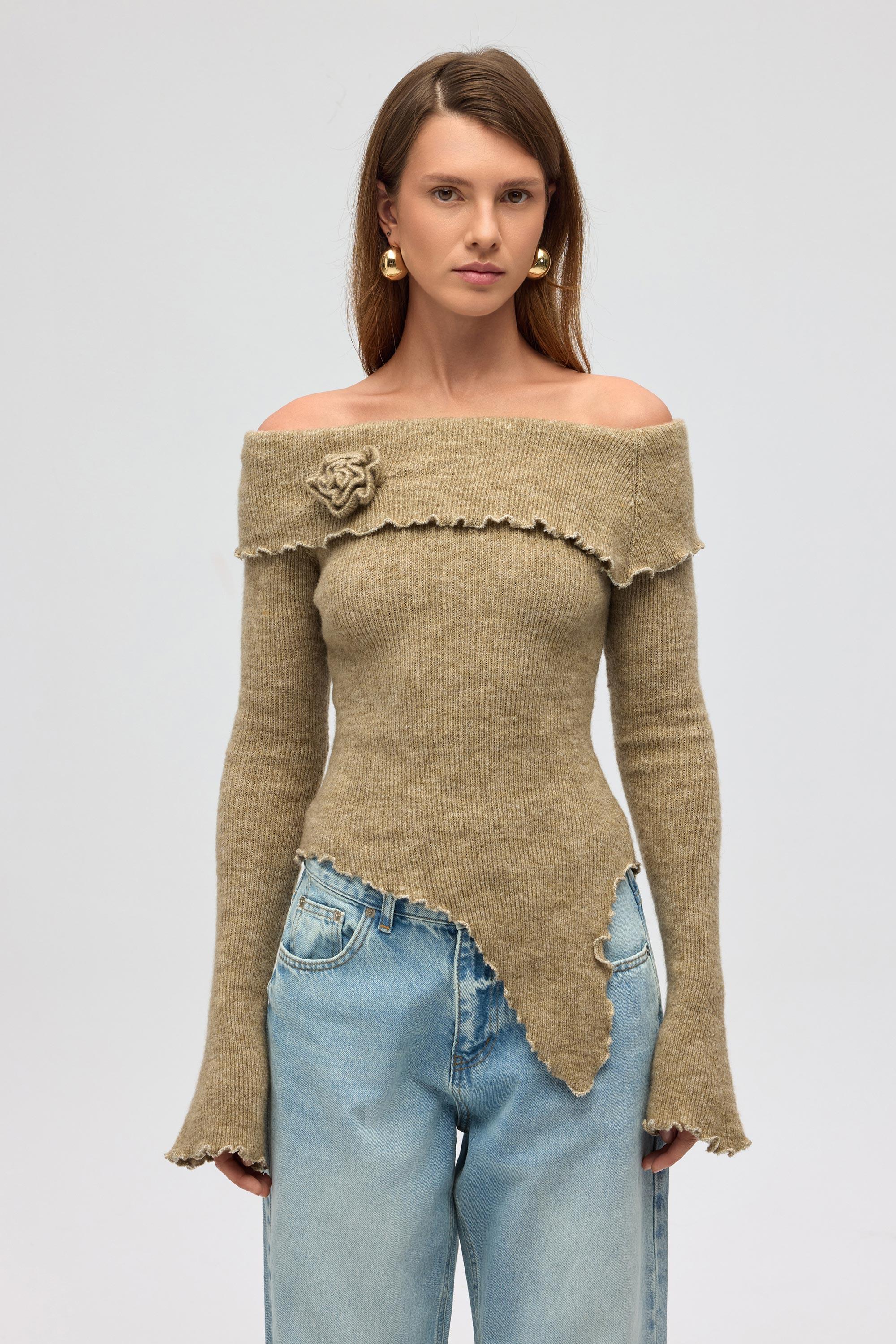 Bedene oturan formda, omzu açık, gül ve bürümcük detaylı, carmen yakalı, etek ucu asimetrik, uzun kollu triko kazak.