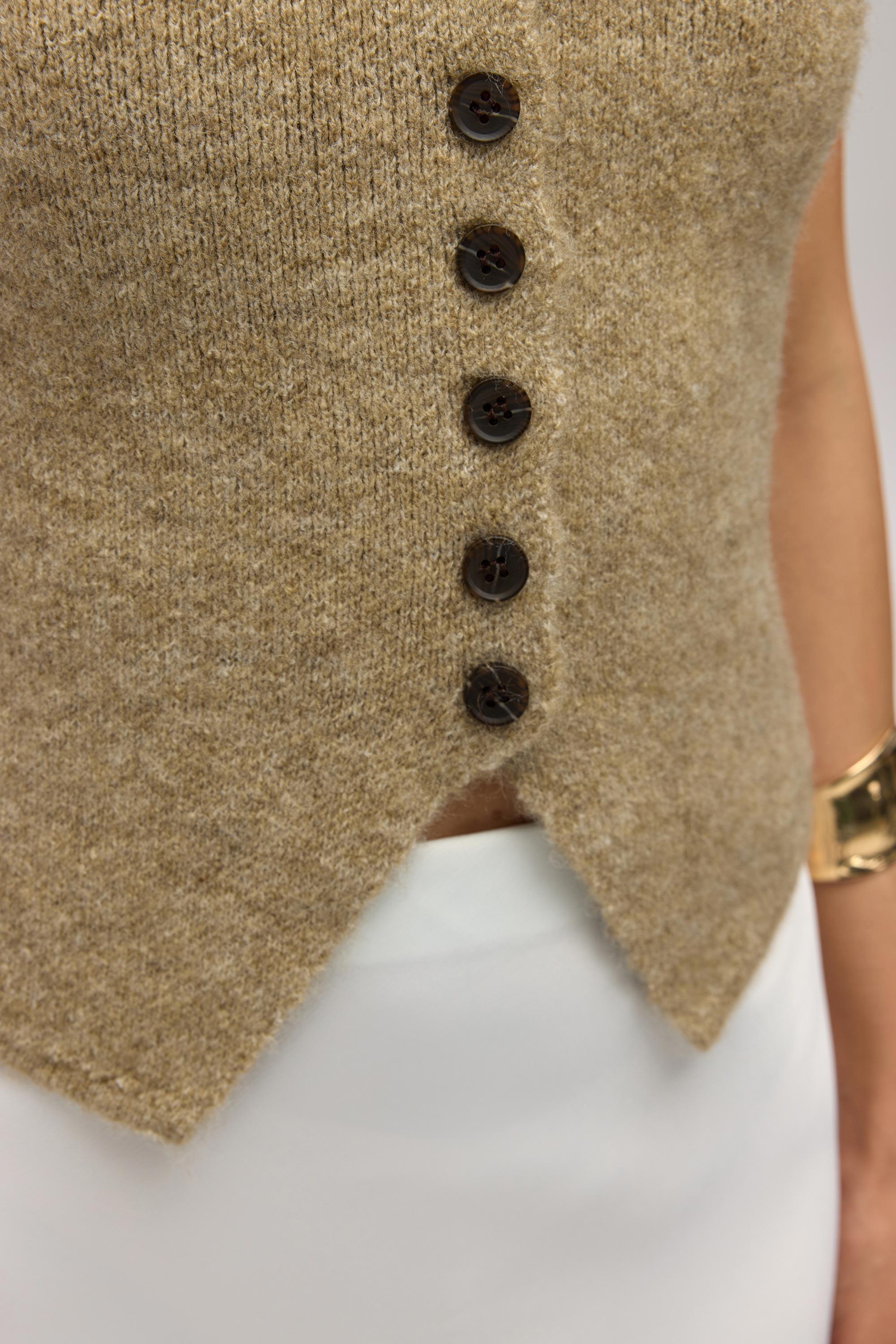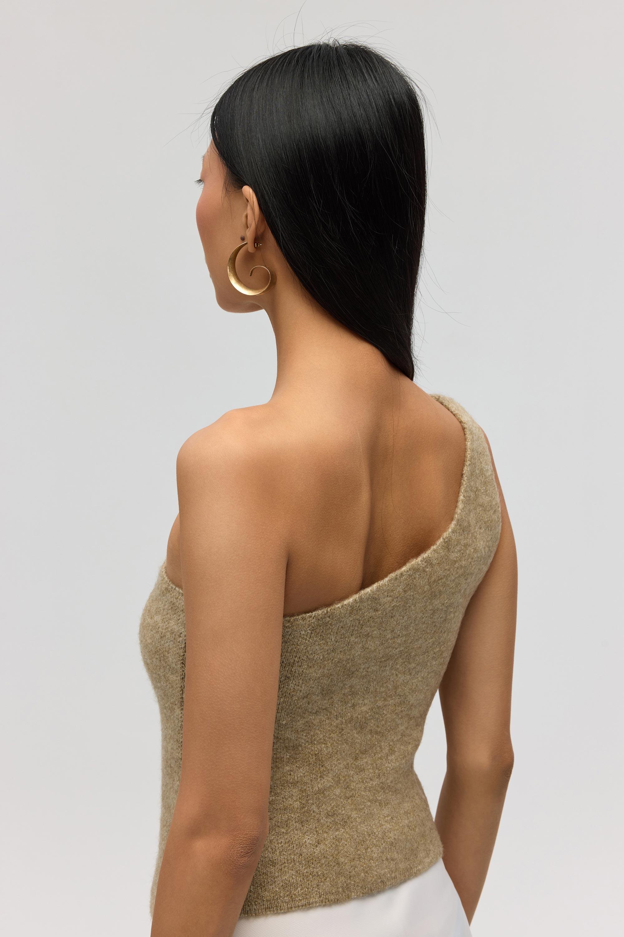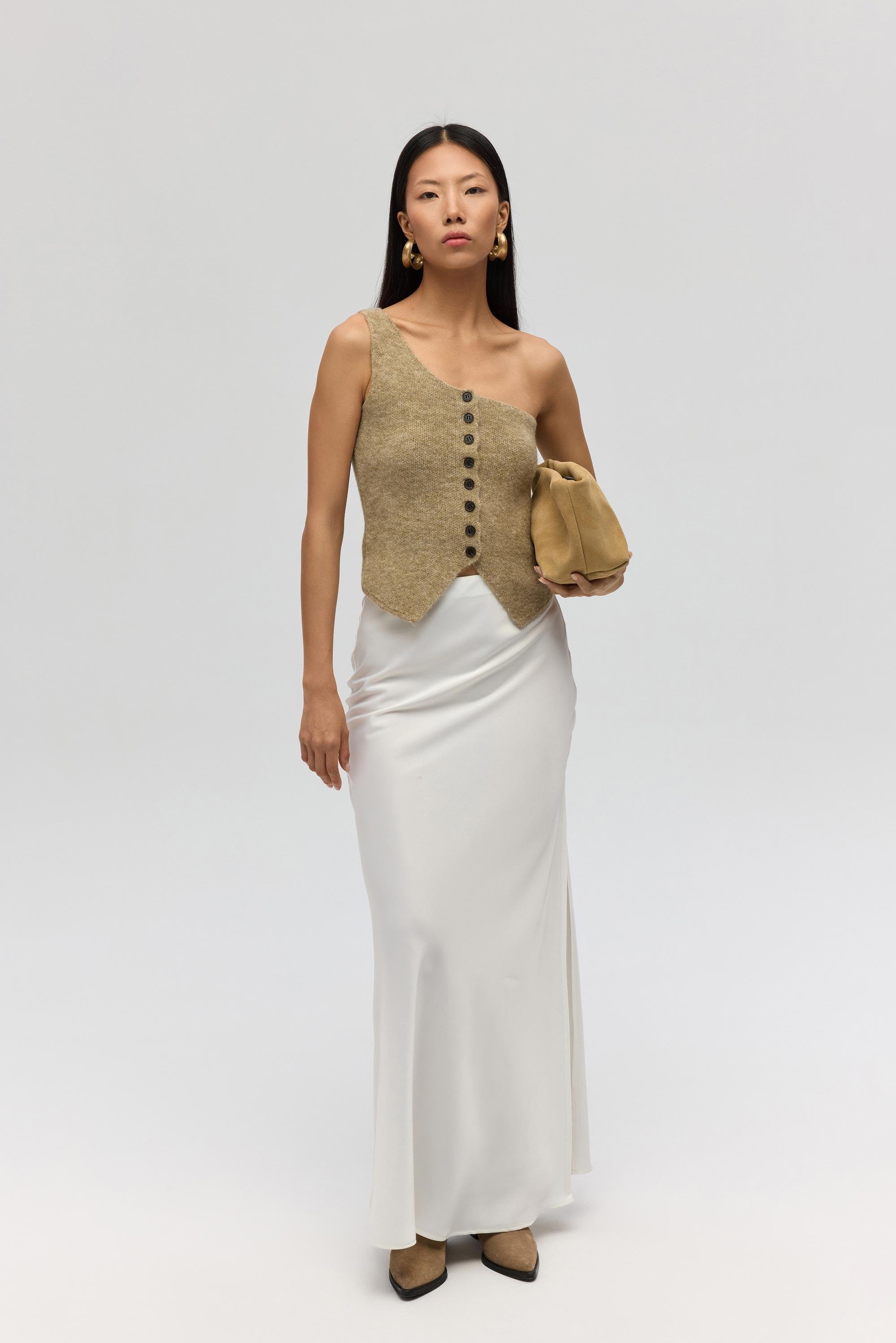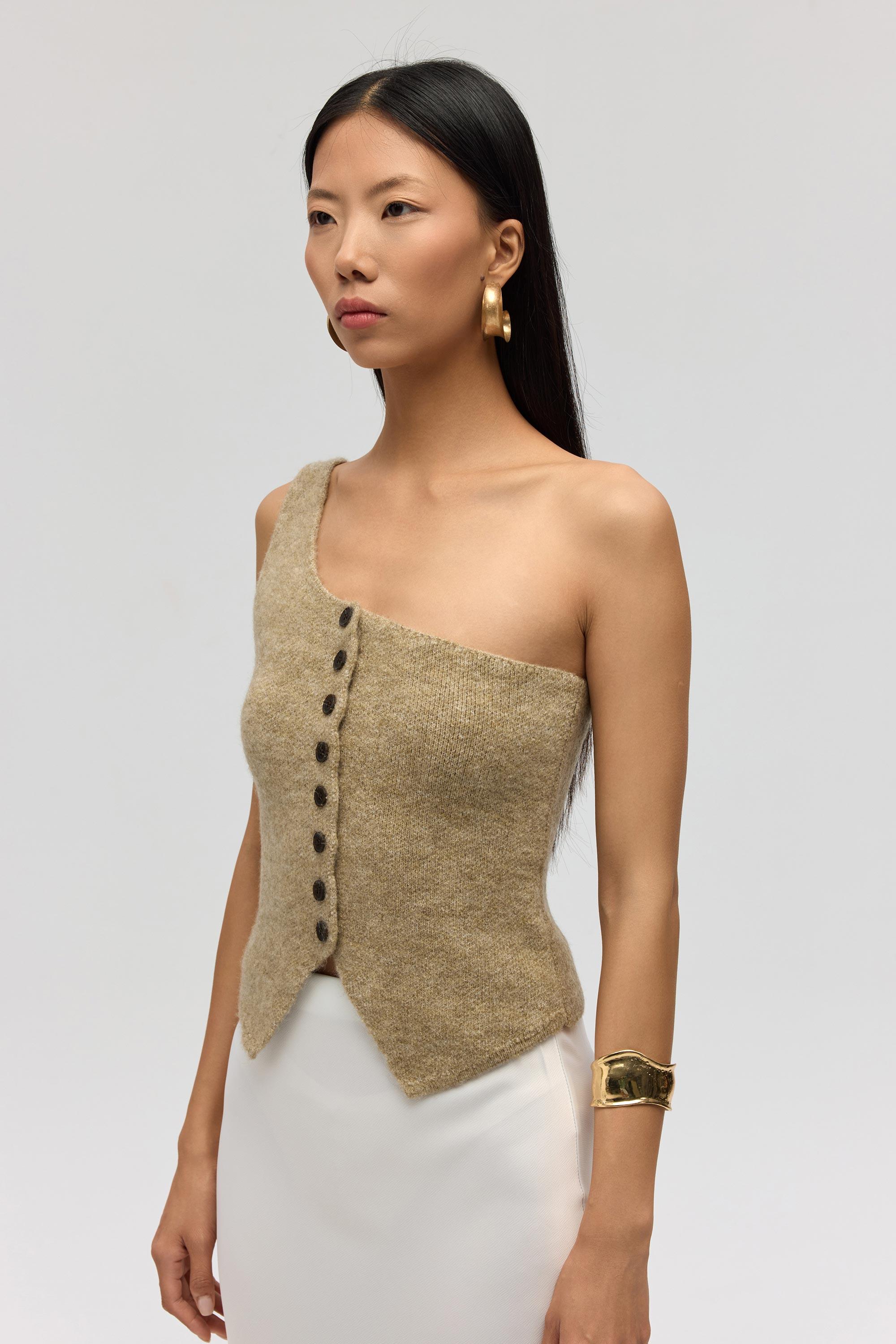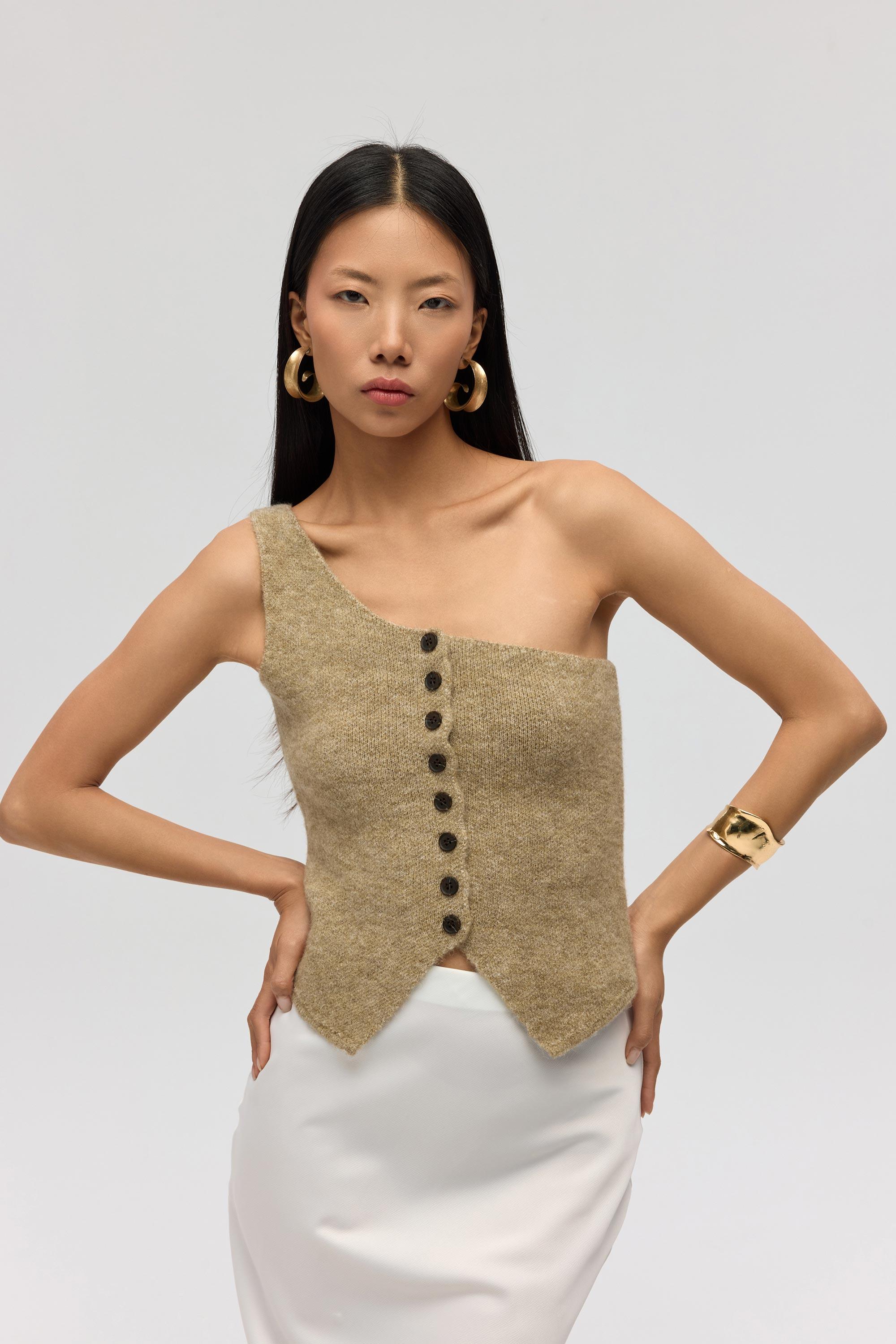 Bedene göre şekil alan, önden düğmeli, asimetrik tek omuzlu, etek ucu üçgen detaylı triko crop.