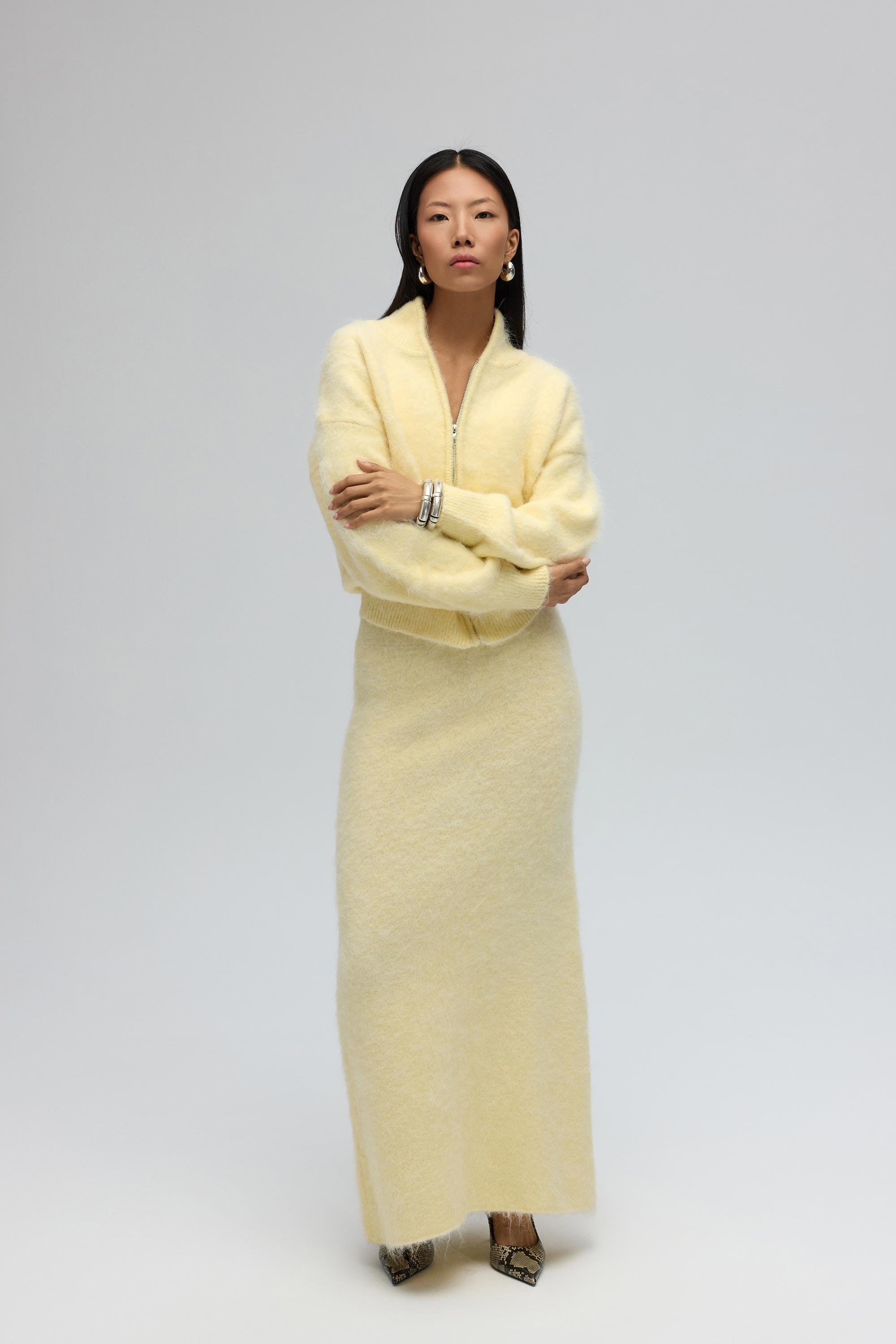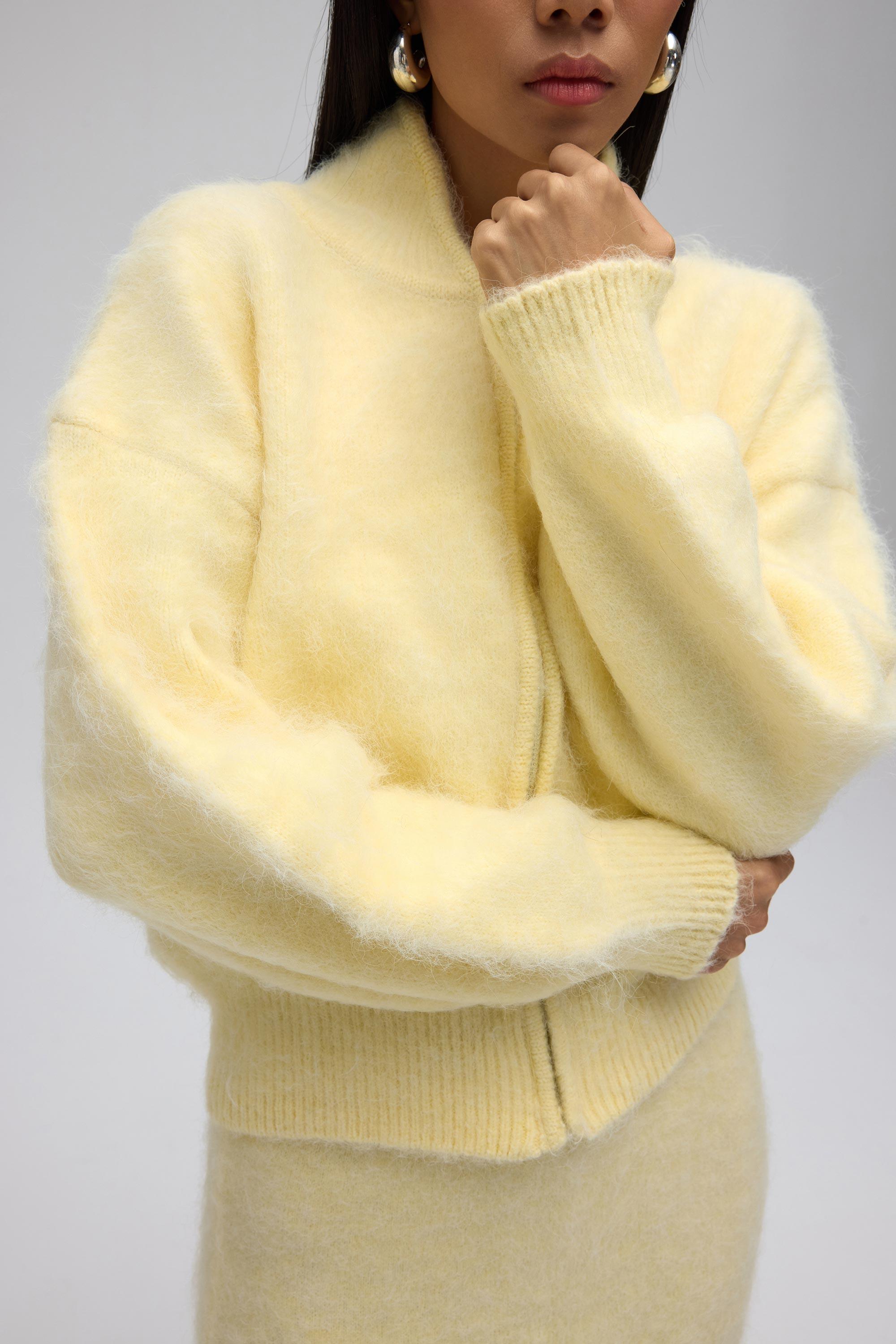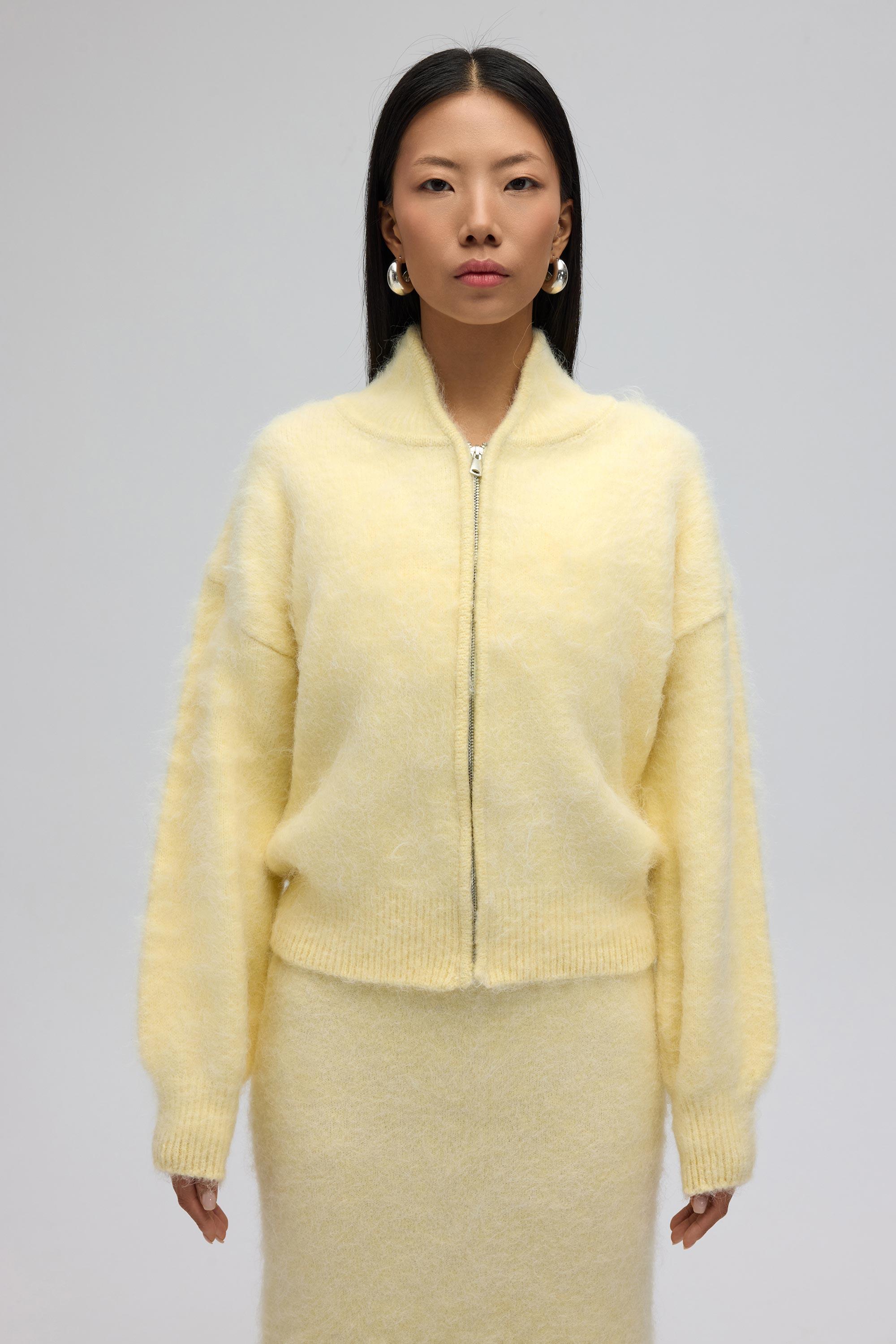 Rahat formda, metal fermuar detaylı, etek ucu lastik örgü triko hırka.