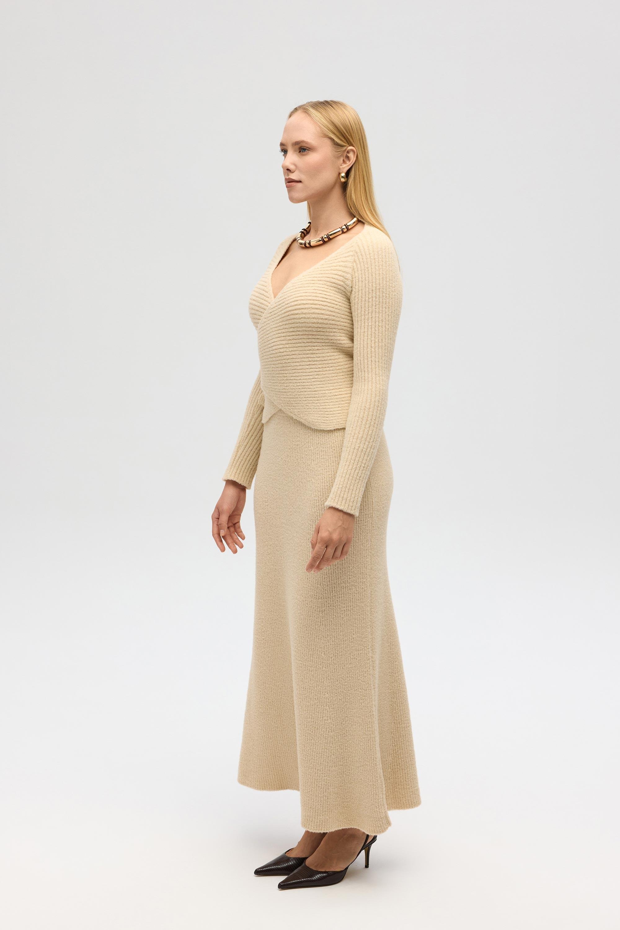 Bedeni saran kruvaze bağlamalı, uzun kollu triko ve rahat formda, beli lastik örgülü, maxi triko etekli takım.