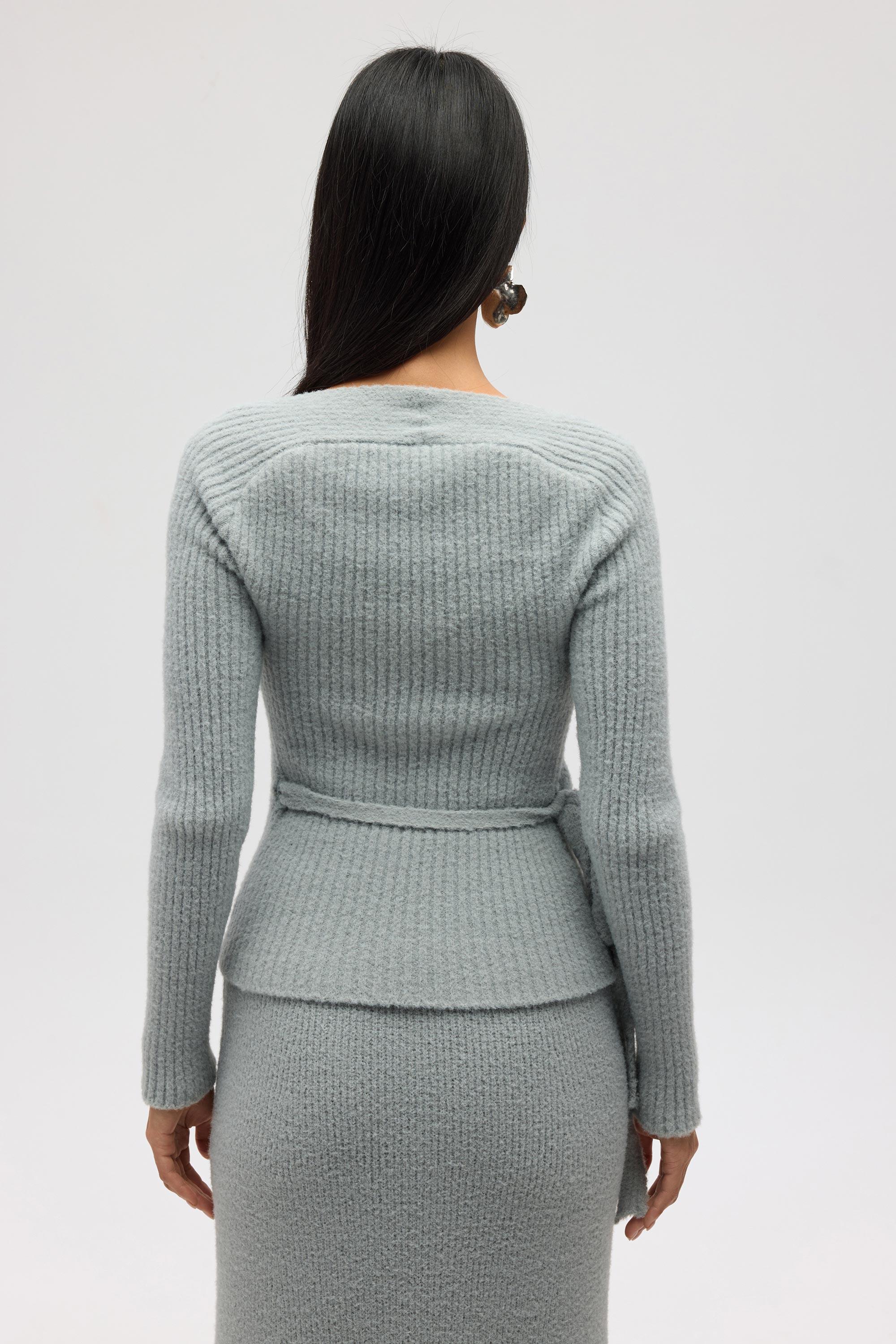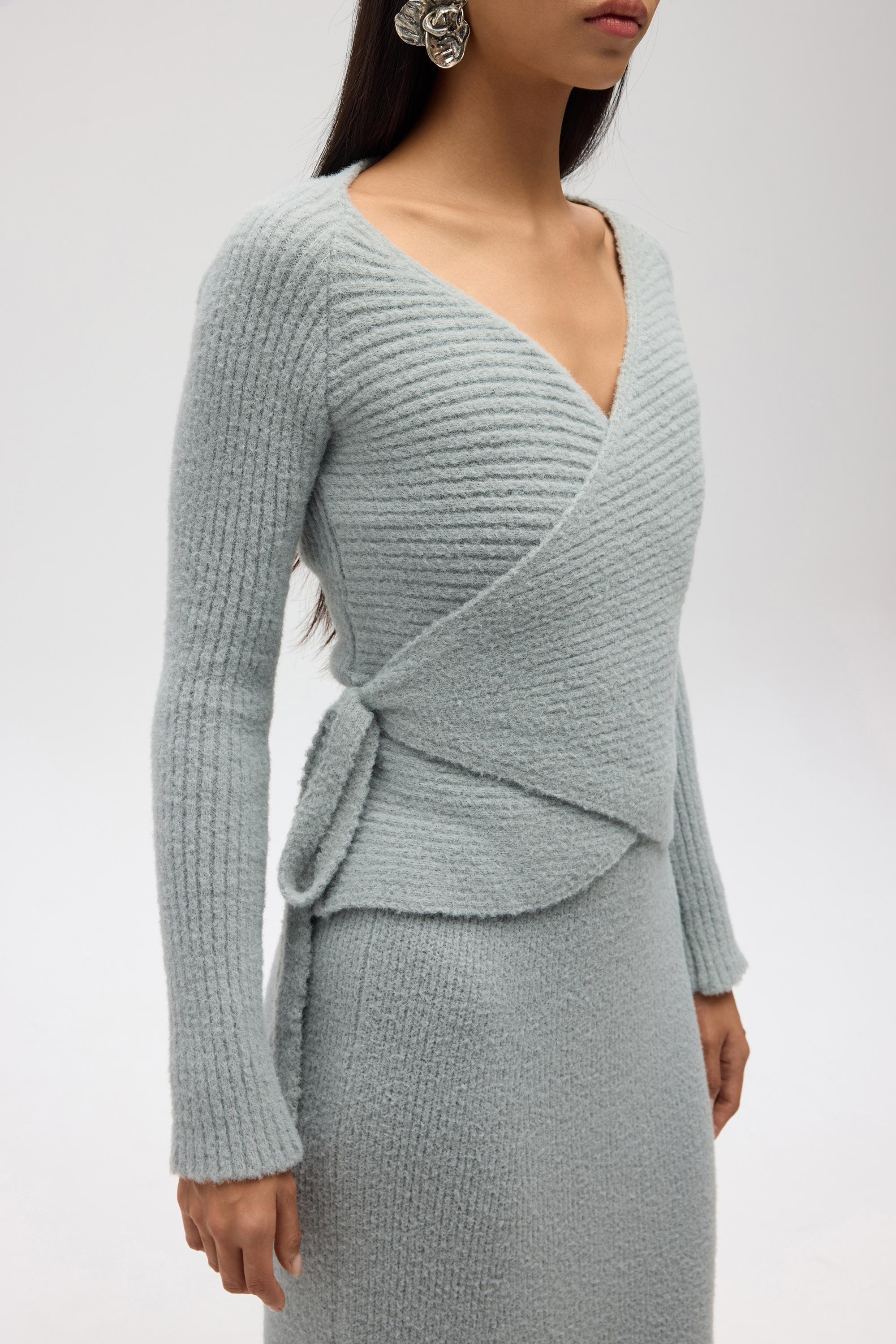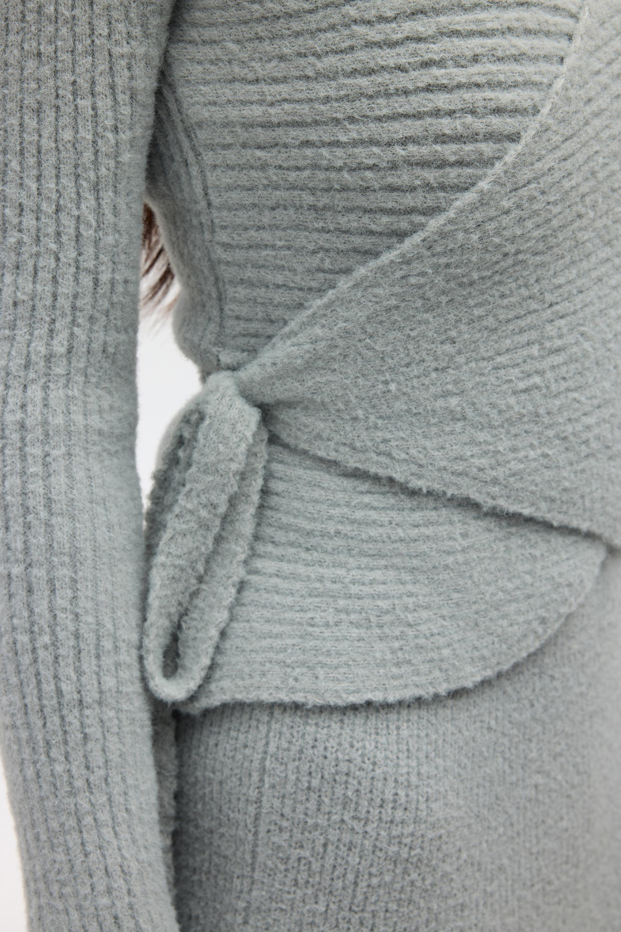 Bedeni saran kruvaze bağlamalı, uzun kollu triko ve rahat formda, beli lastik örgülü, maxi triko etekli takım.
