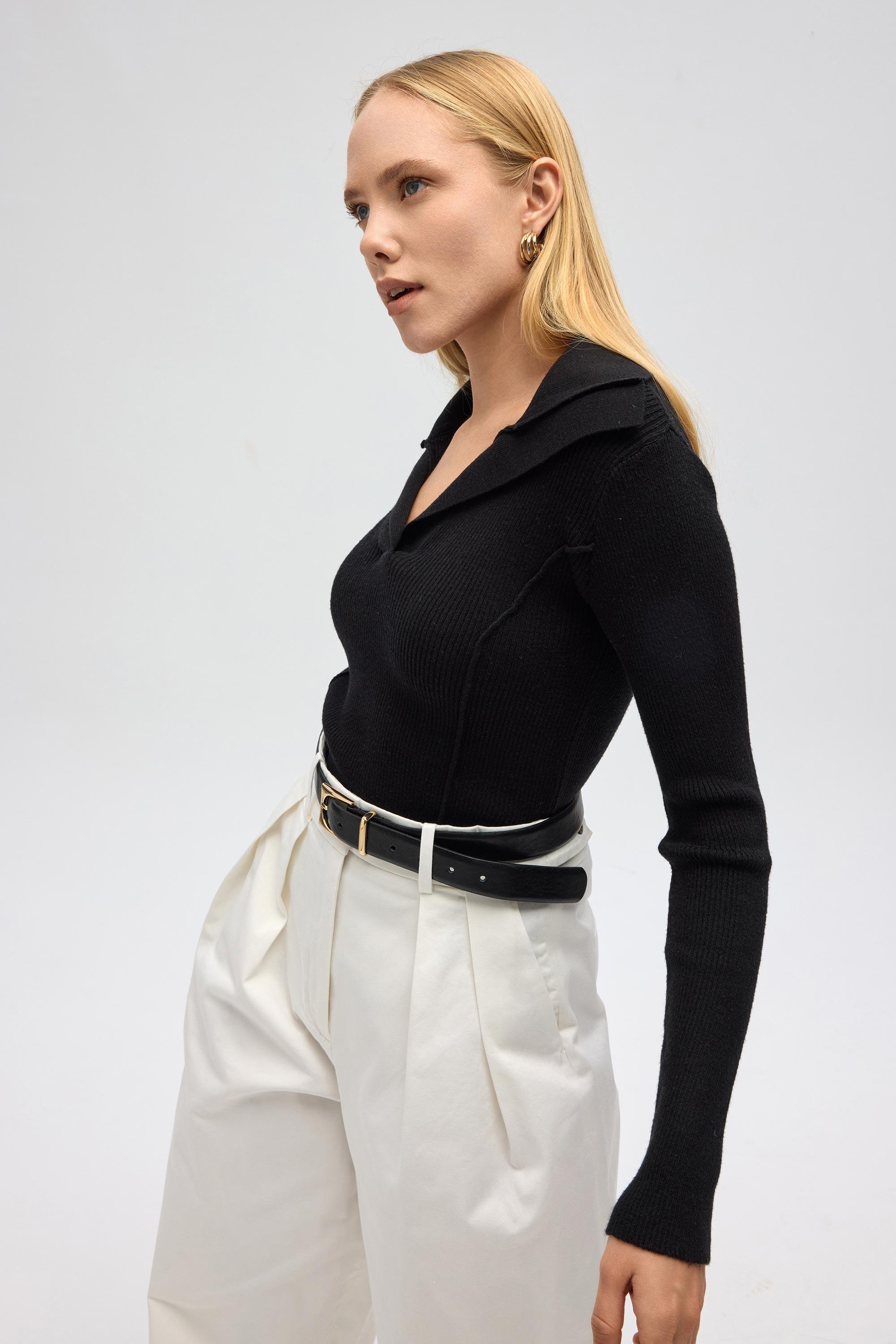 Bedene oturan formda, polo yakalı, kup detaylı, uzun kollu triko kazak.