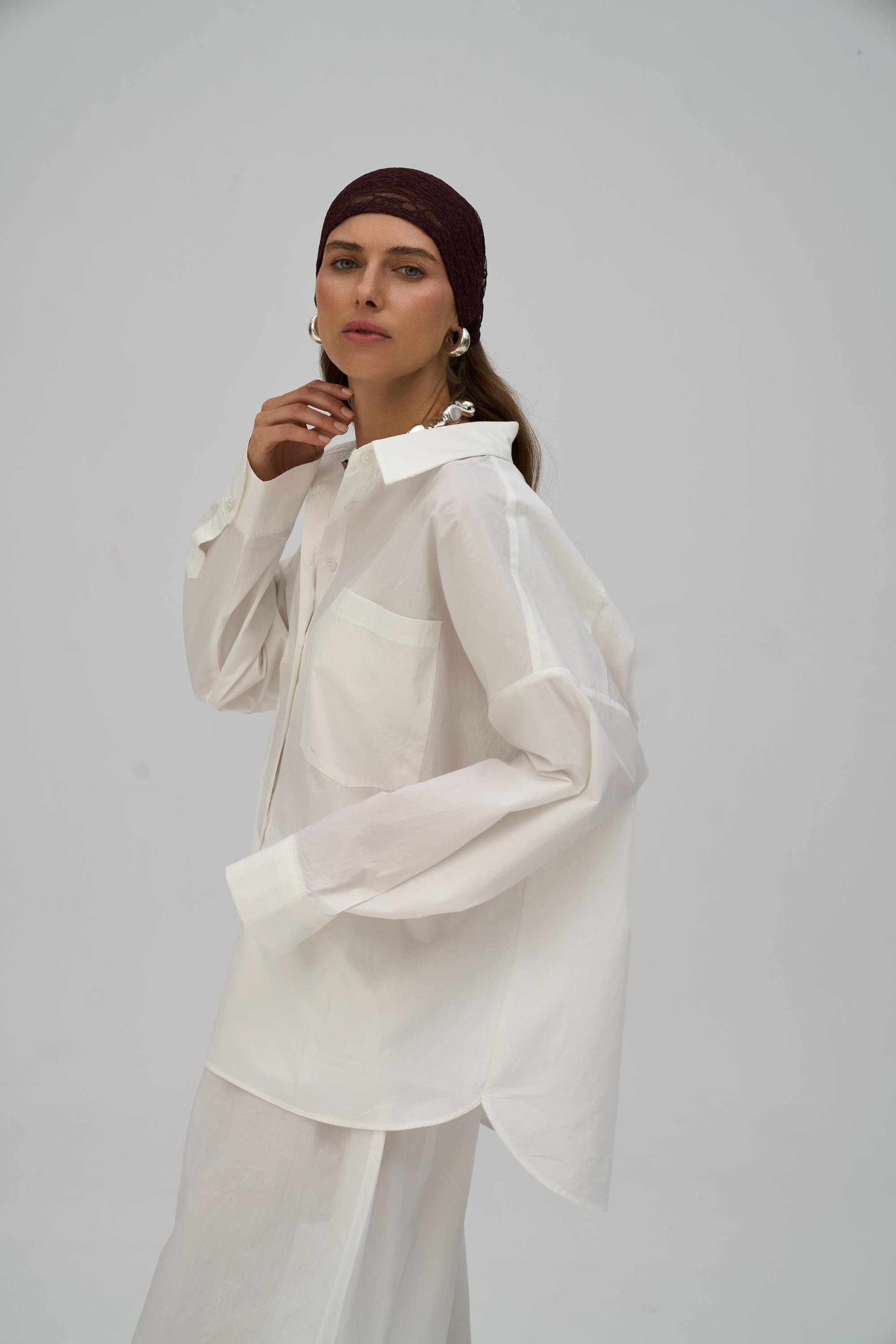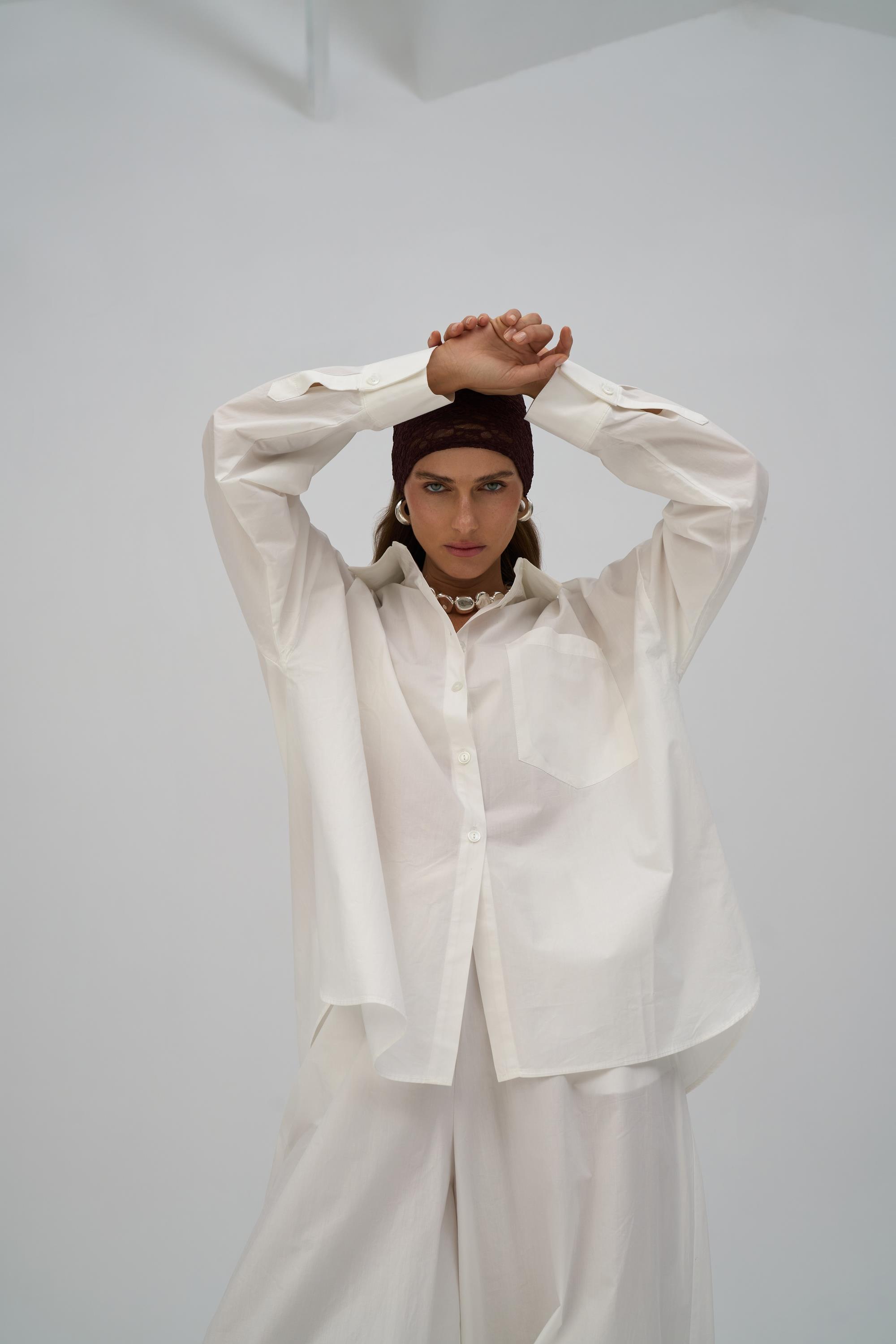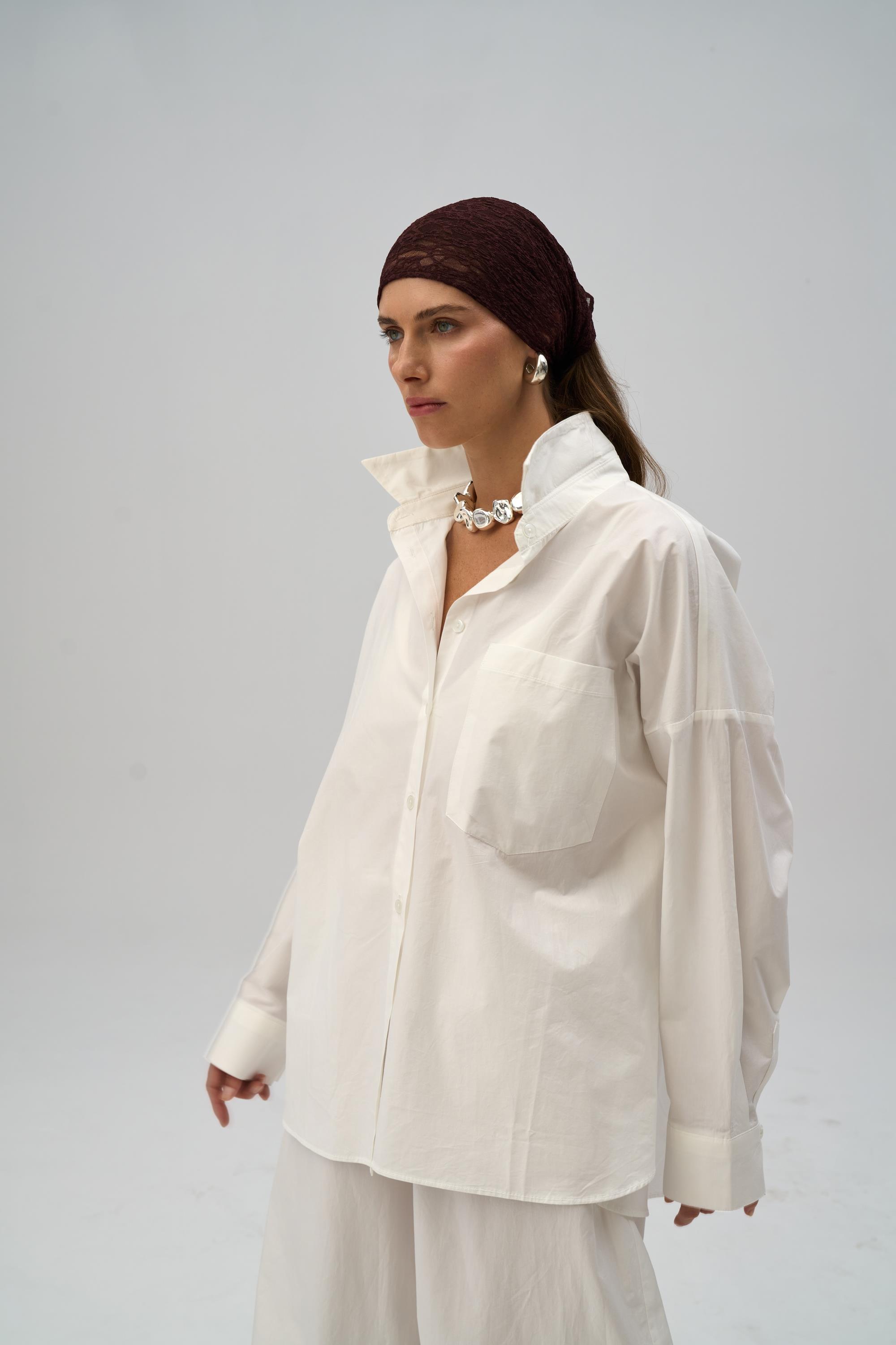 Pamuklu iplikten üretilmiş oversize gömlek. Yaka detaylı ve manşetli uzun kollu.