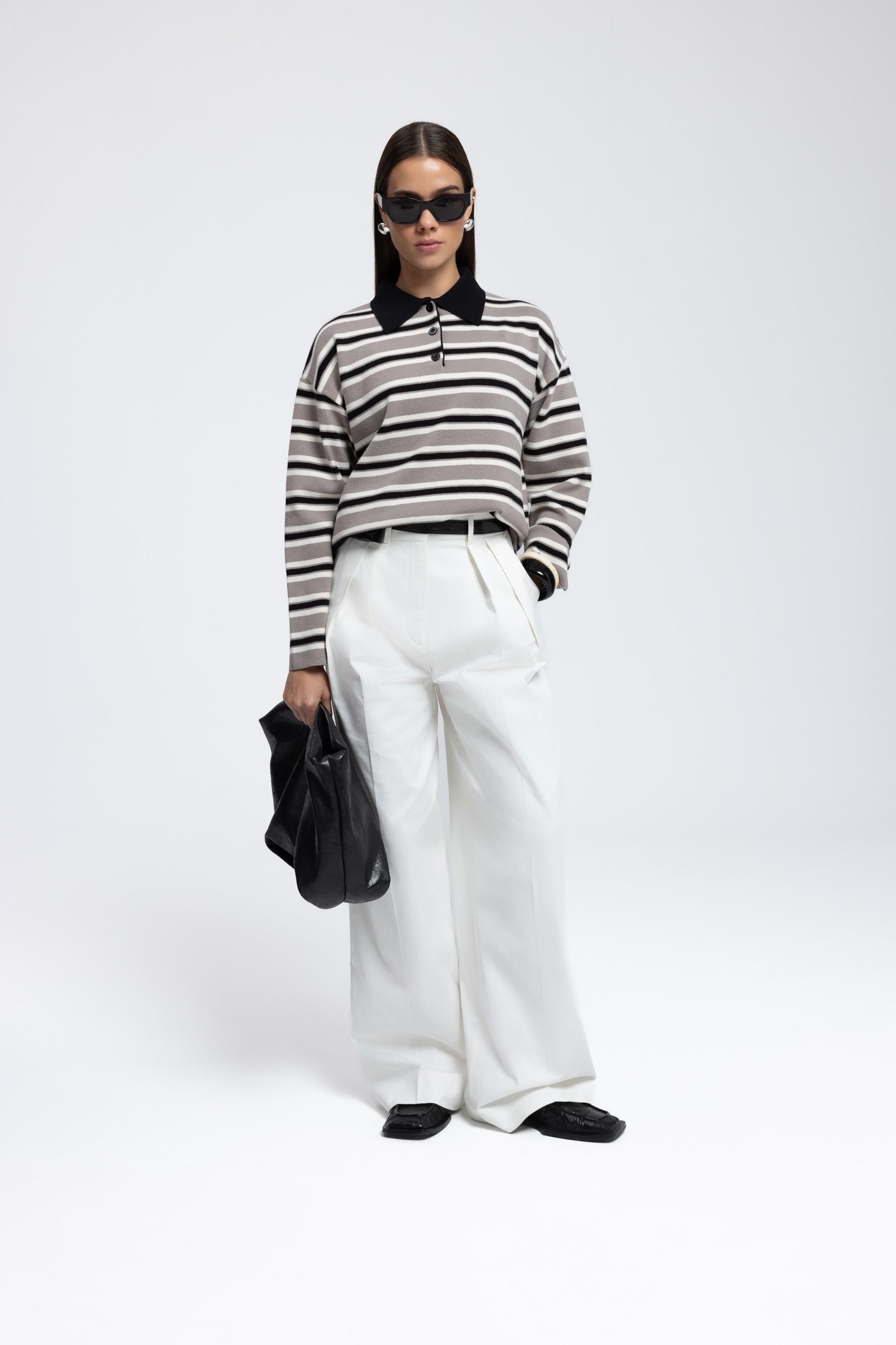 Rahat formda, düğmeli, polo yaka. Uzun kollu ringelli triko kazak.