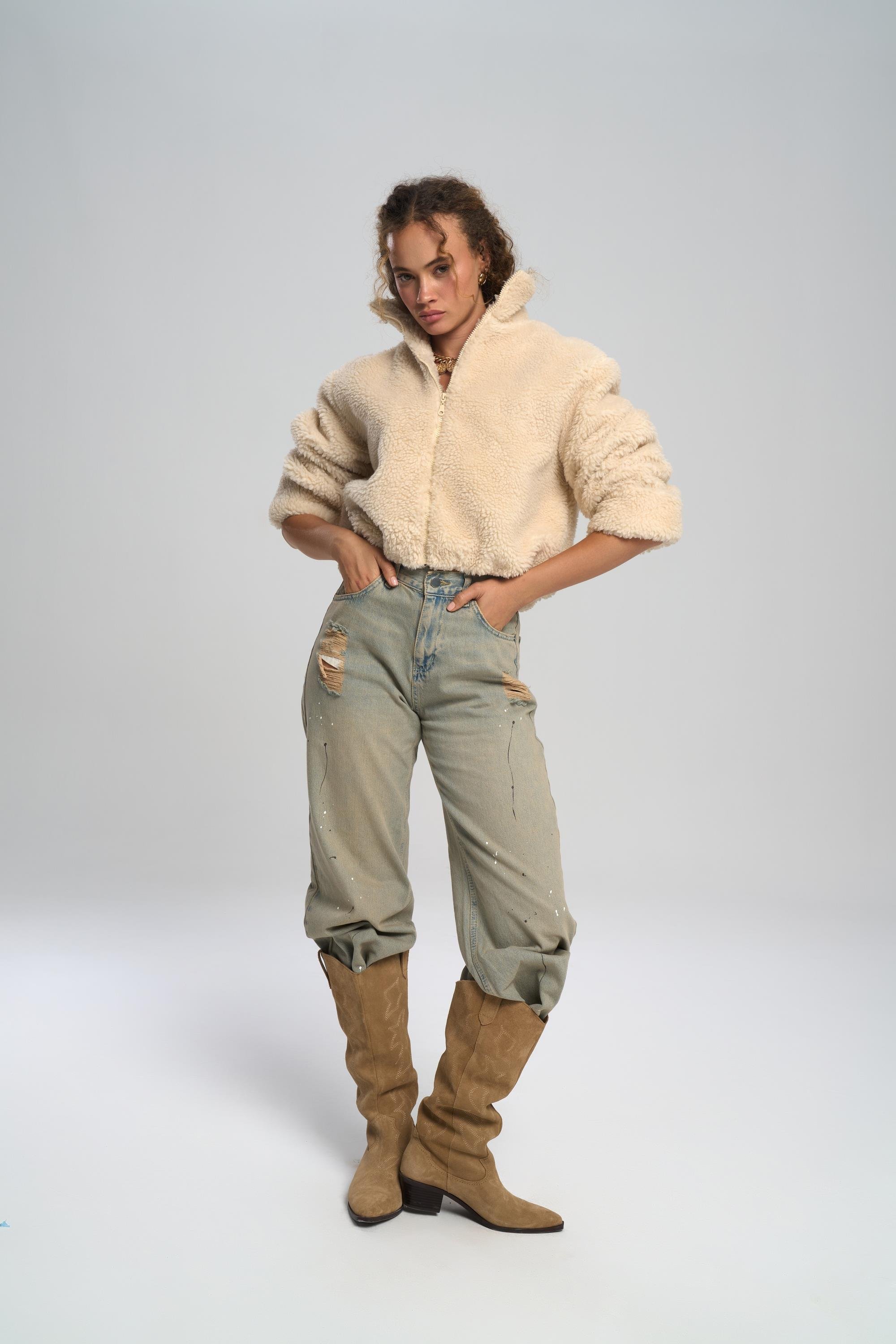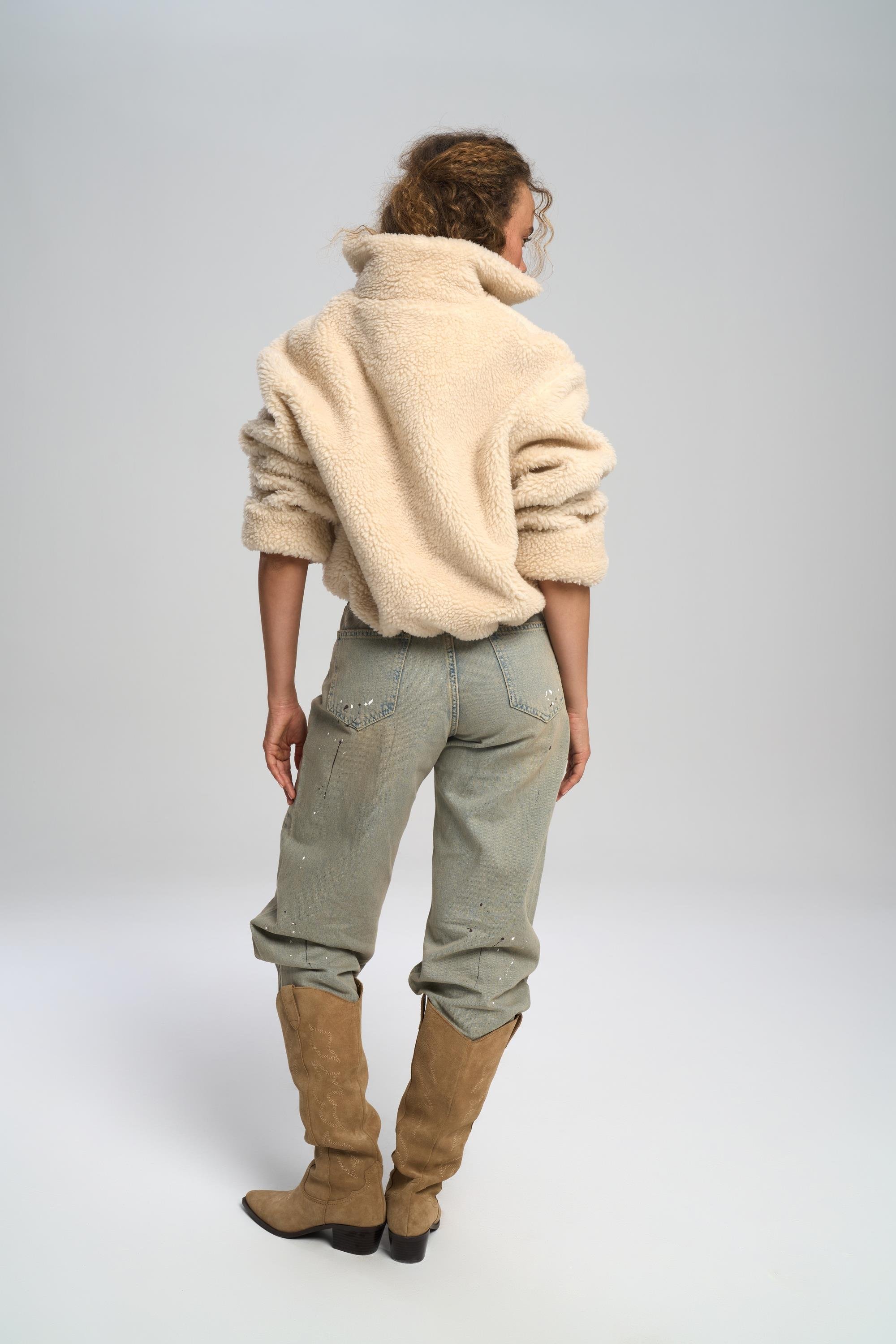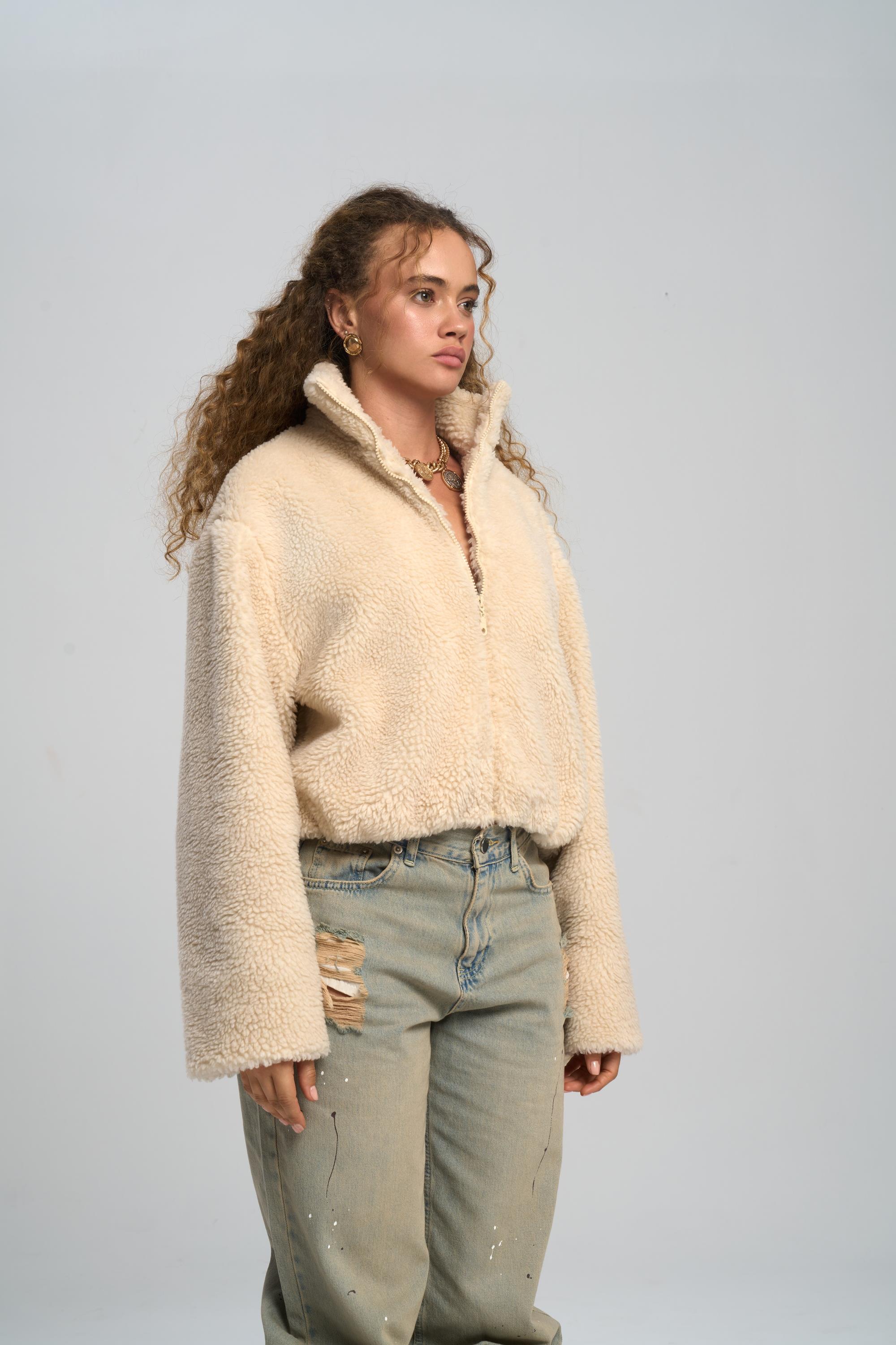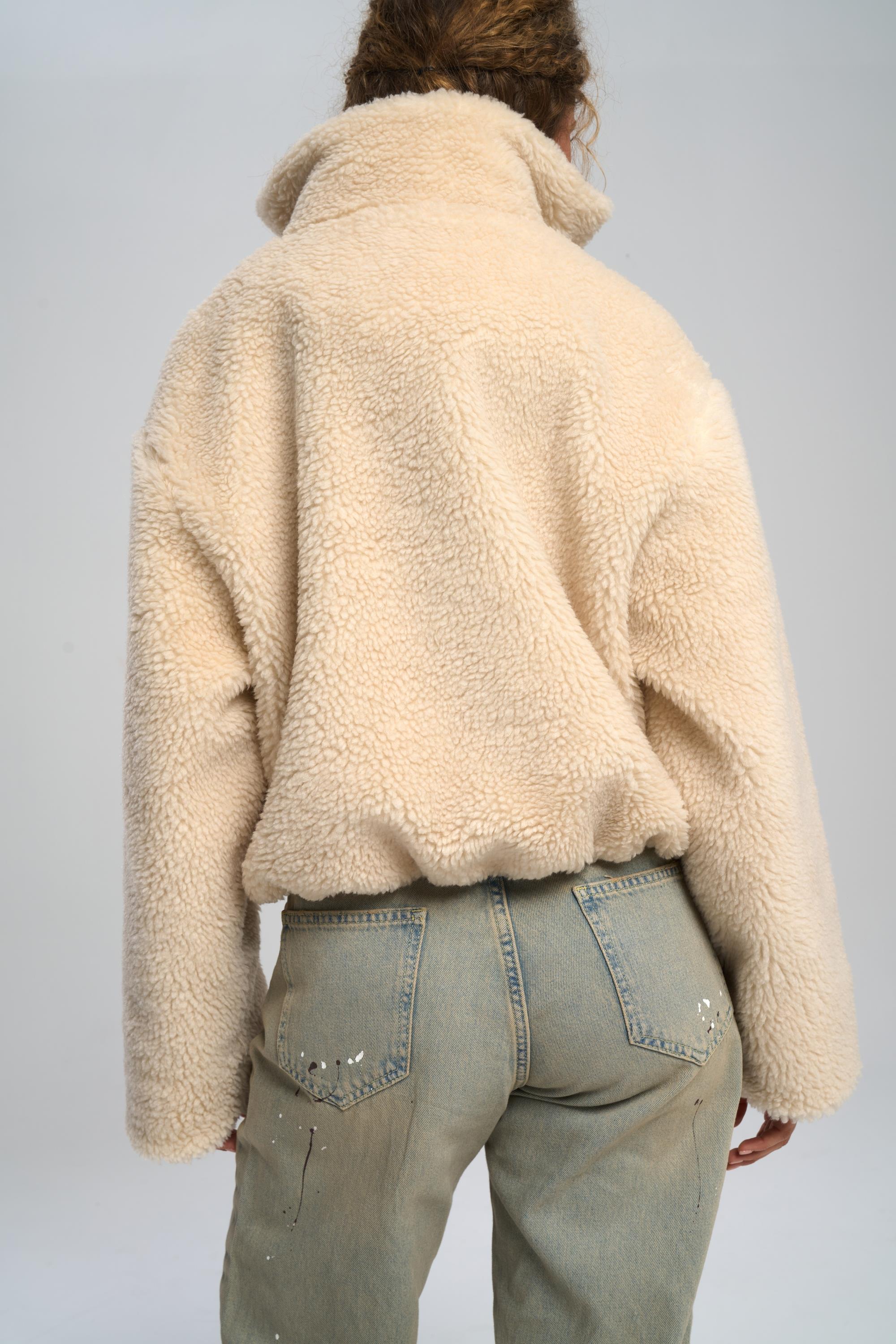 Hafif oversize, rahat kalıp, etek ucu lastikli, ön kapama fermuarlı, katlanabilir. Uzun kol, kısa teddy bomber ceket.
