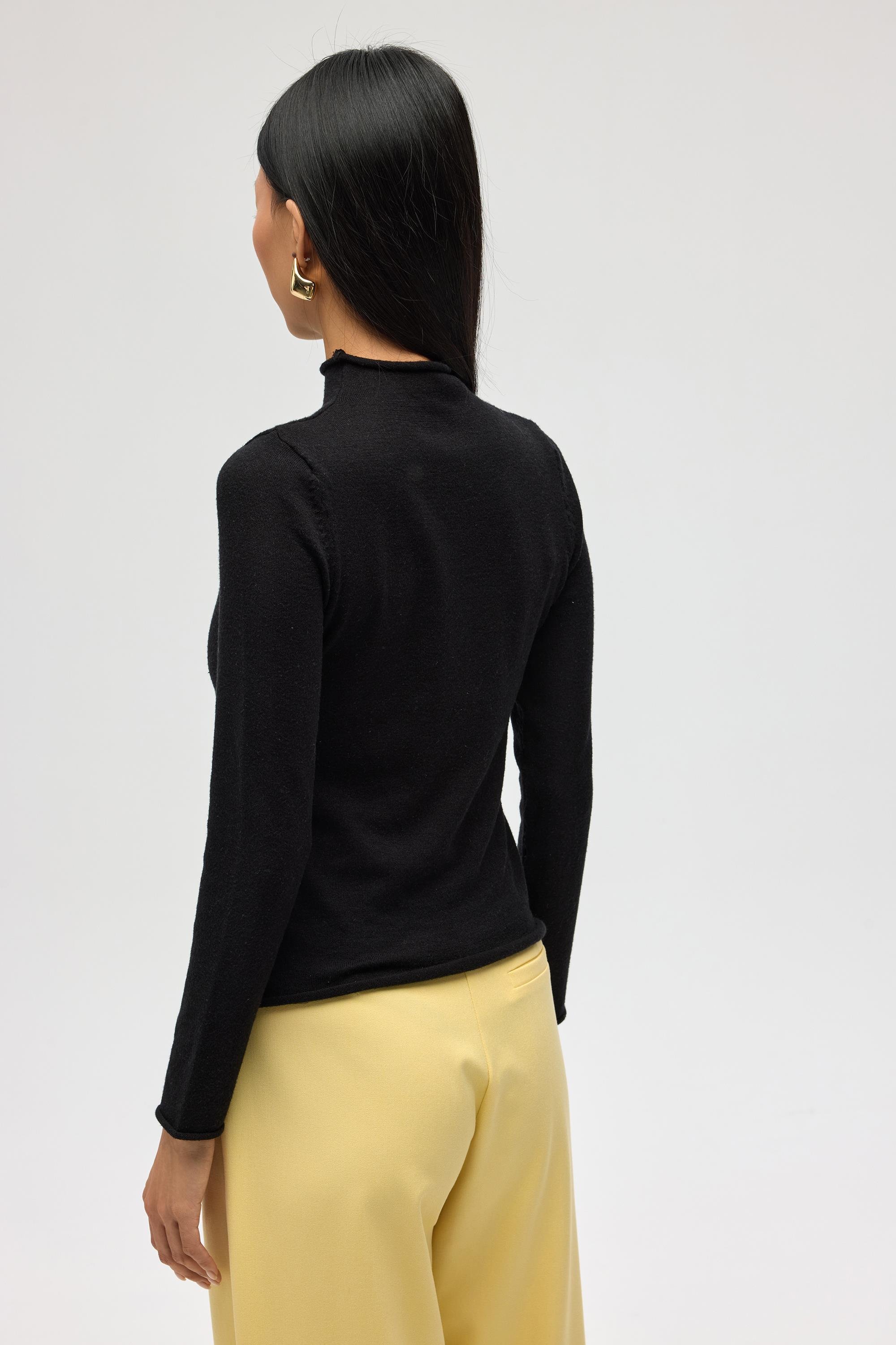 Bedenden çıkan balıkçı yakalı, rahat formda, uzun kollu, ince triko kazak.