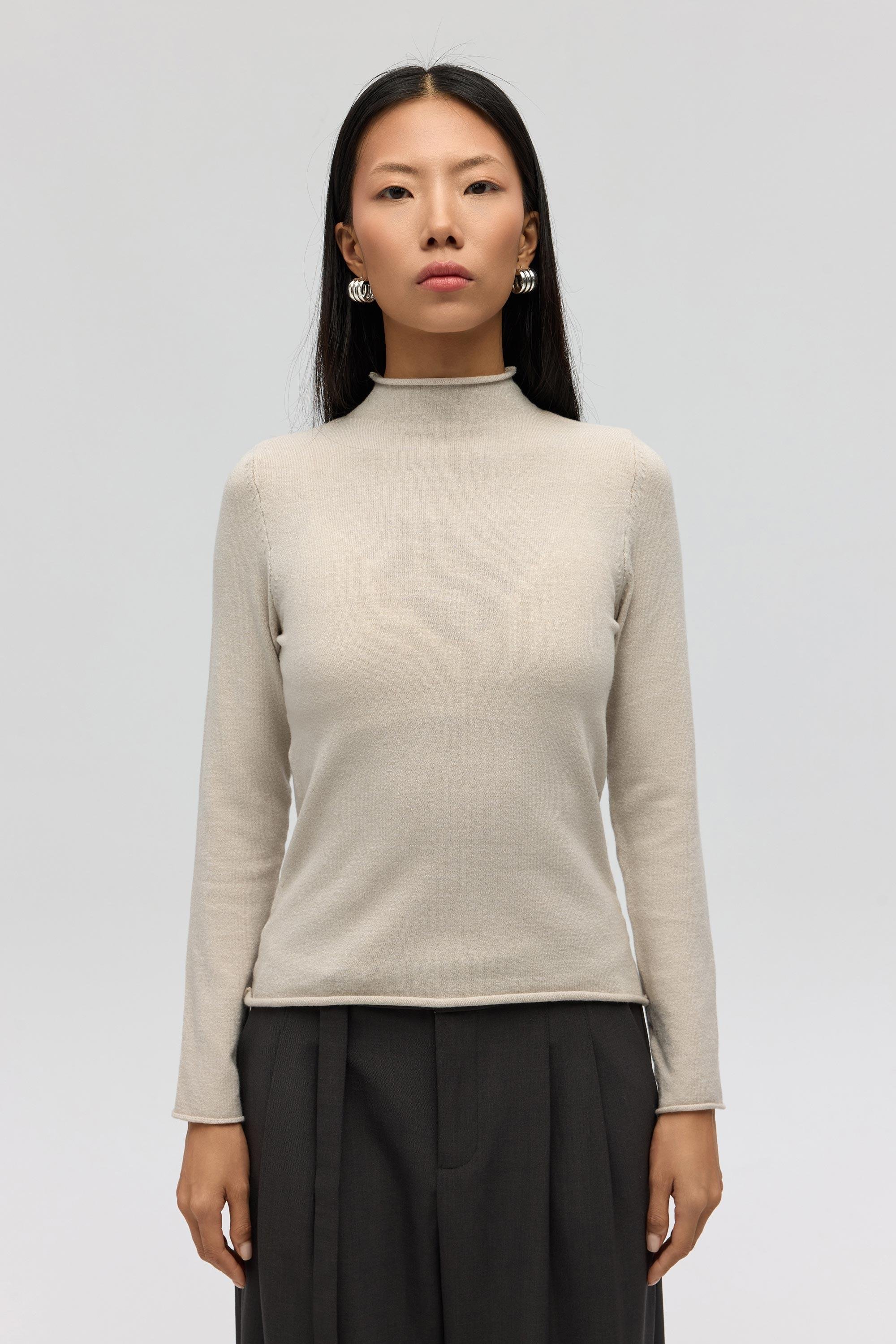 Bedenden çıkan balıkçı yakalı, rahat formda, uzun kollu, ince triko kazak.