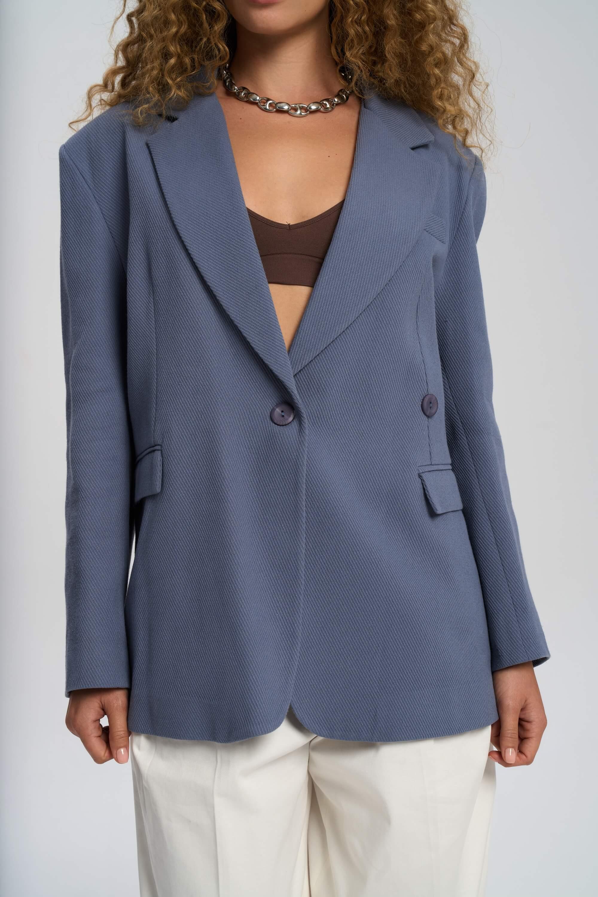 Vatkalı, uzun kollu ve katlı yaka bol kesim blazer. Önü kapaklı