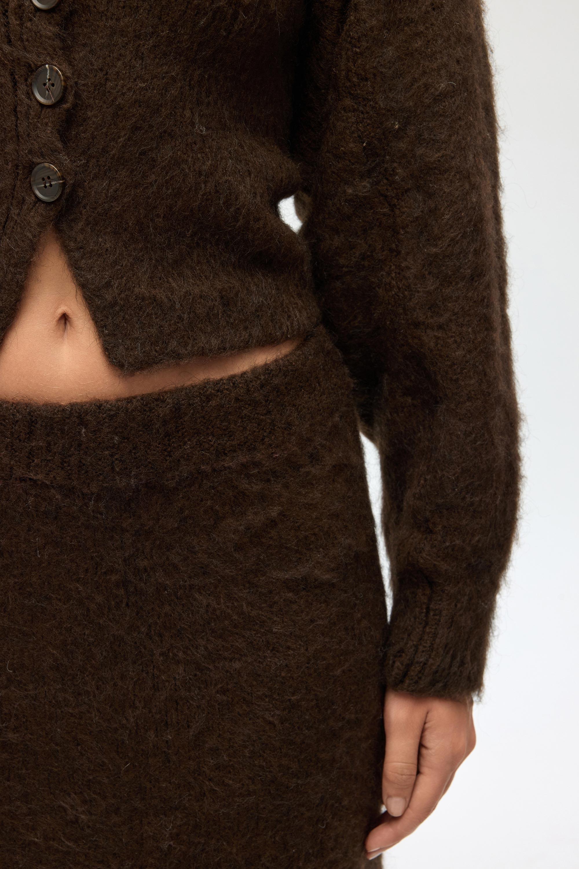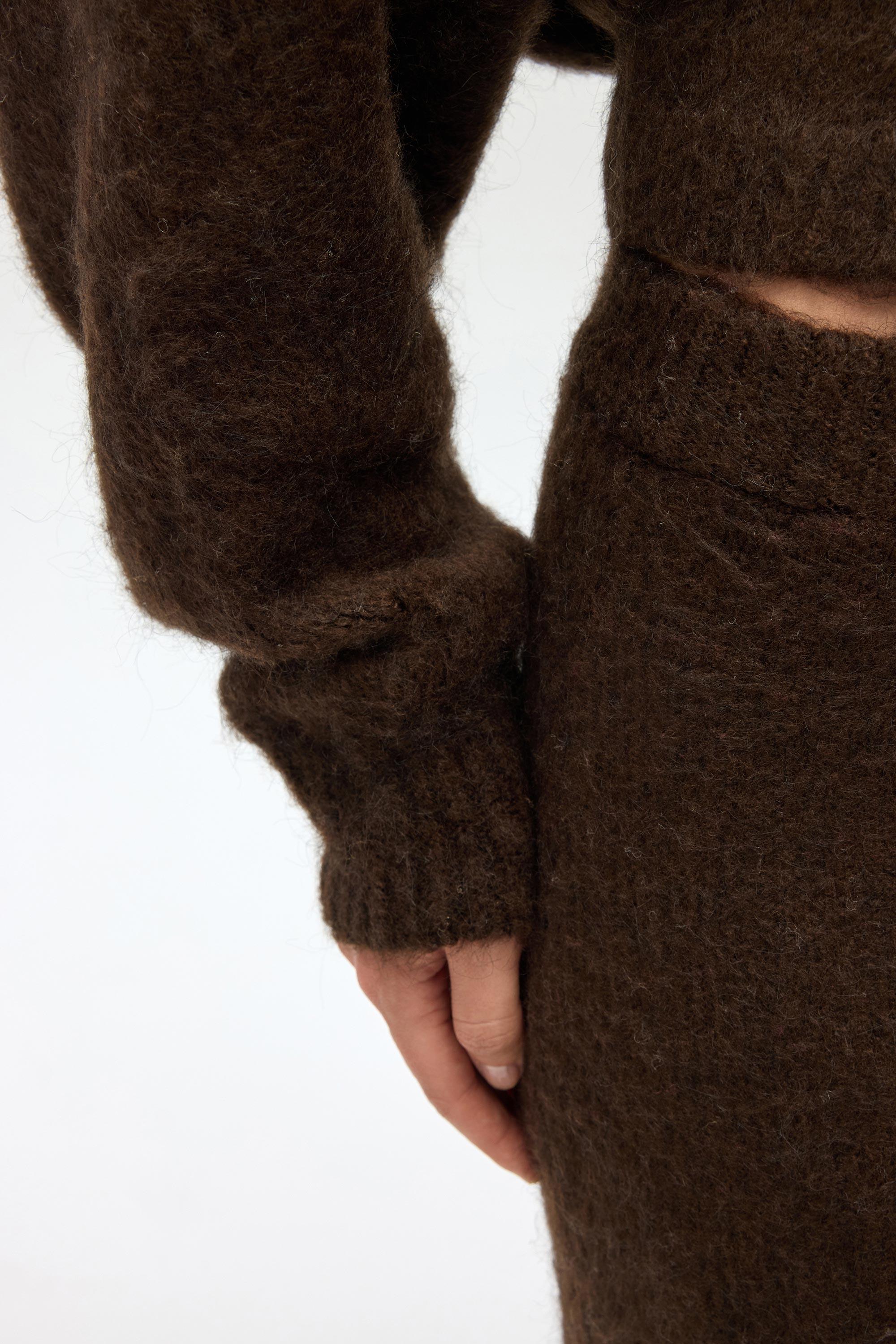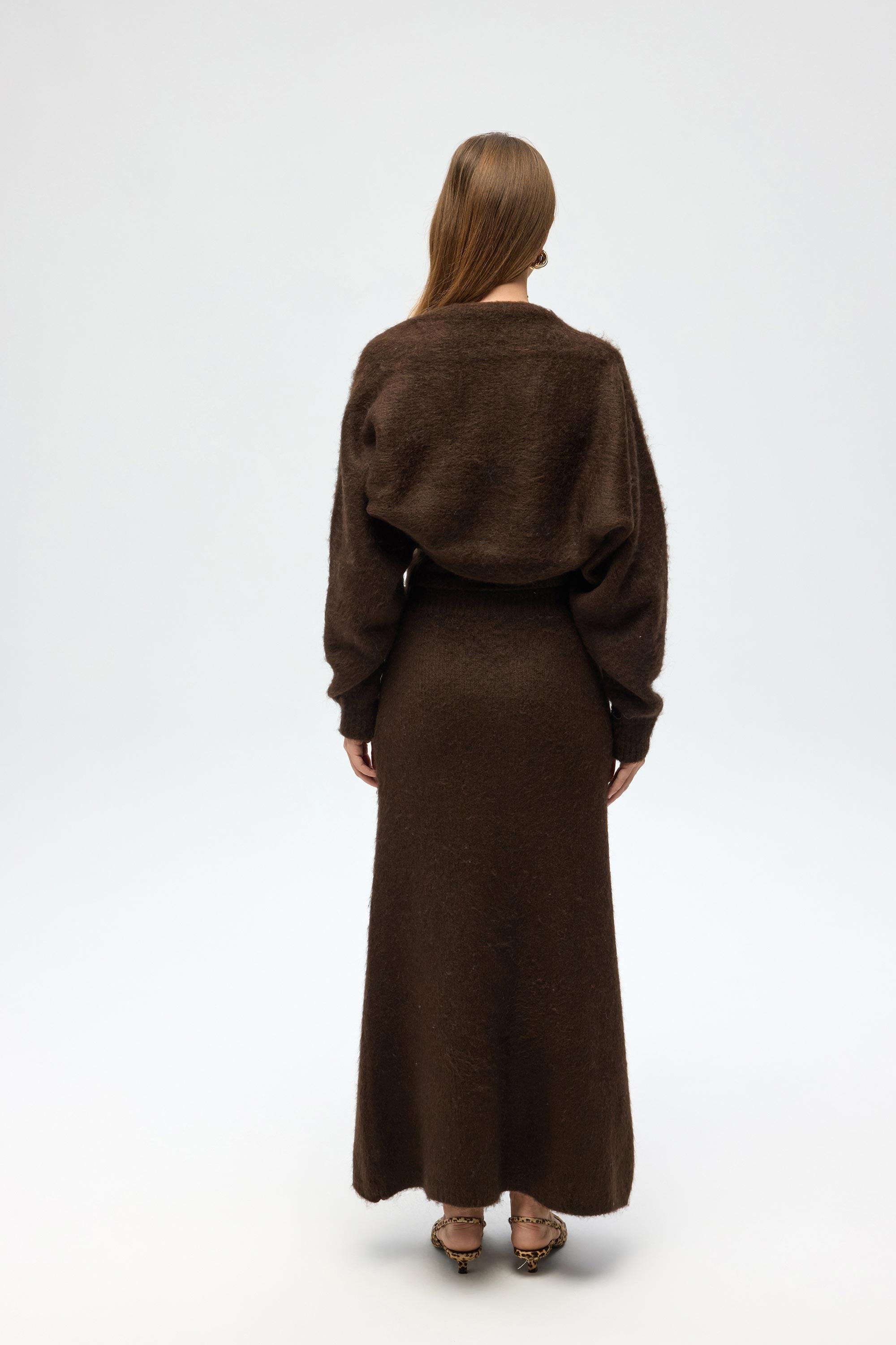Bedene oturan formda 'V' yakalı, ön etek ucu üçgen detaylı ve kruvaze kapamalı triko kazak.