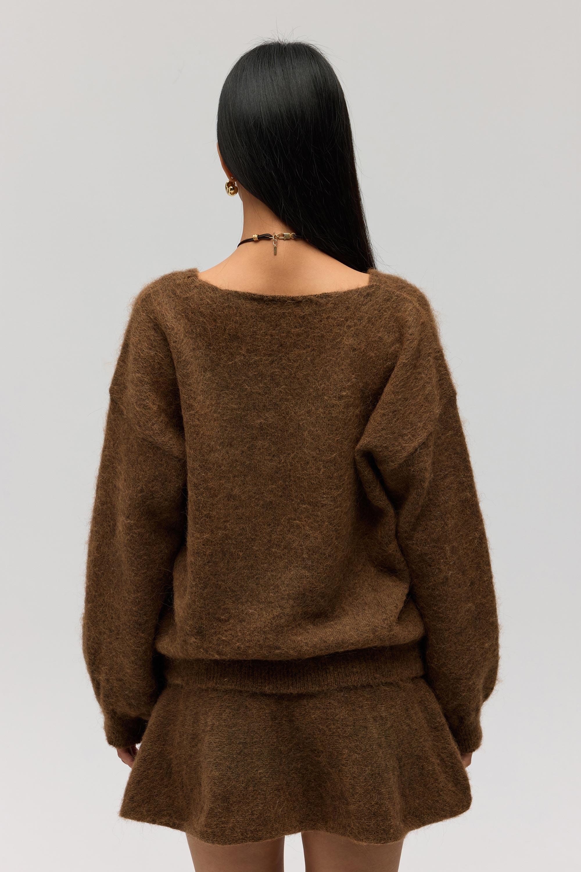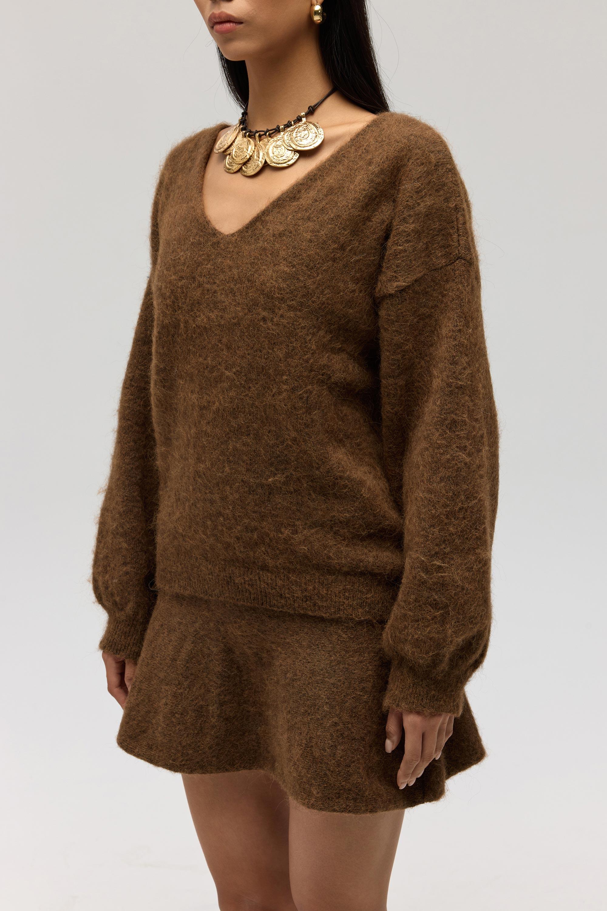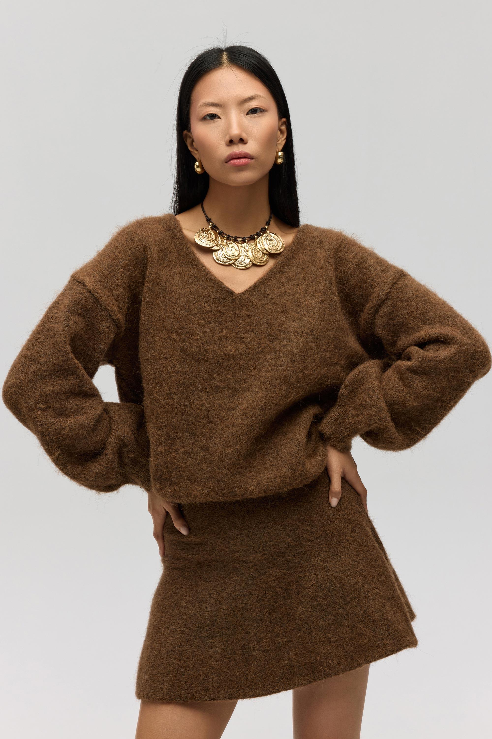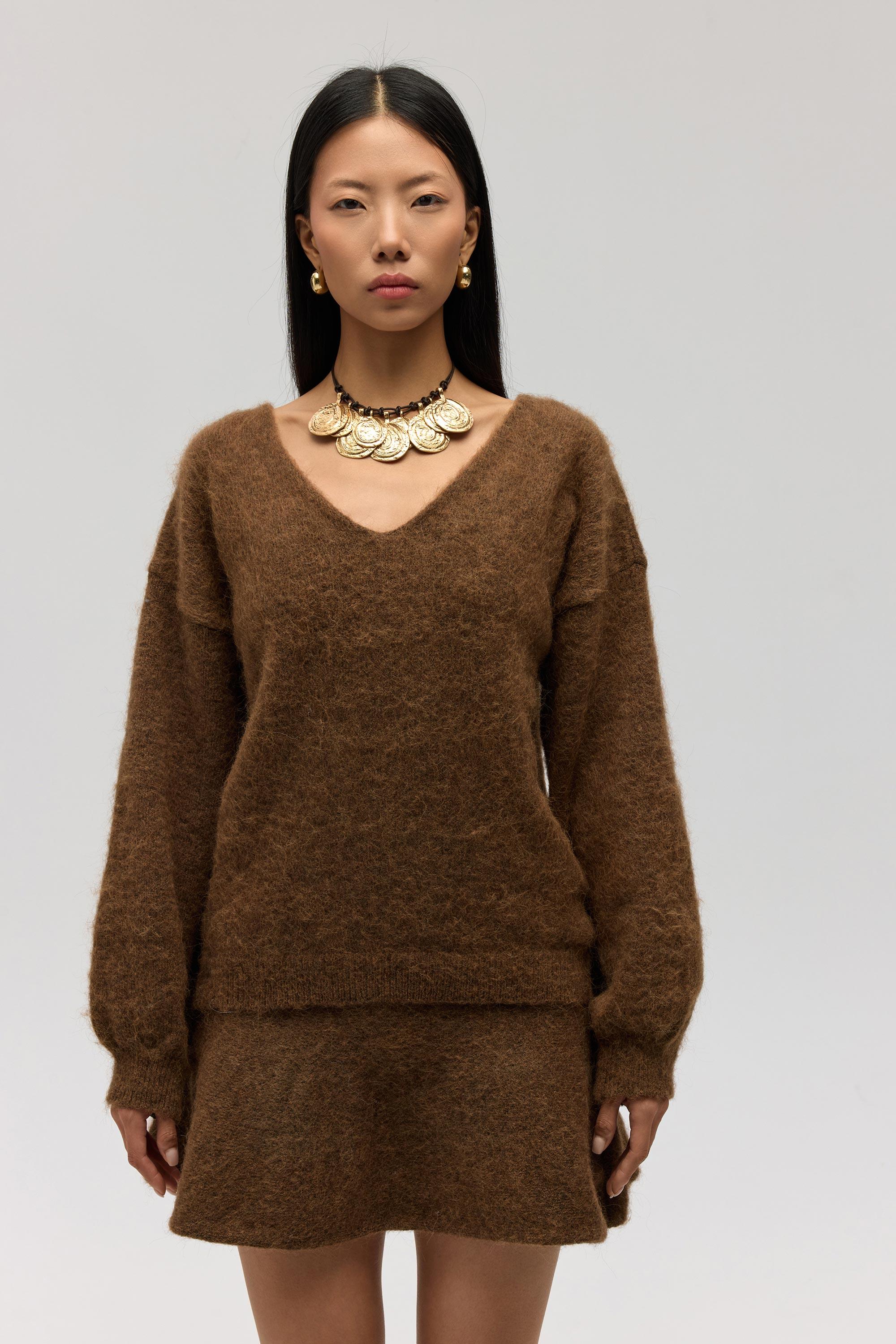 Rahat formda, etek ucu ve kol ağzı lastikli ve örgü detaylı "V" yaka triko kazak.