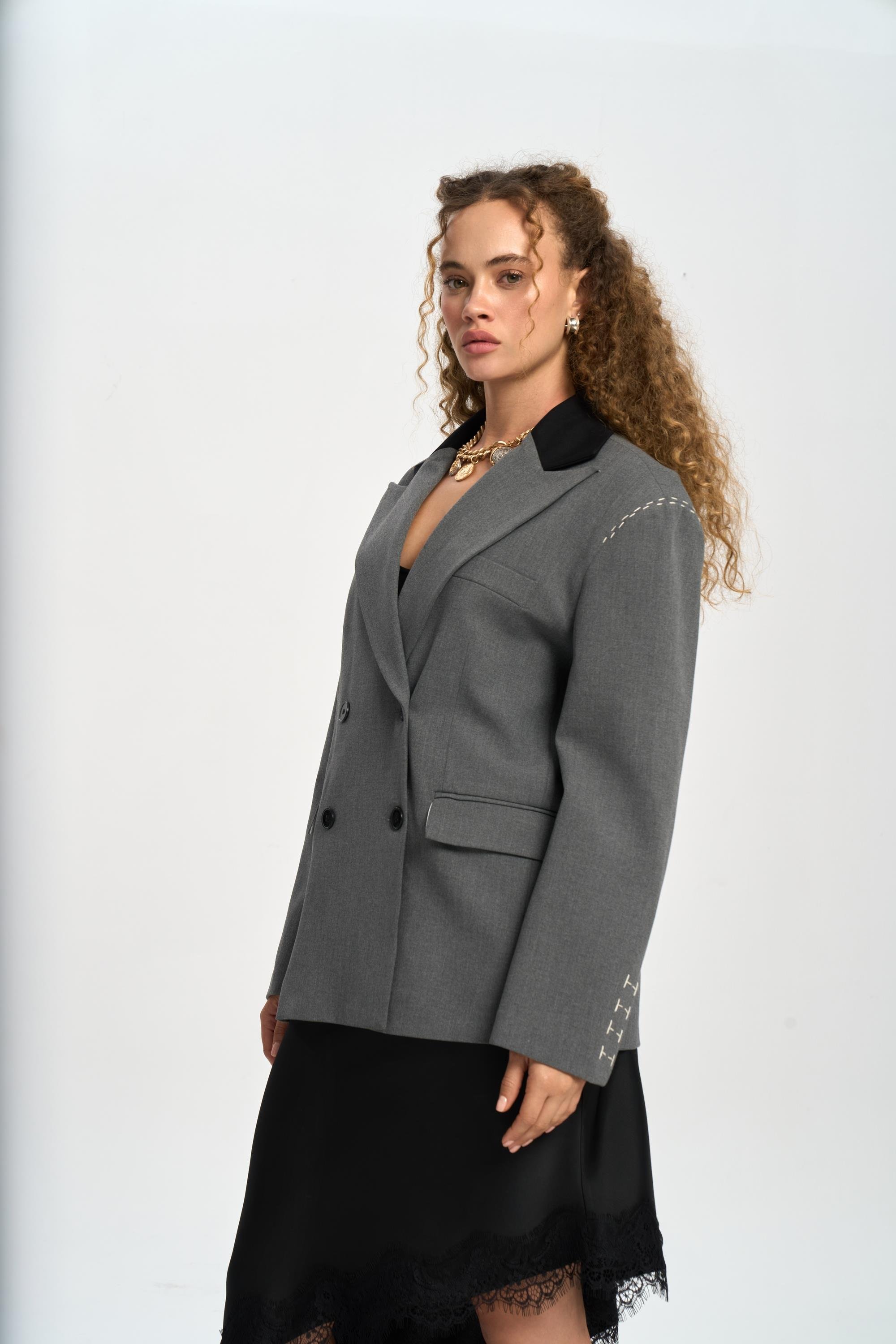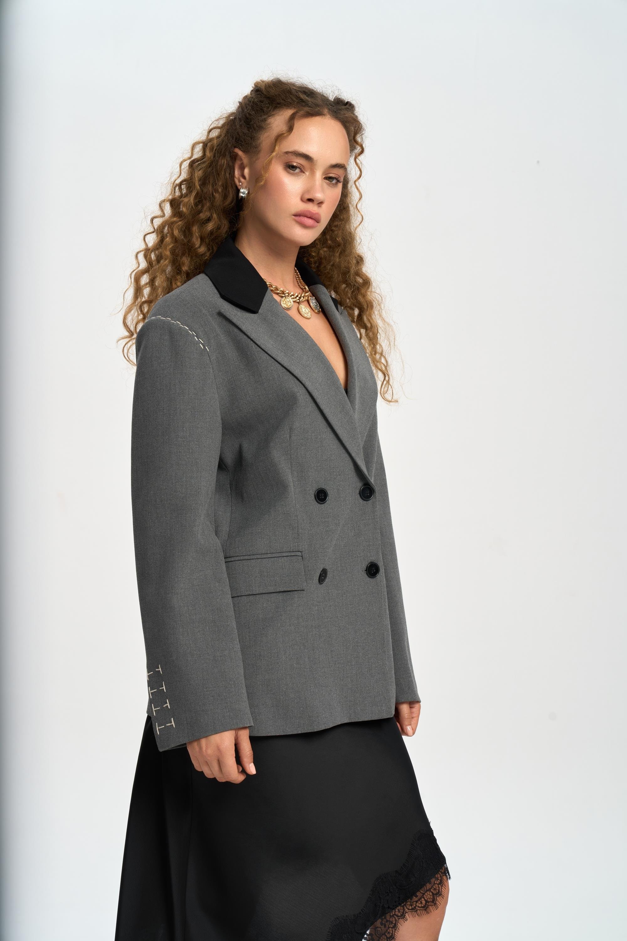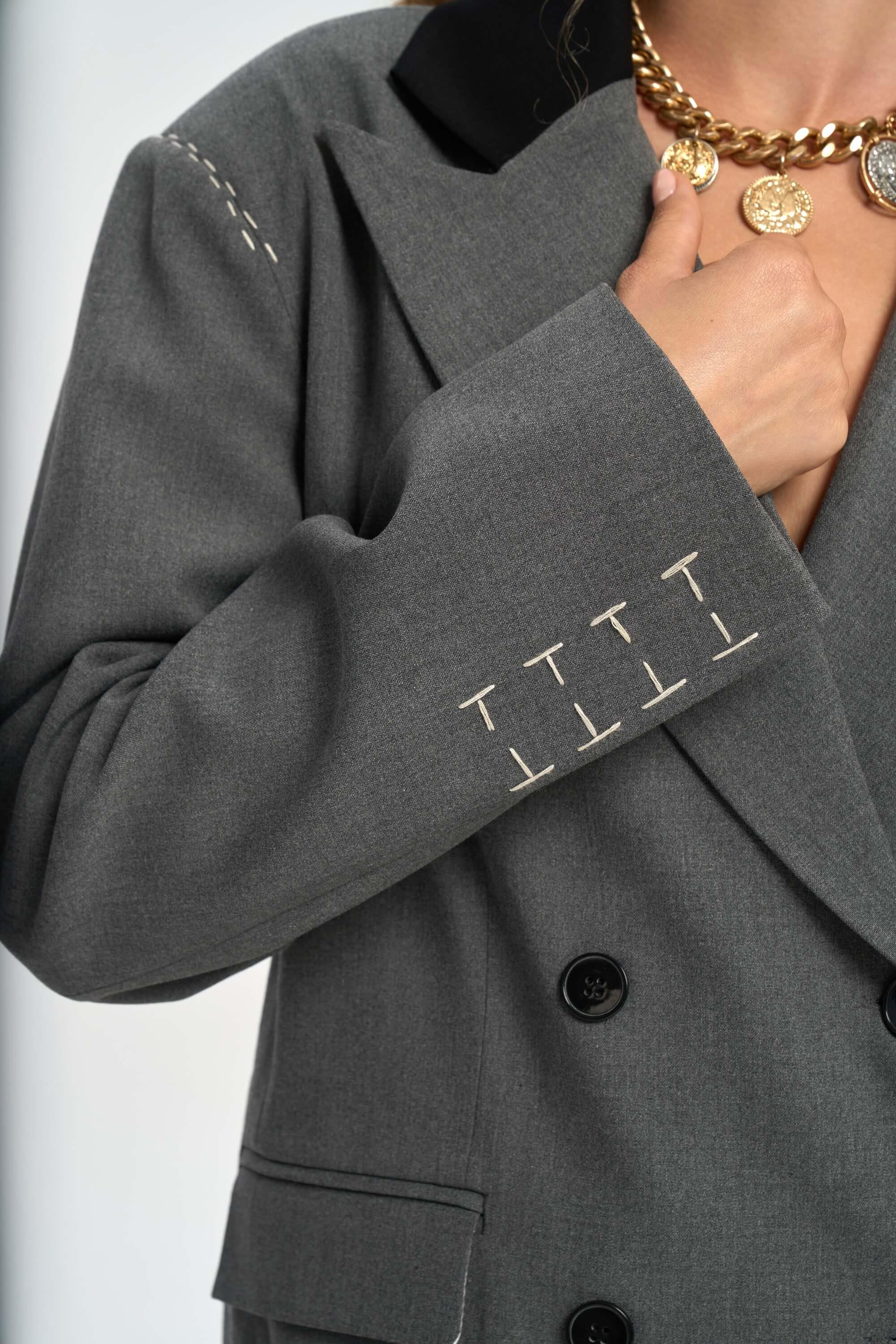 Omzu vatkalı, oversize formda, yaka garnili, omuz ve ucu nakış detaylı, cep kapaklı, dört düğmeli kruvaze blazer ceket.