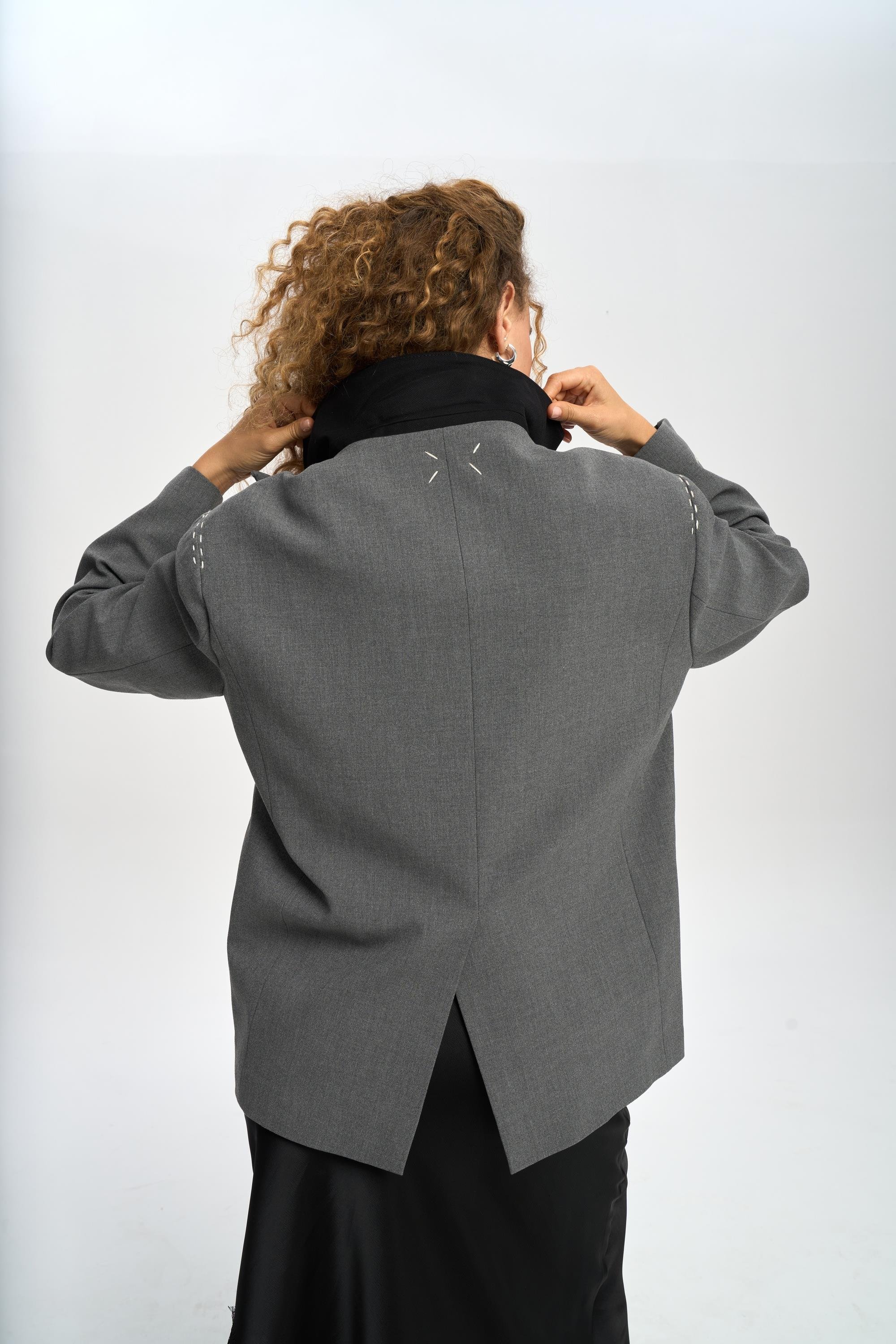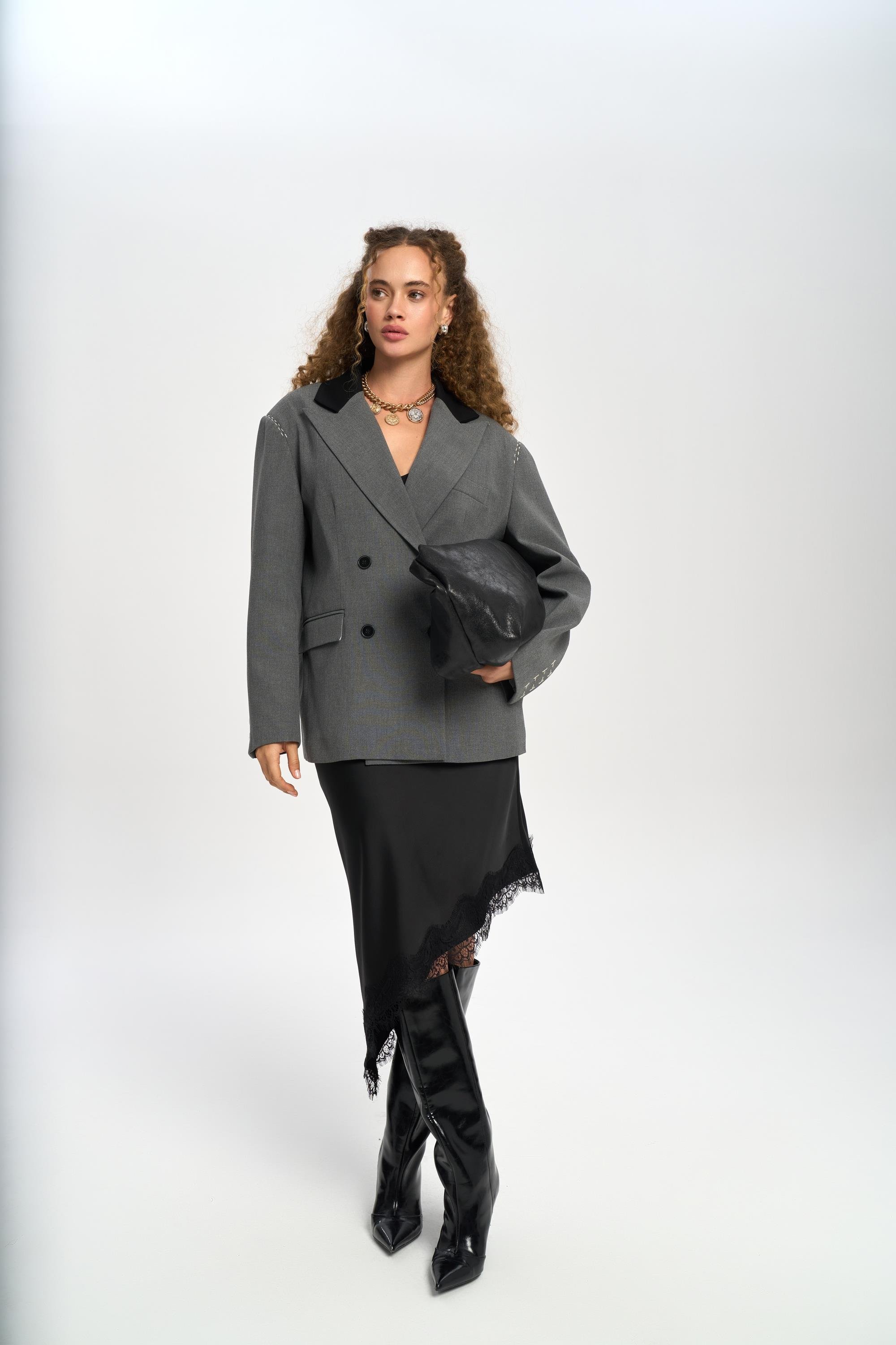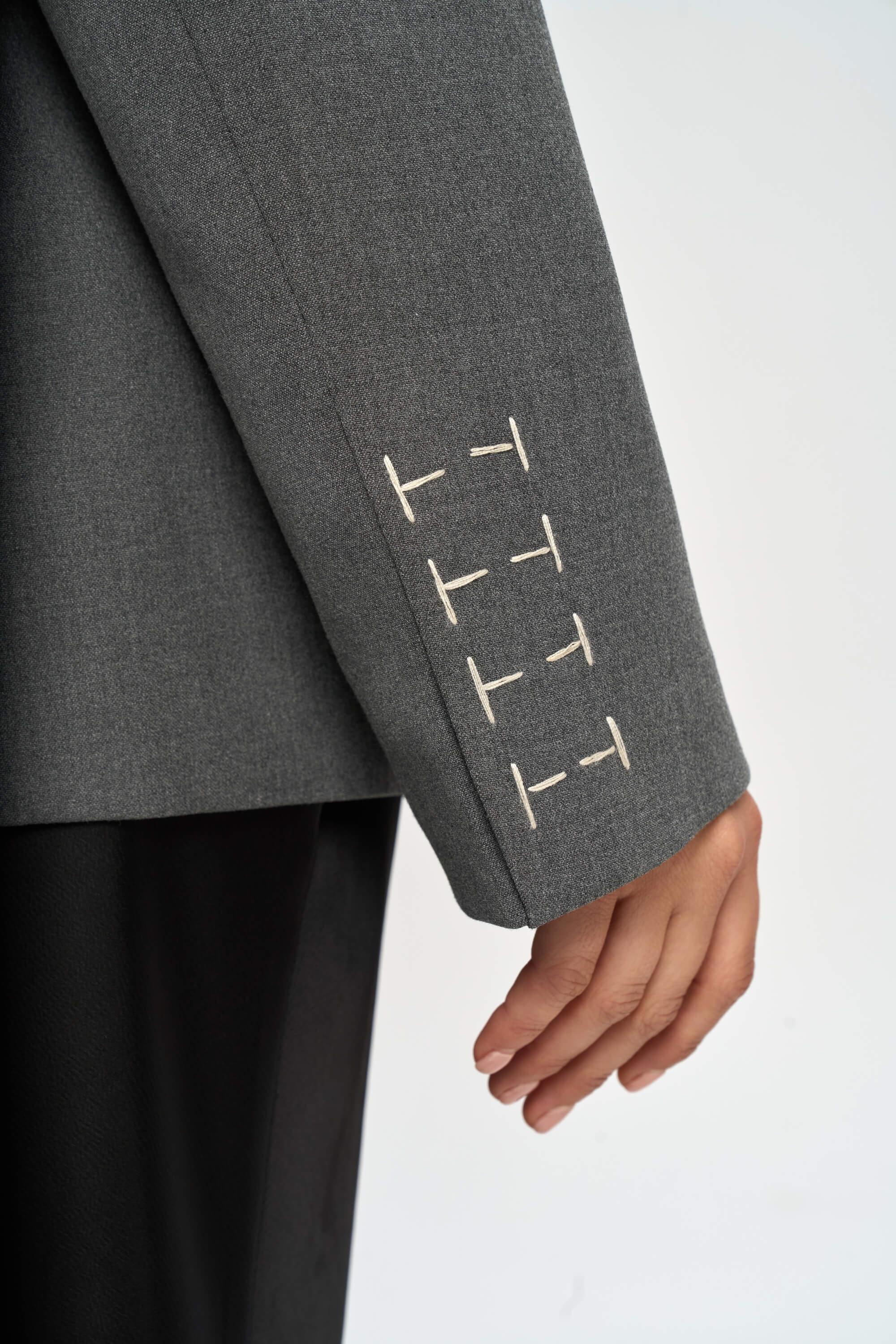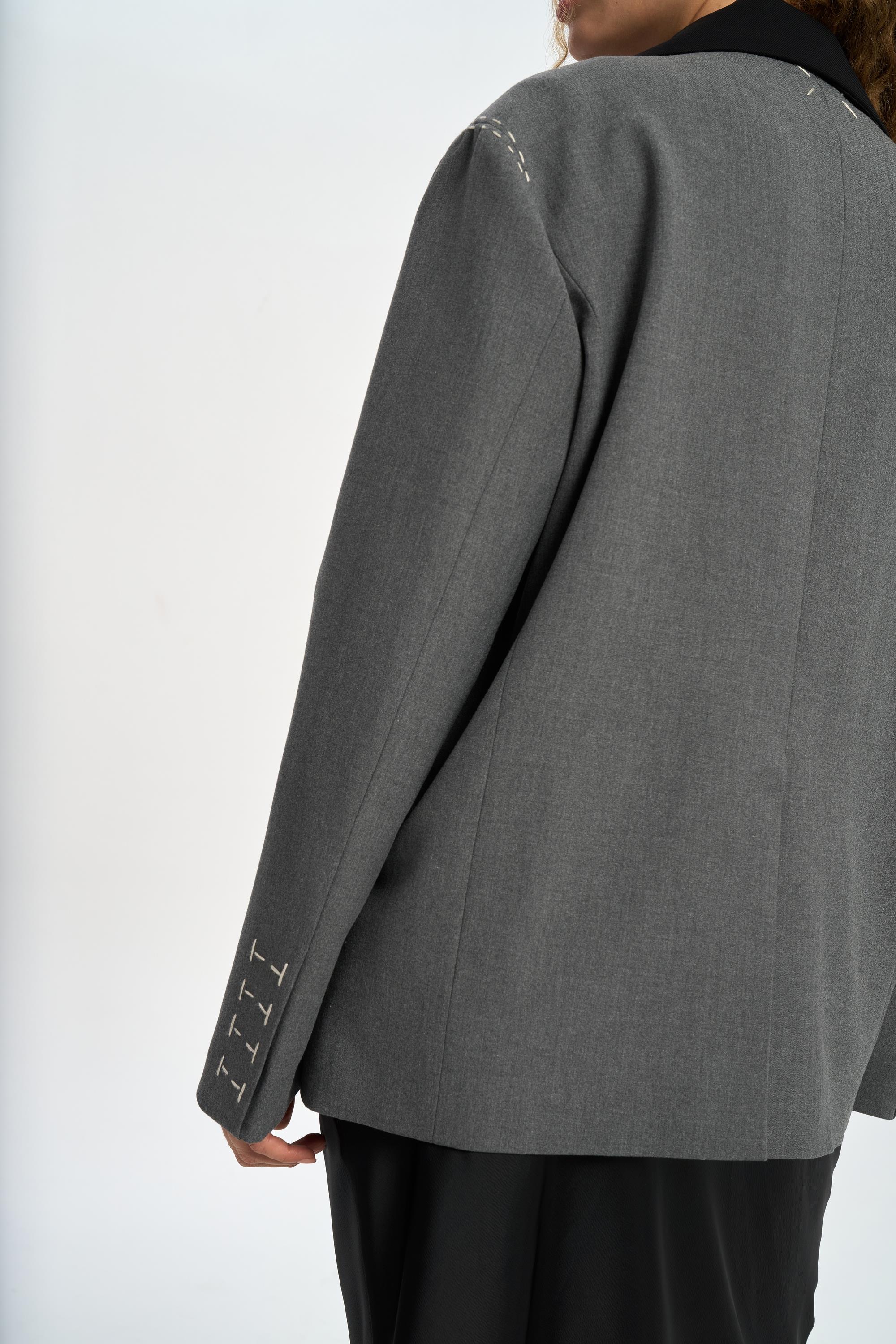 Omzu vatkalı, oversize formda, yaka garnili, omuz ve ucu nakış detaylı, cep kapaklı, dört düğmeli kruvaze blazer ceket.
