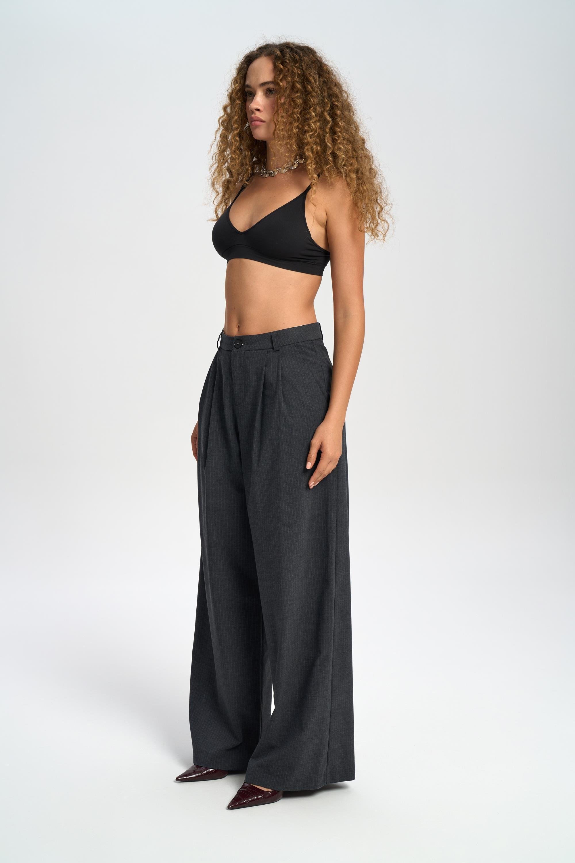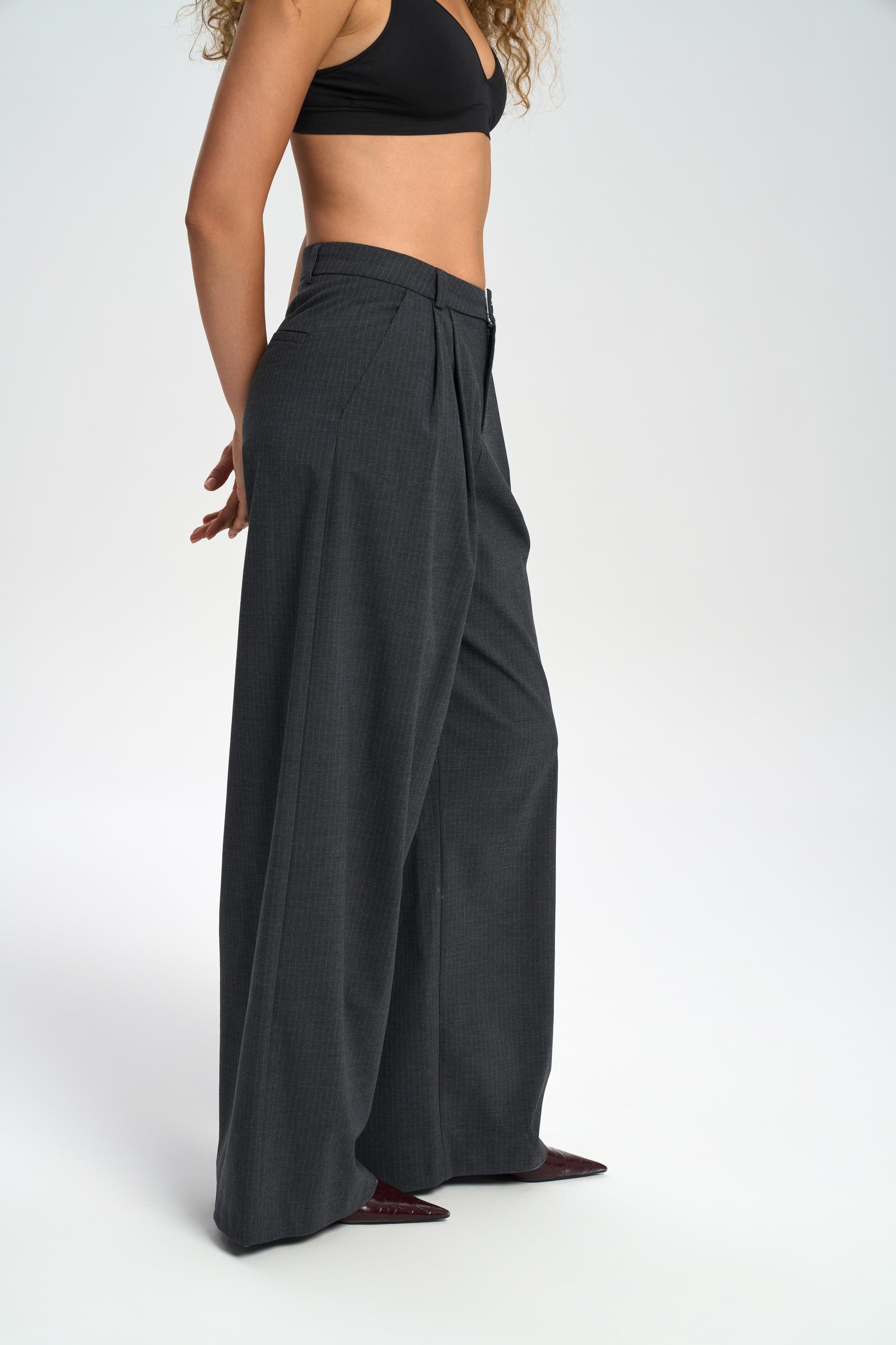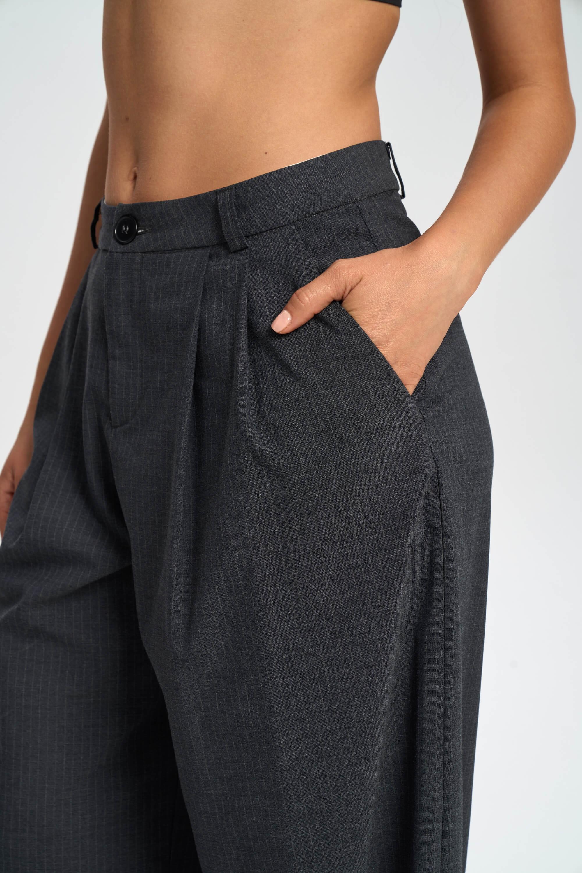 Bele oturan, paçası bol, orta bel ve rahat formda. Pileli, arka fleto cepli palazzo pantolon.