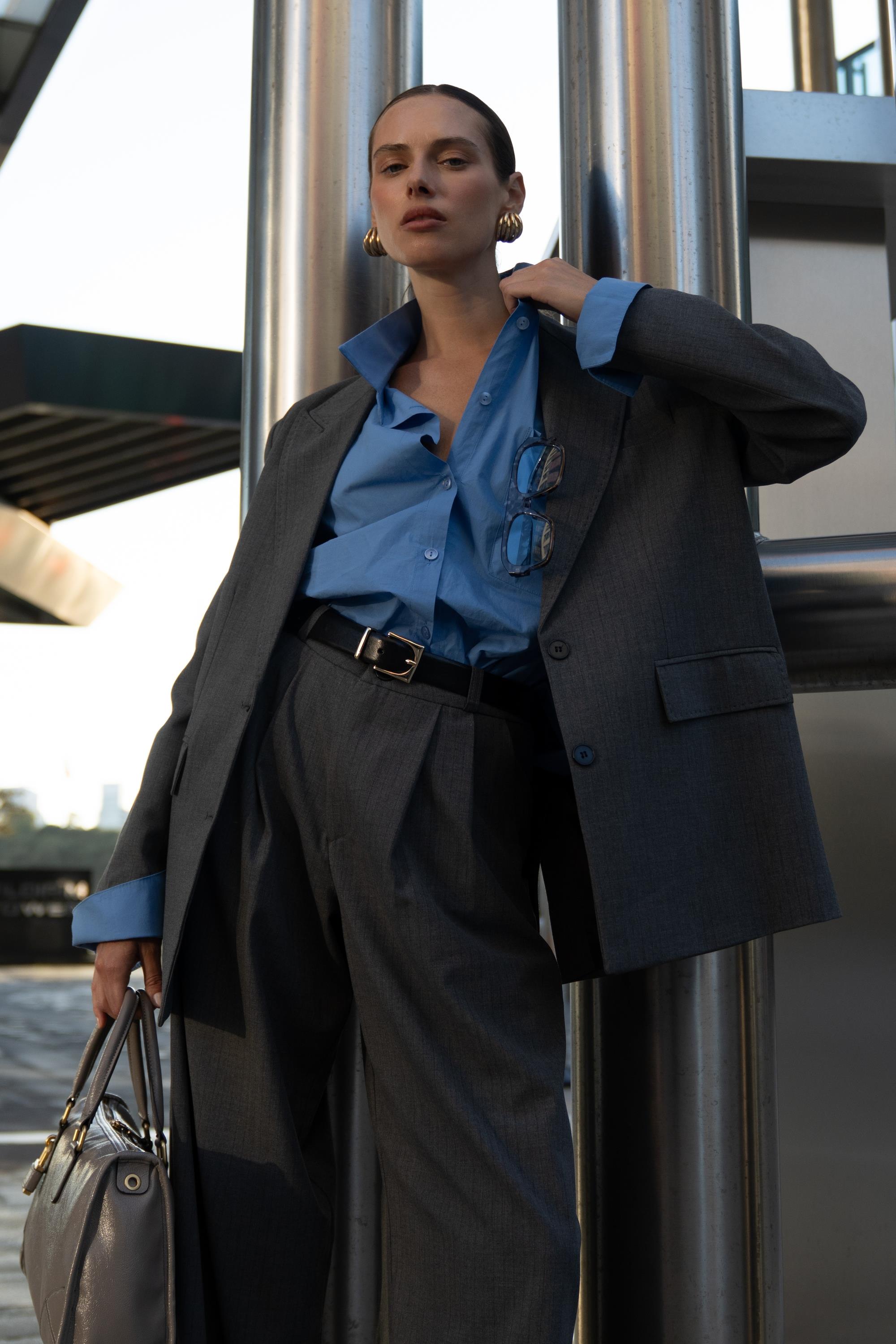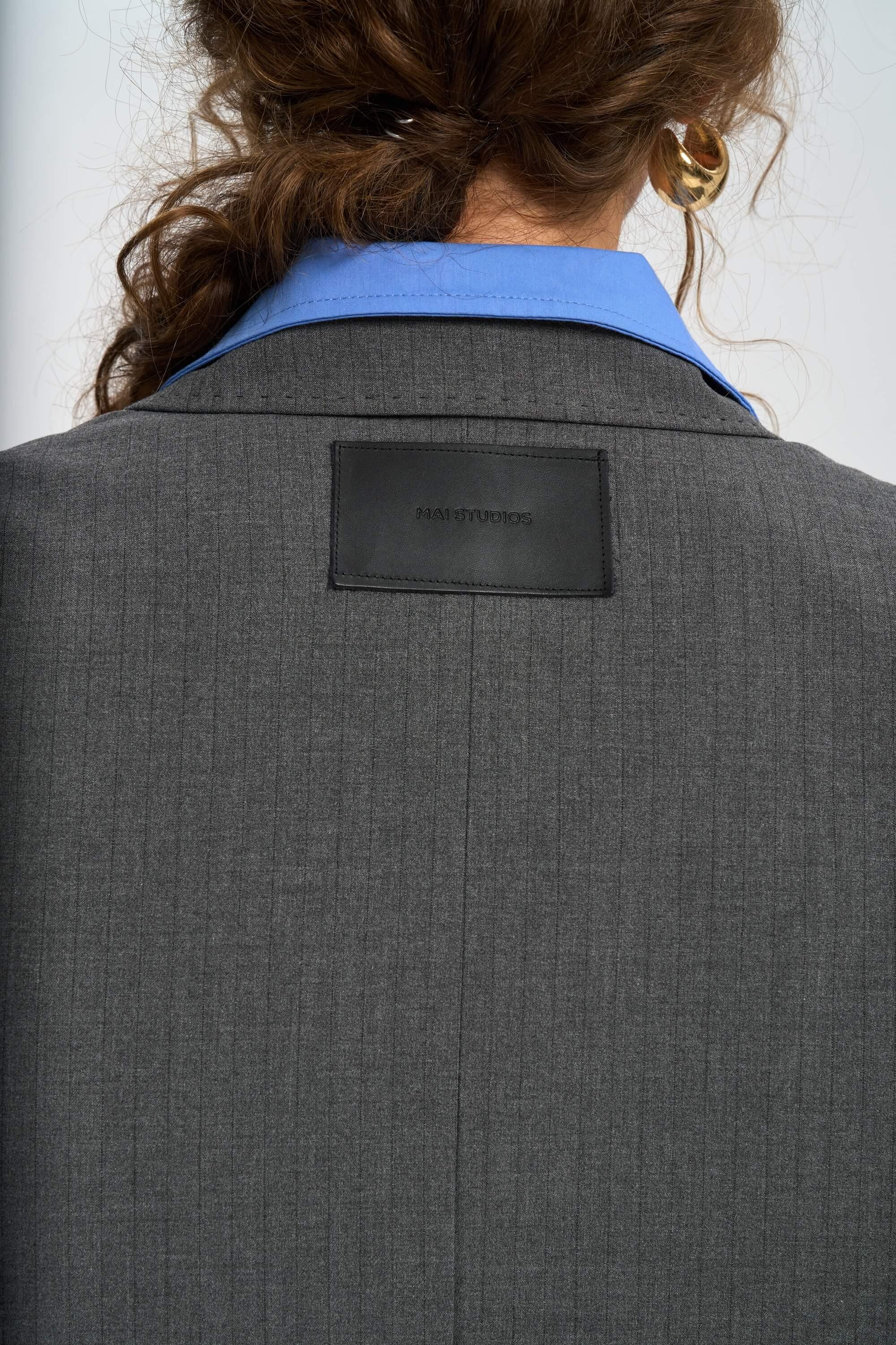 Omzu vatkalı, hafif oversize formda. Önde iki düğme kapamalı, arka ensede deri jakron detaylı blazer ceket.