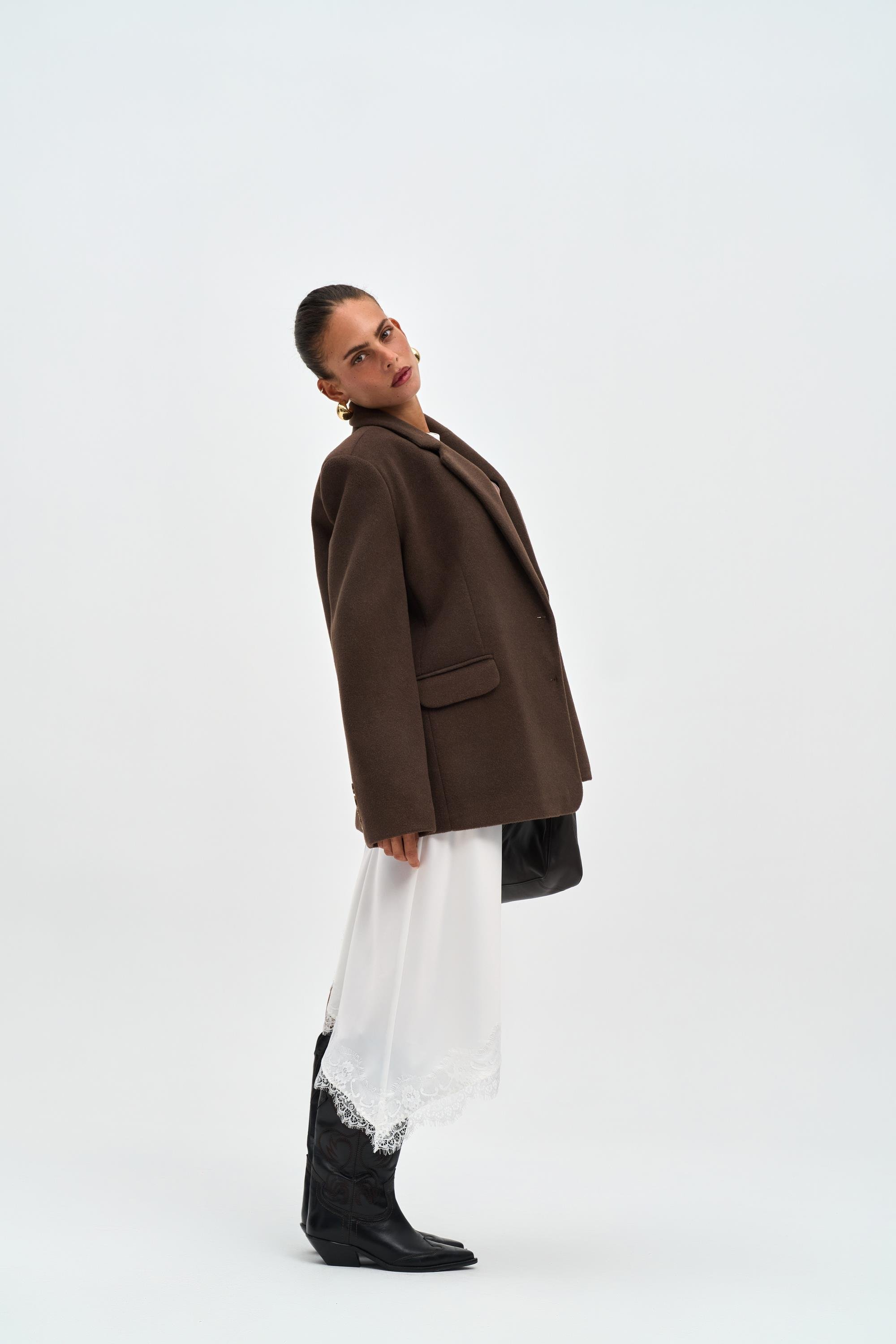 Beli lastikli, hafif bedene oturan formda, etek ucu dantel detaylı, midi boy asimetrik saten etek.