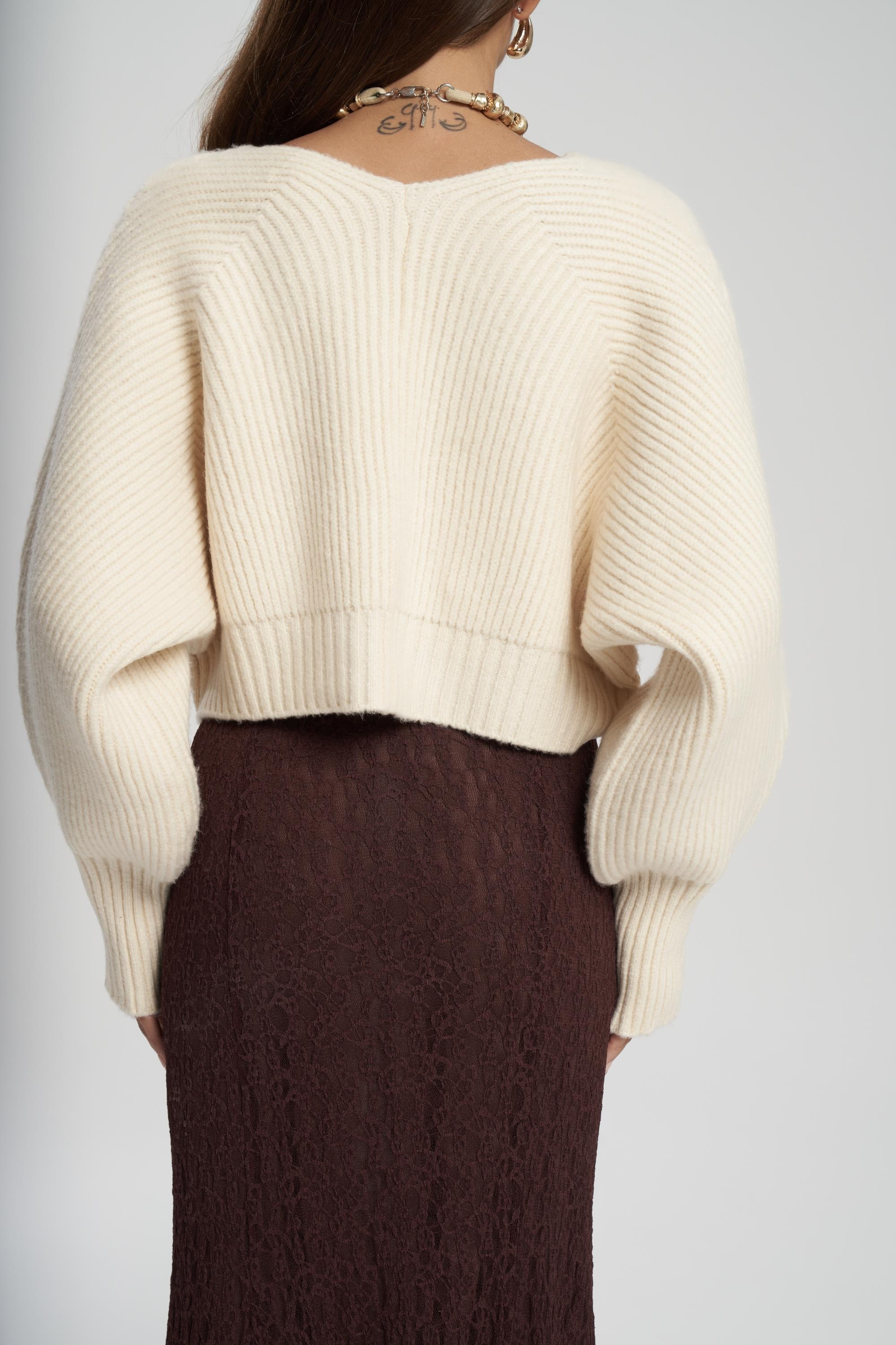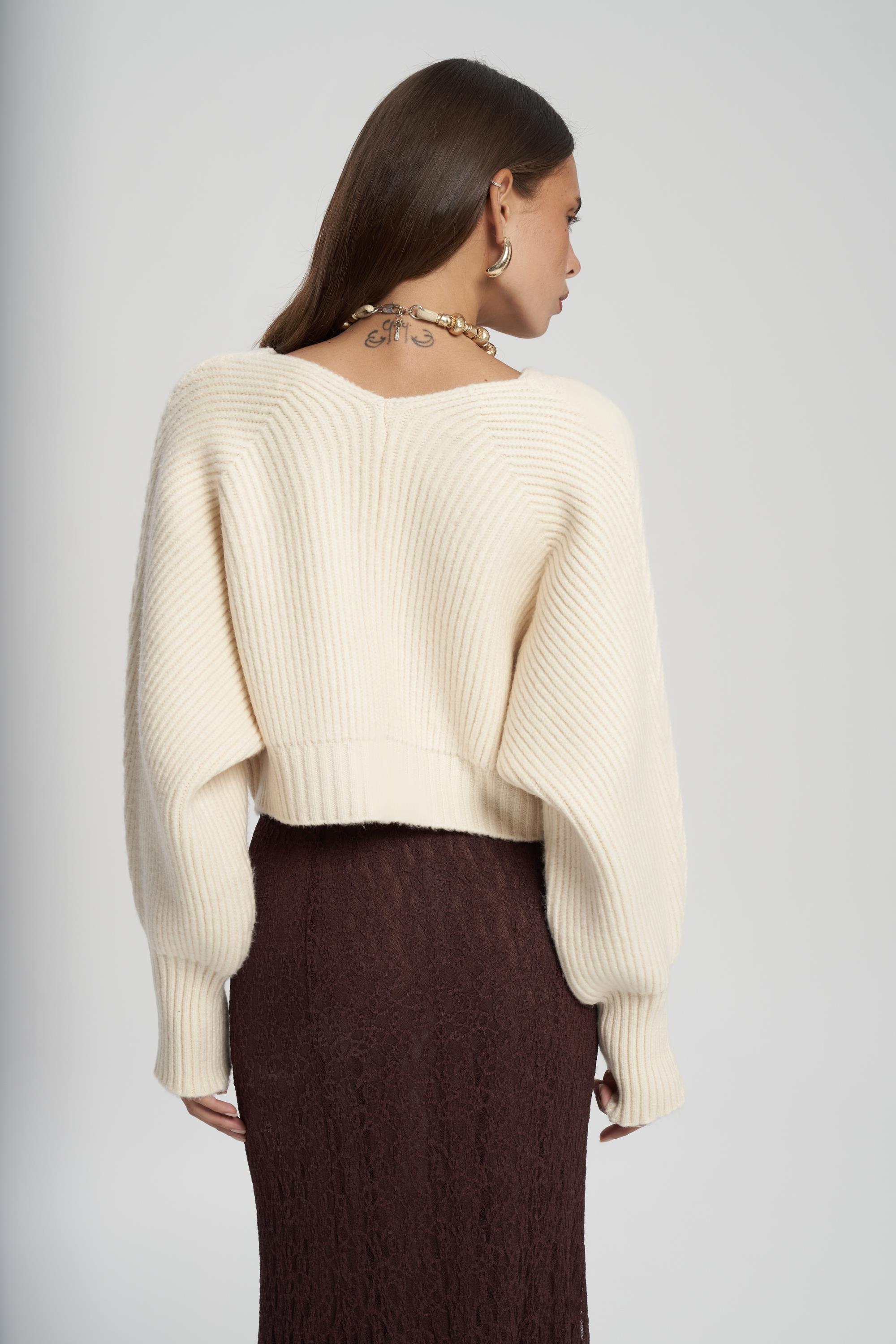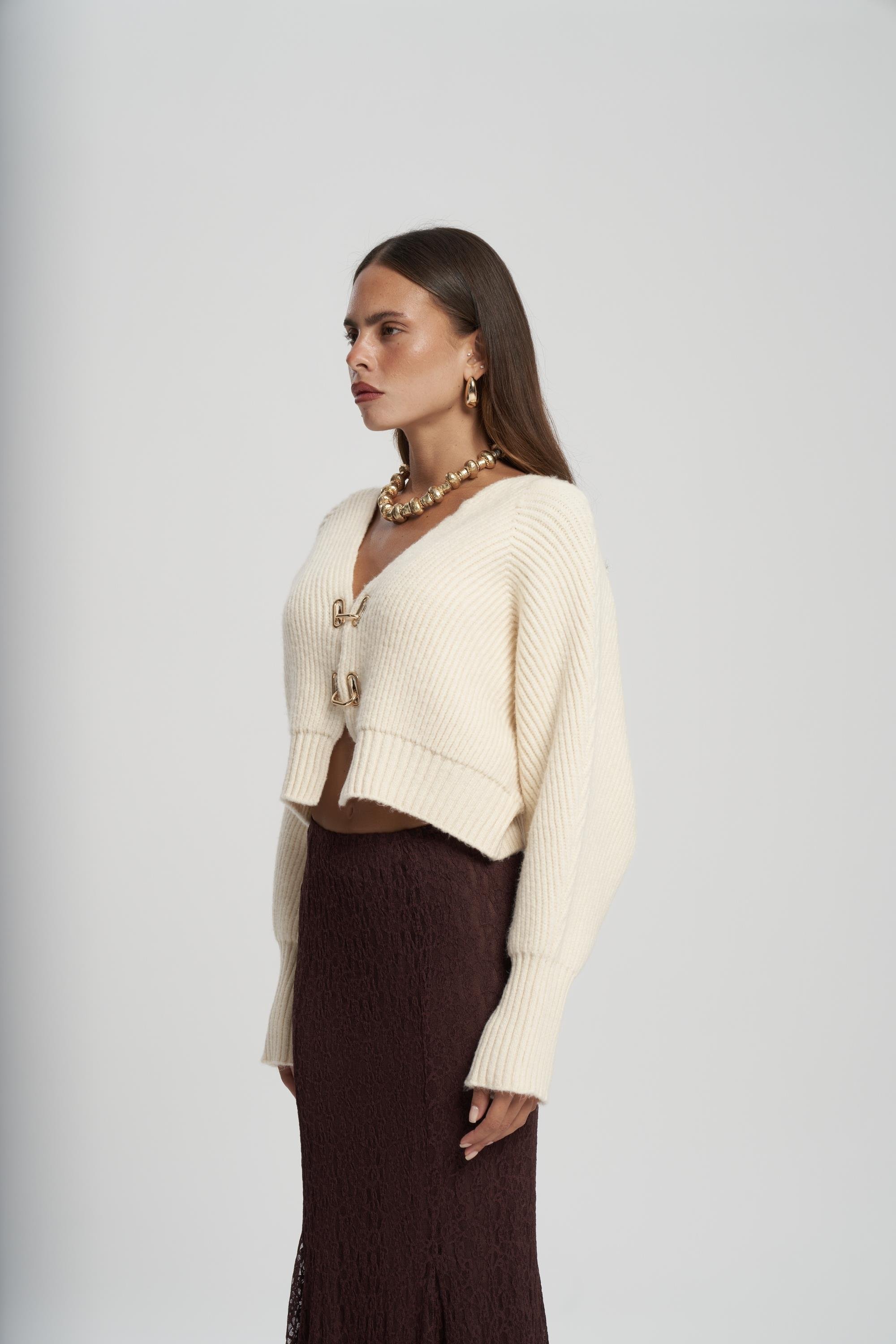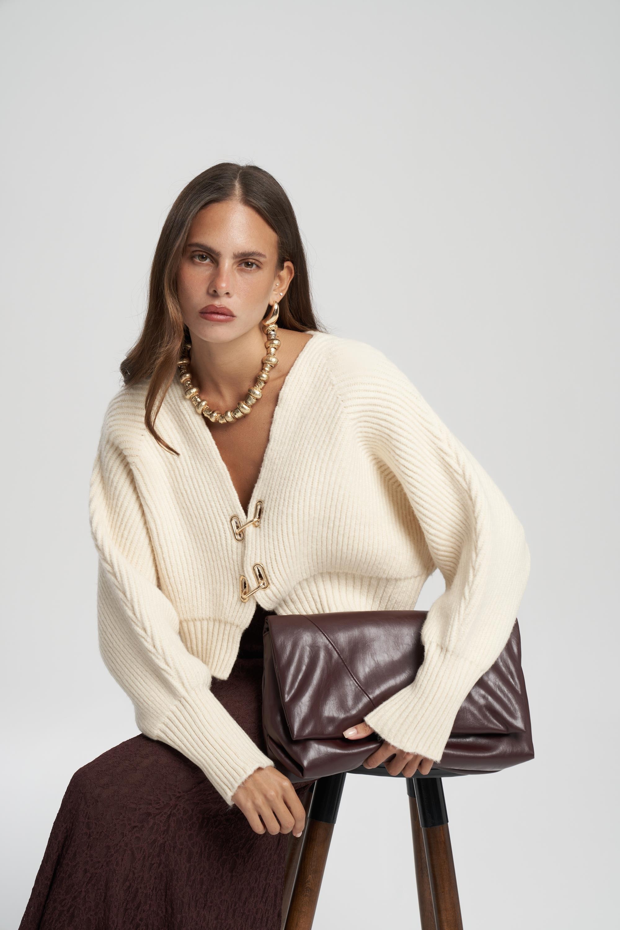 Oversize formda, uzun kollu, ön kapaması metal klips detaylı, etek ucu ve kol ağzı lastik örgülü crop triko hırka.