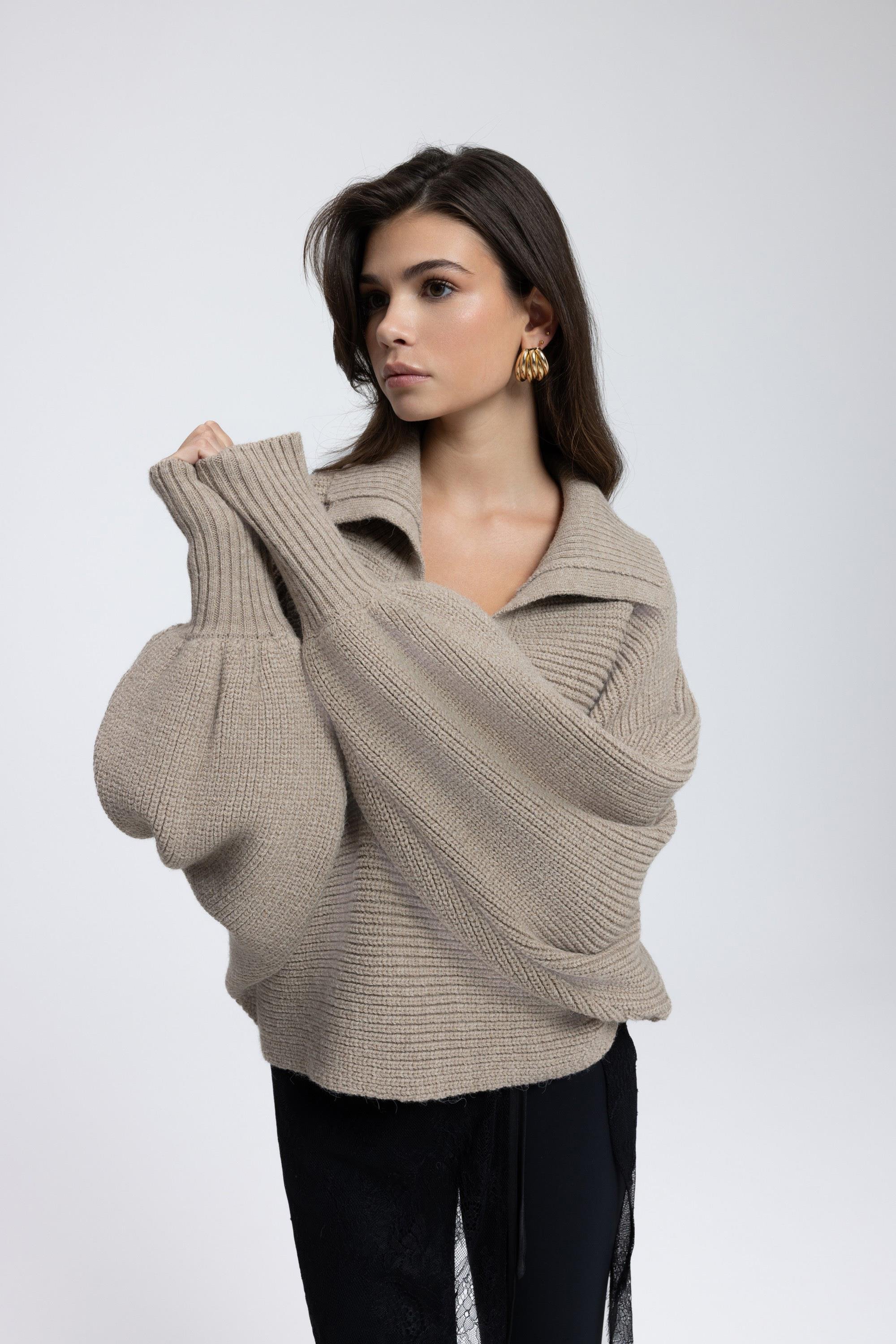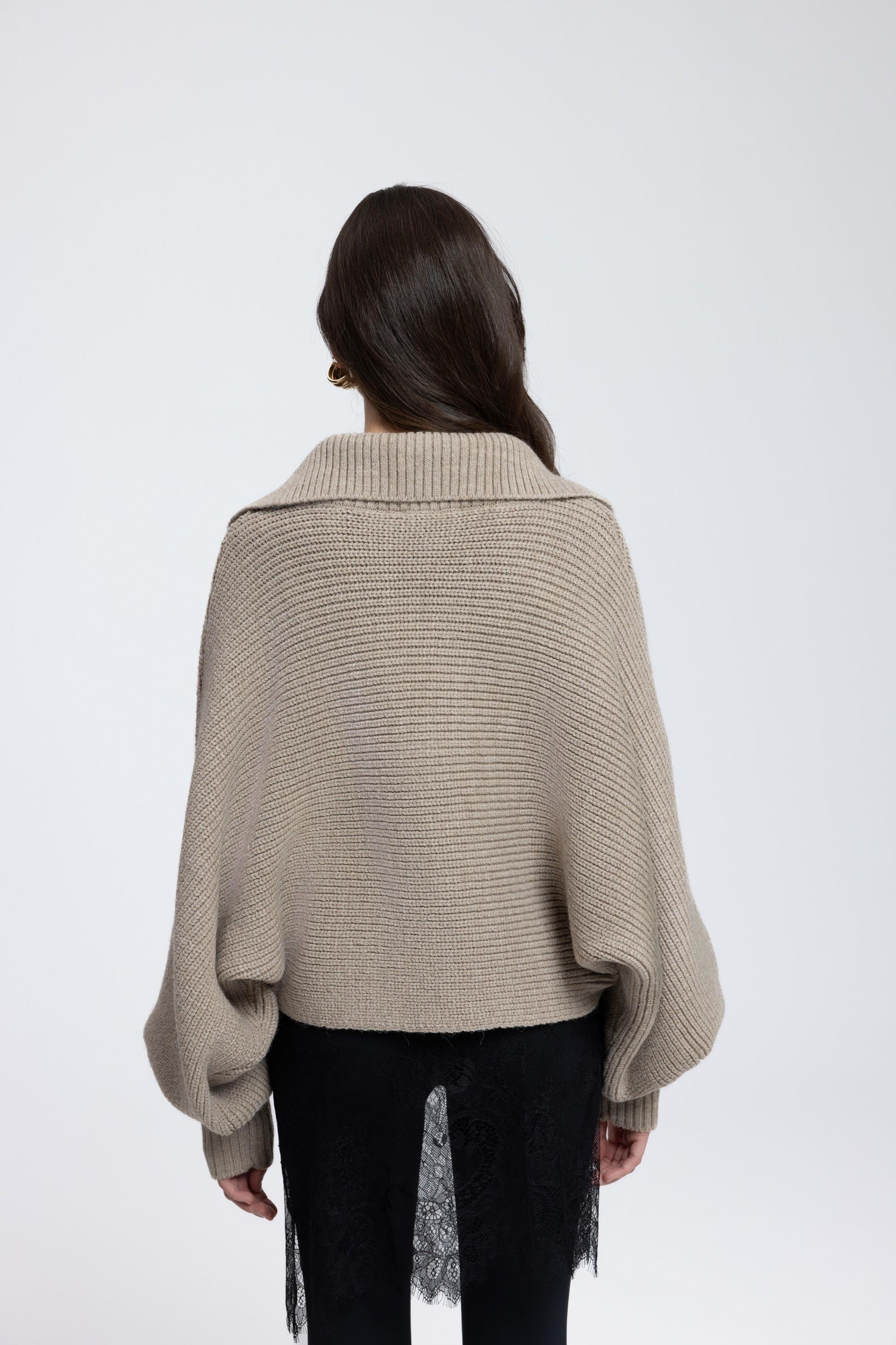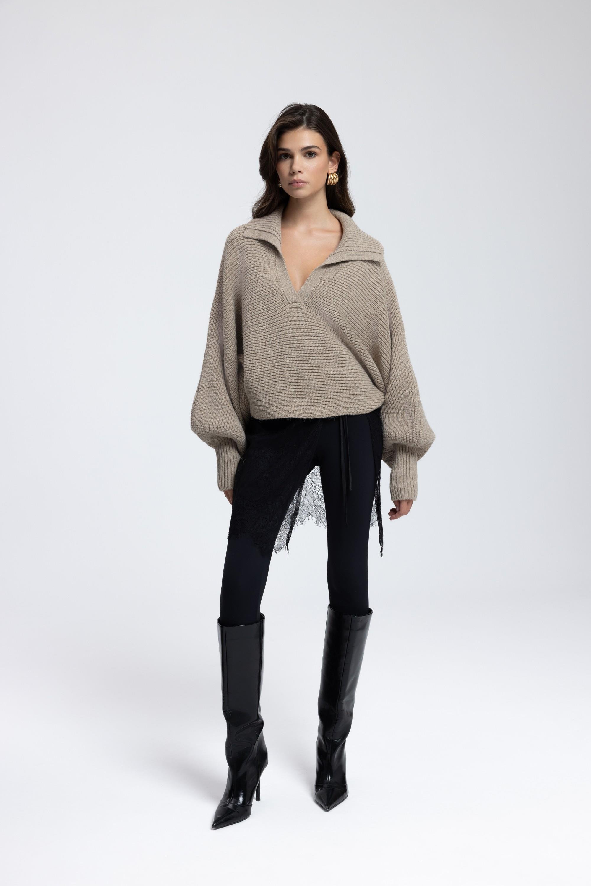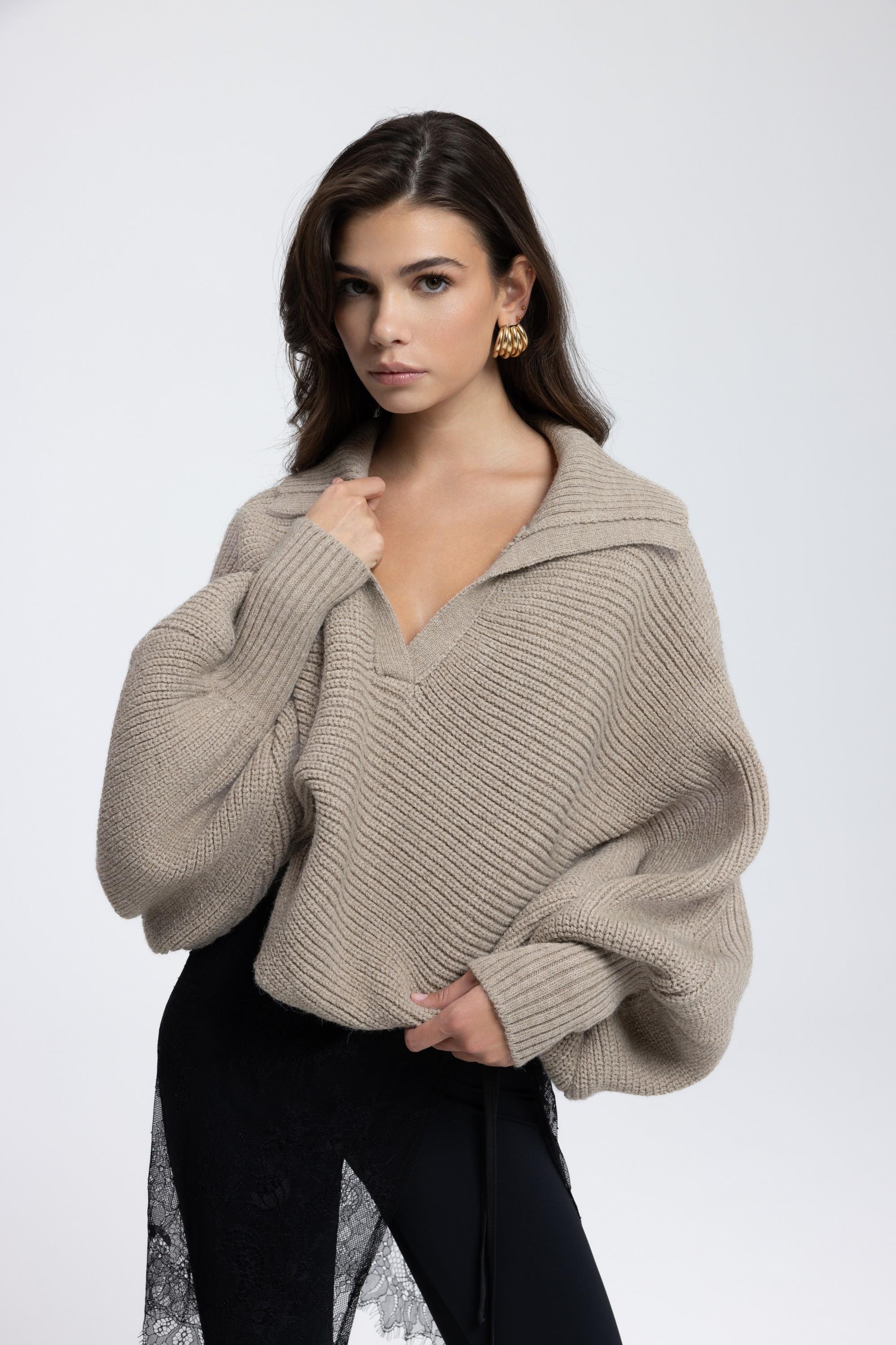 Geniş formlu, katlamalı ve derin 'V' yaka görünümlü. Kol ucu dar ve lastik örgülü, dökümlü kazak.