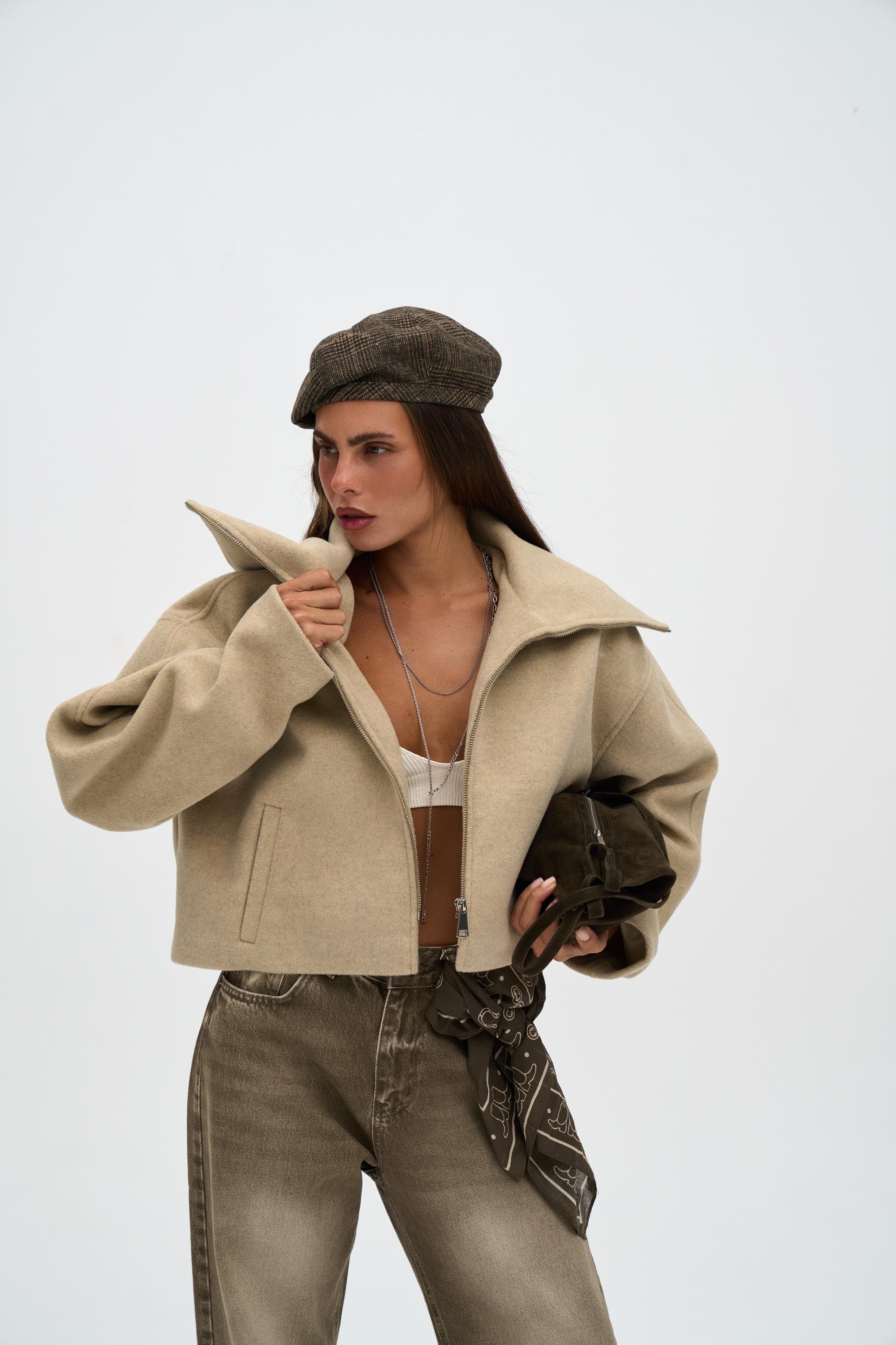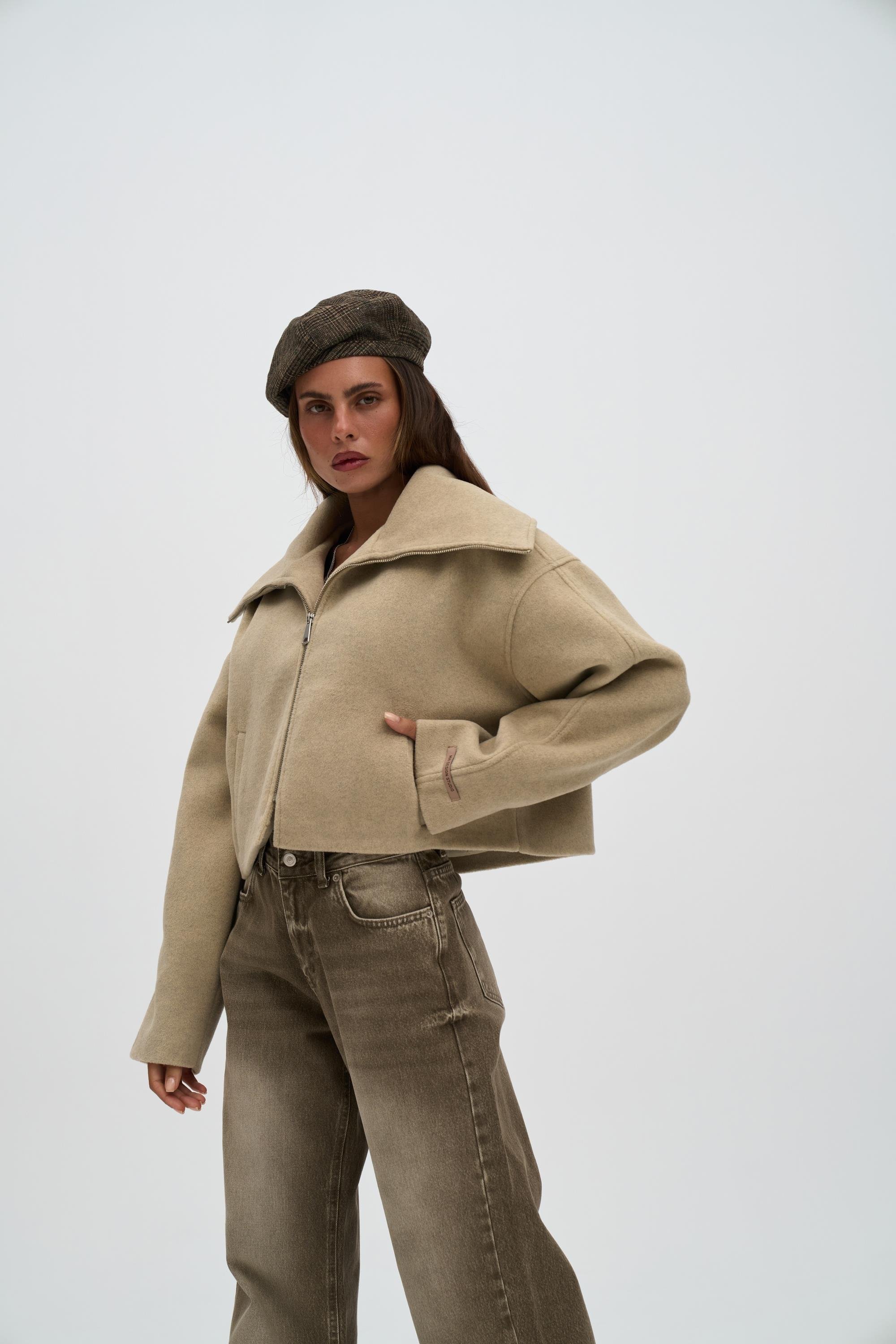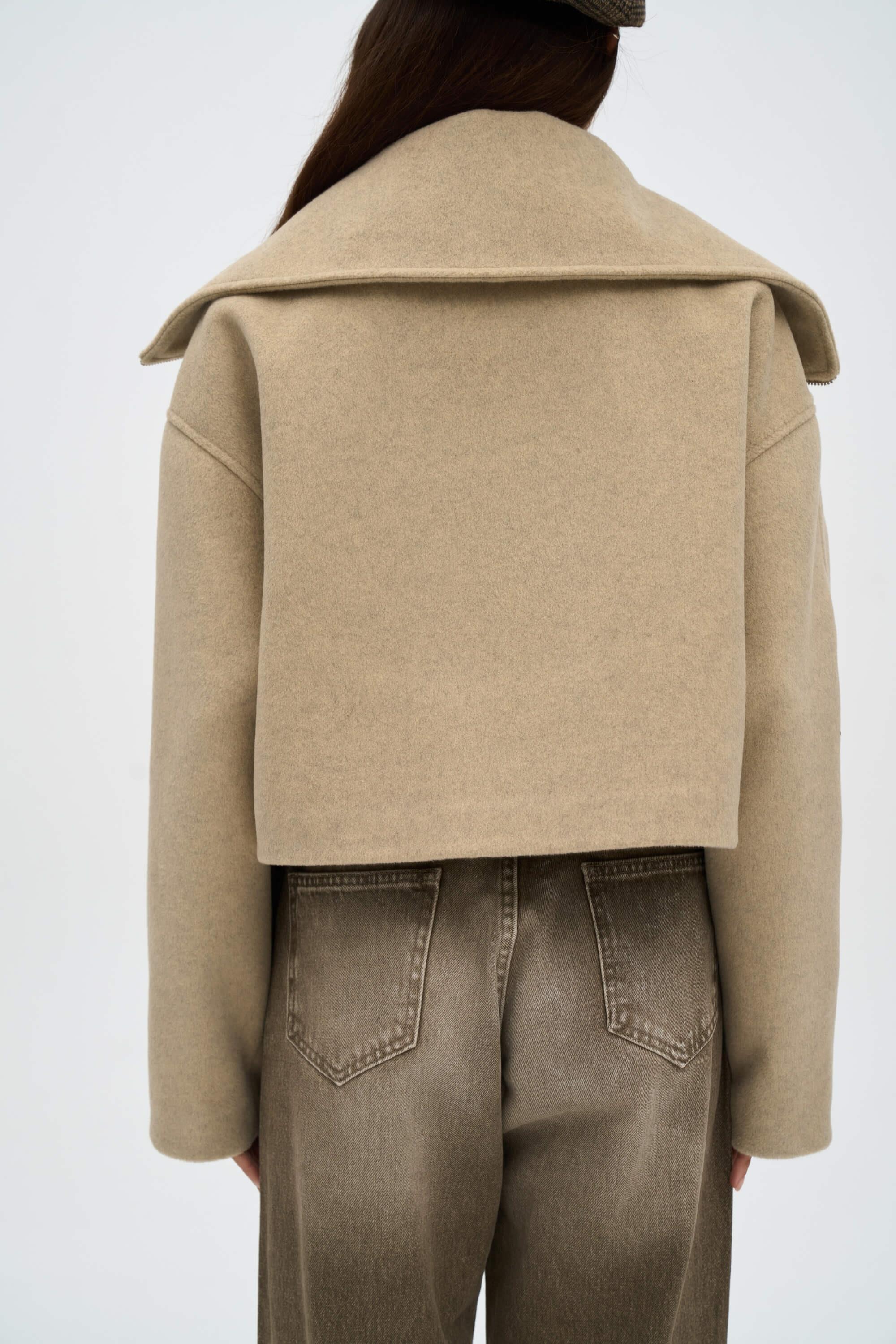 Hafif düşük kol, rahat formda, geniş yakalı, uzun kollu ve cepli, metal fermuar kapamalı, mini kaşe ceket.