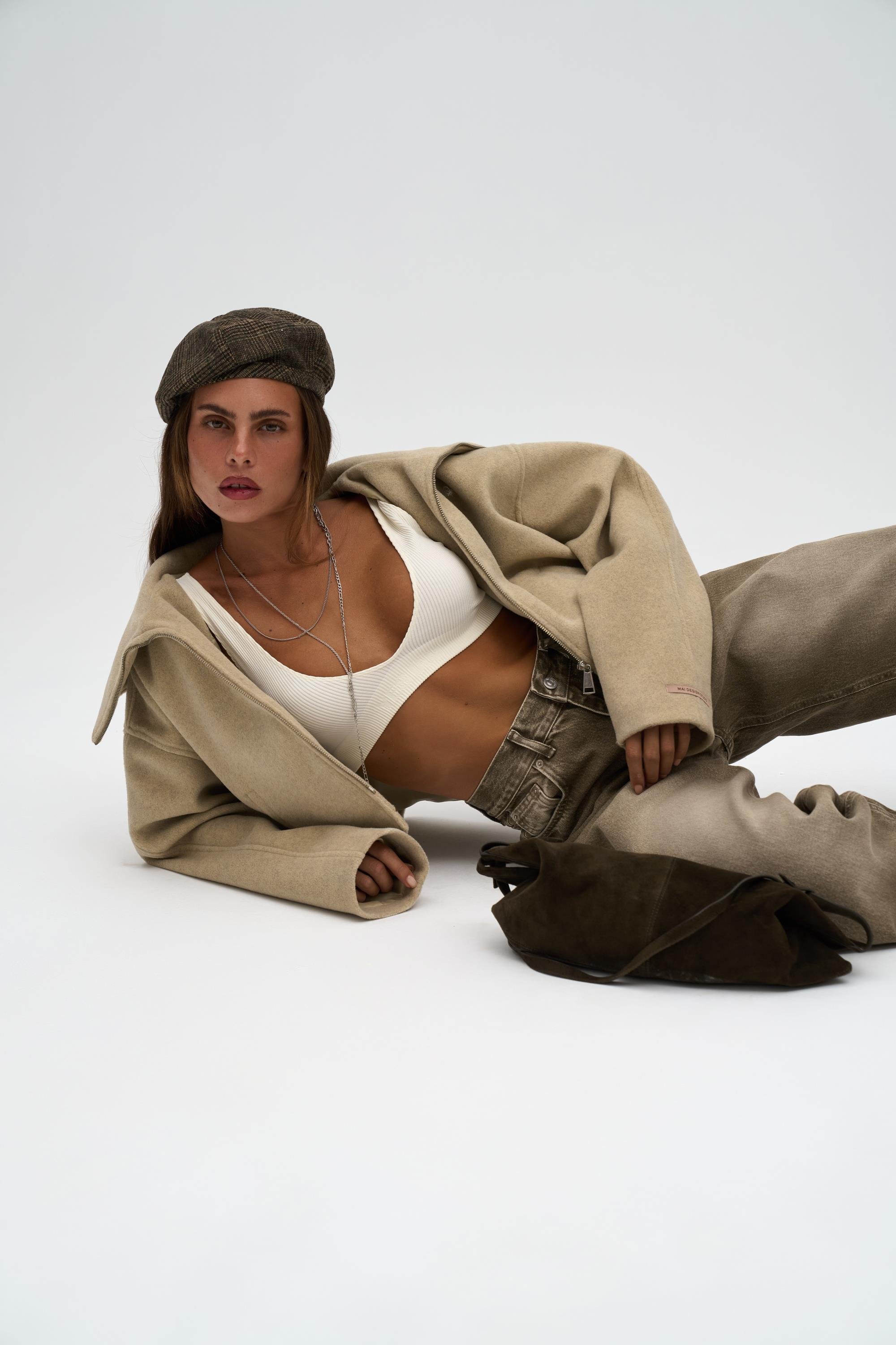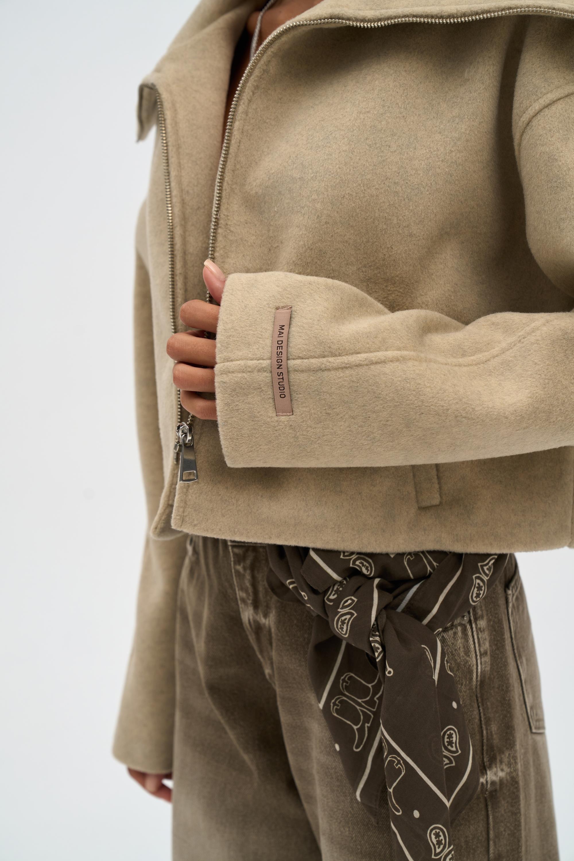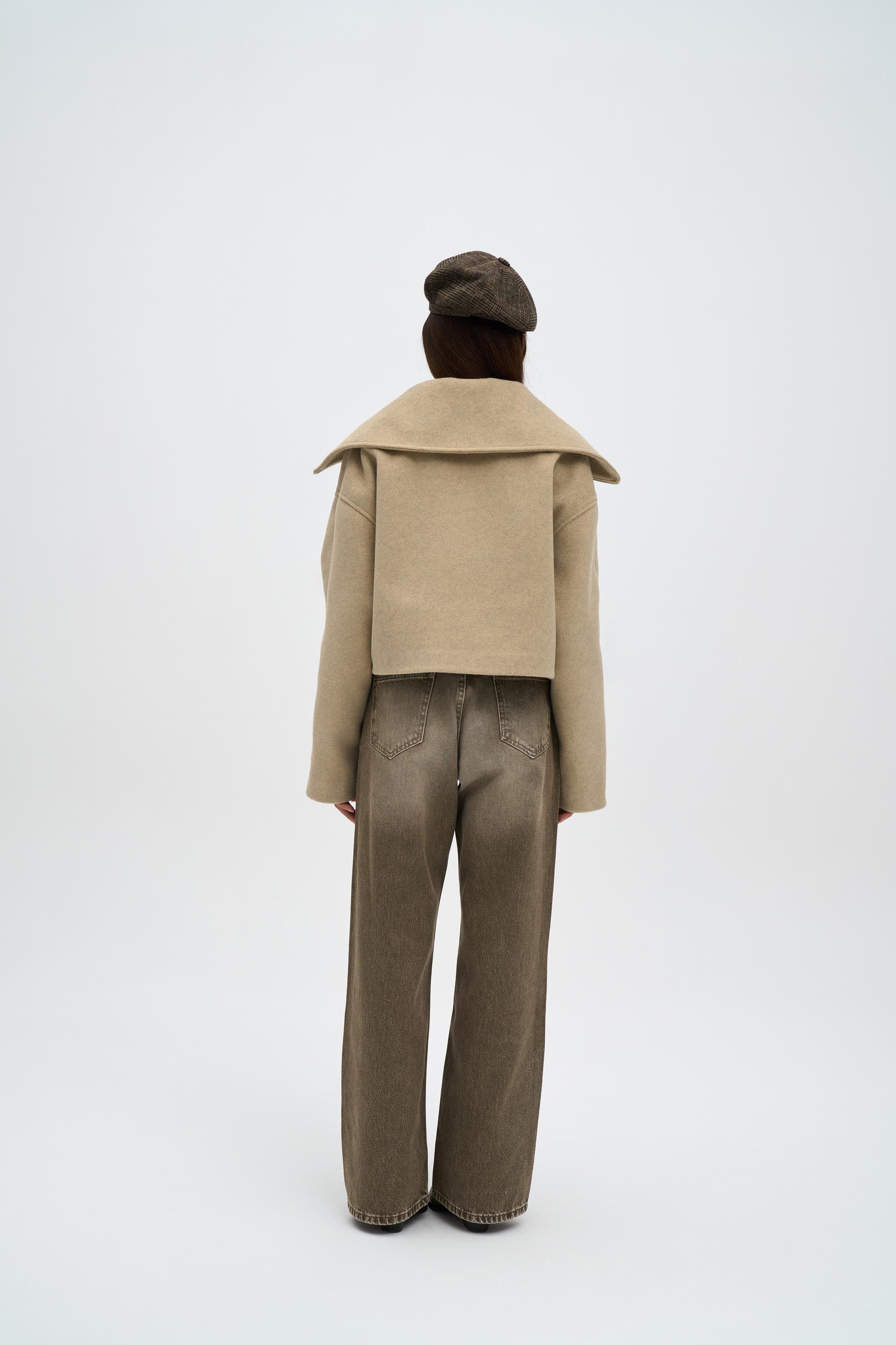 Hafif düşük kol, rahat formda, geniş yakalı, uzun kollu ve cepli, metal fermuar kapamalı, mini kaşe ceket.