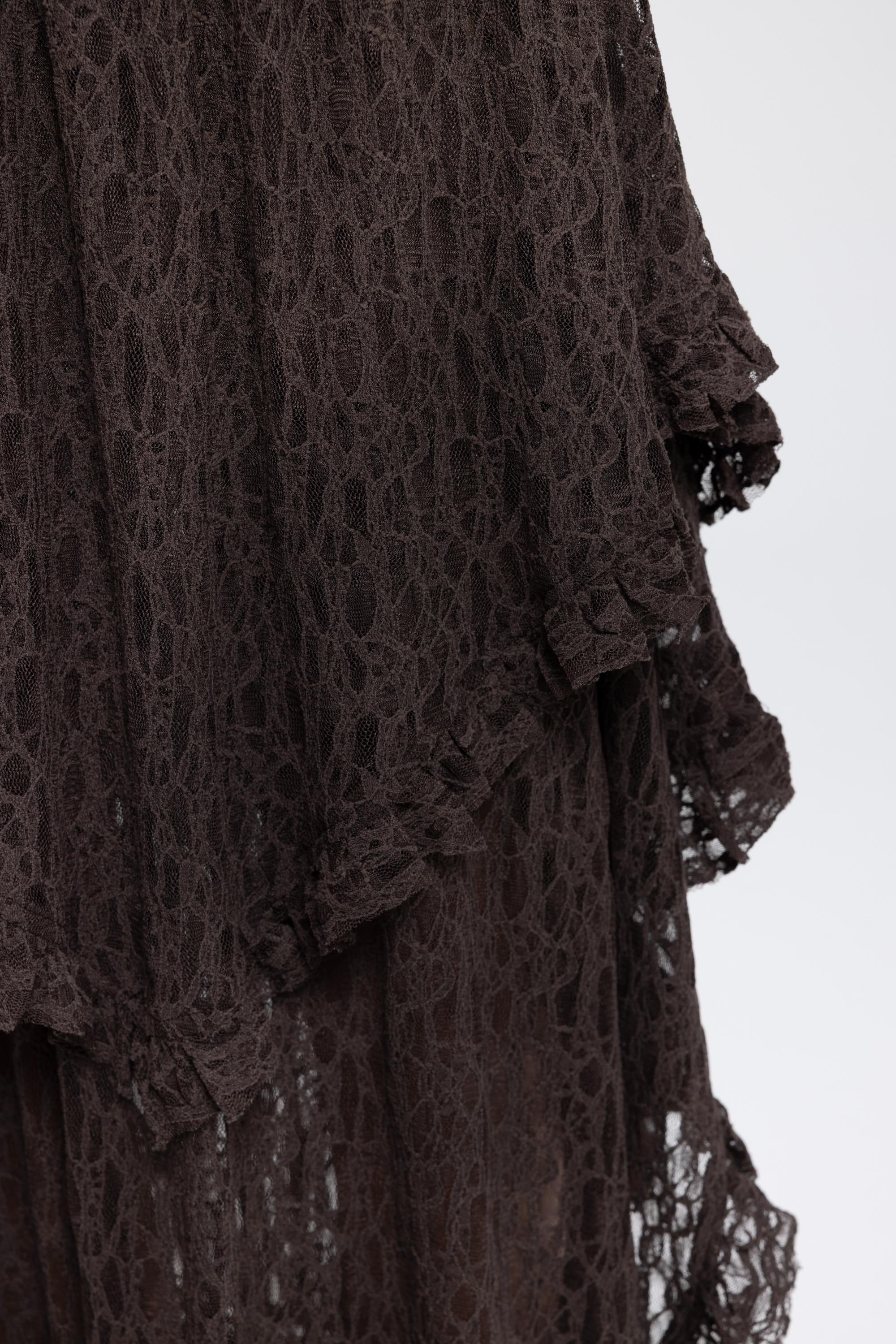 Beli büzgülü, lastikli, rahat formlu. Çift kat ve astarsız. Mendil kesim, fırfır detaylı midi asimetrik dantel etek.