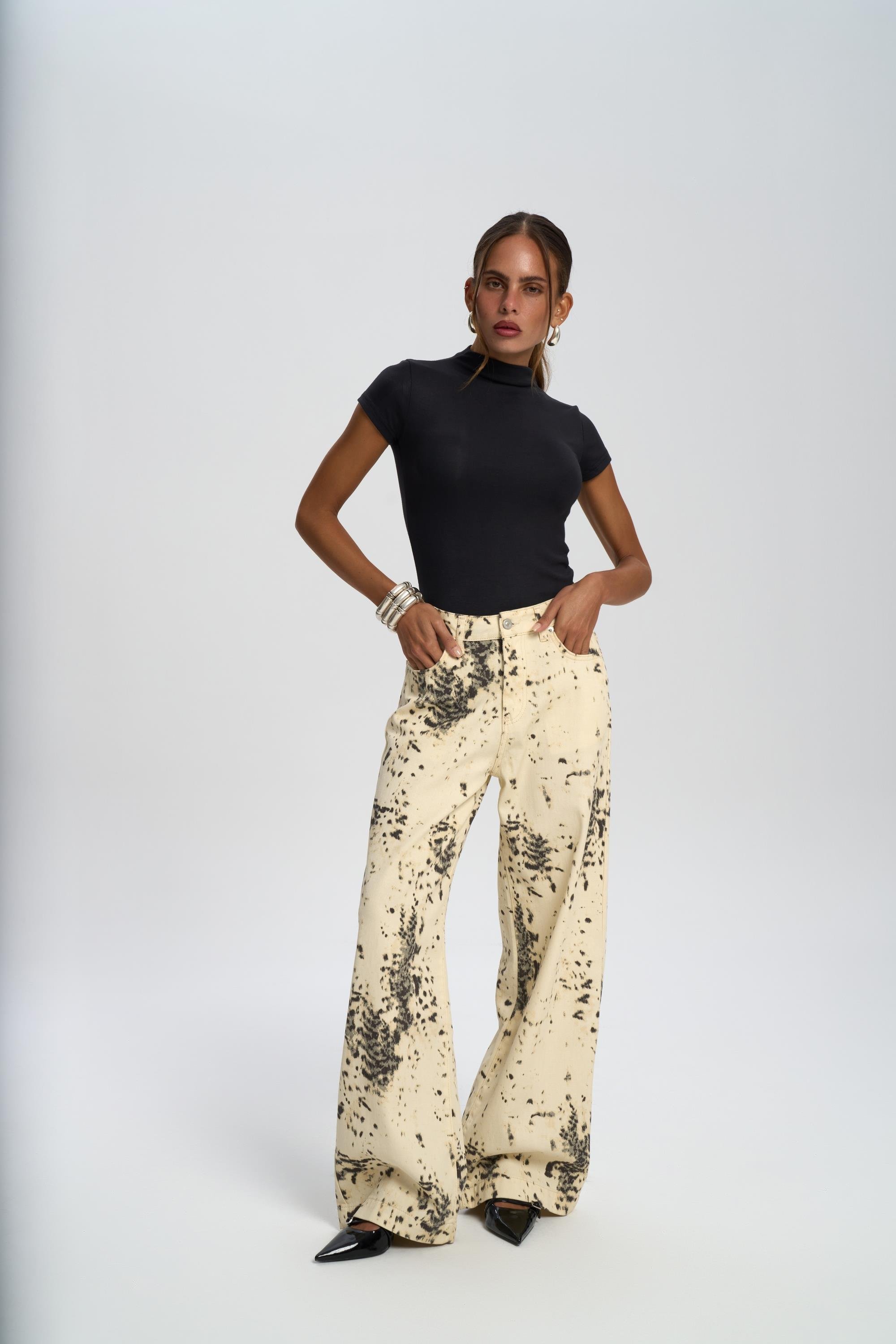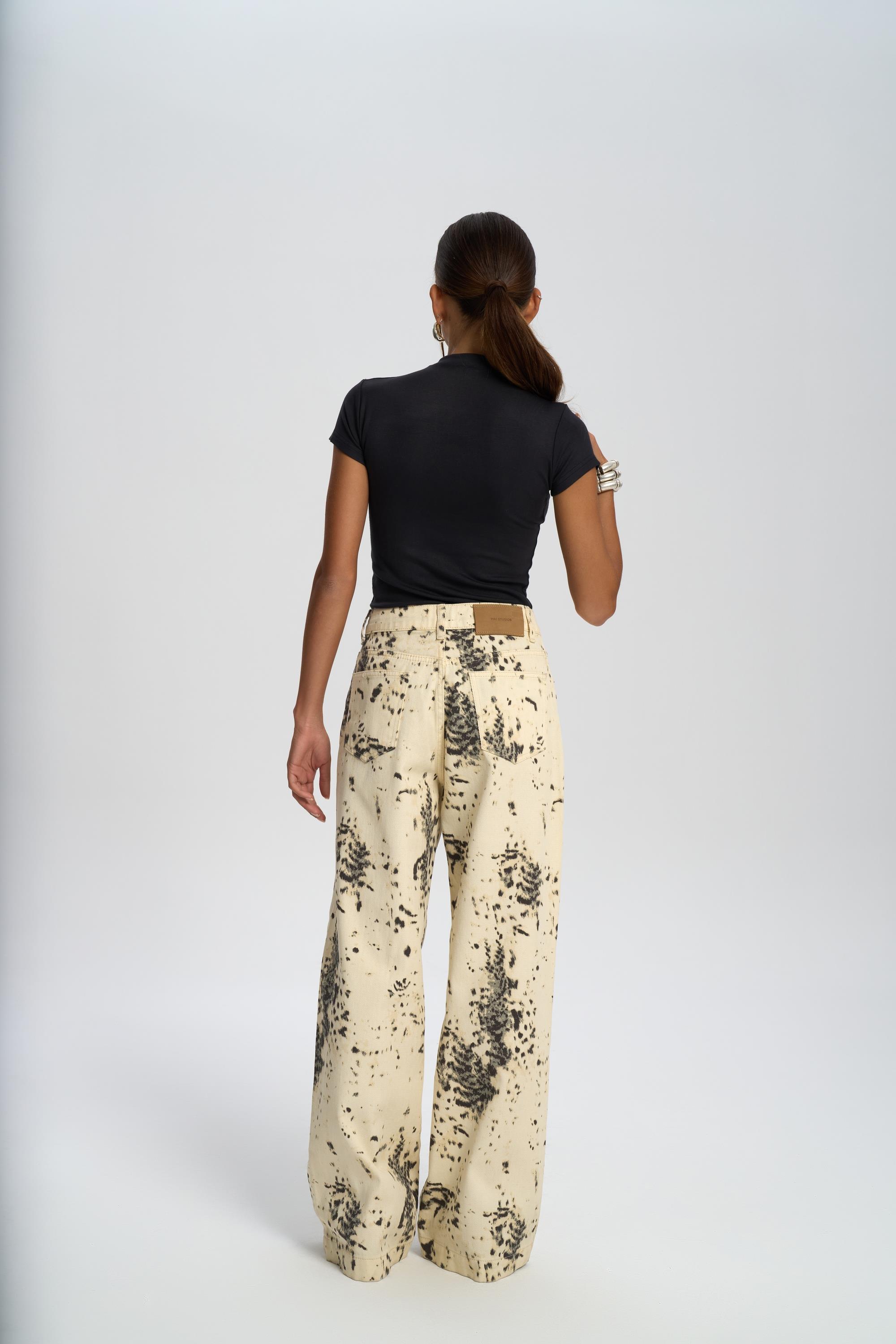Yüksek bel, bol kesim, fırça desenli jean pantolon. Beş cepli, önü fermuarlı ve metal düğme kapamalı.