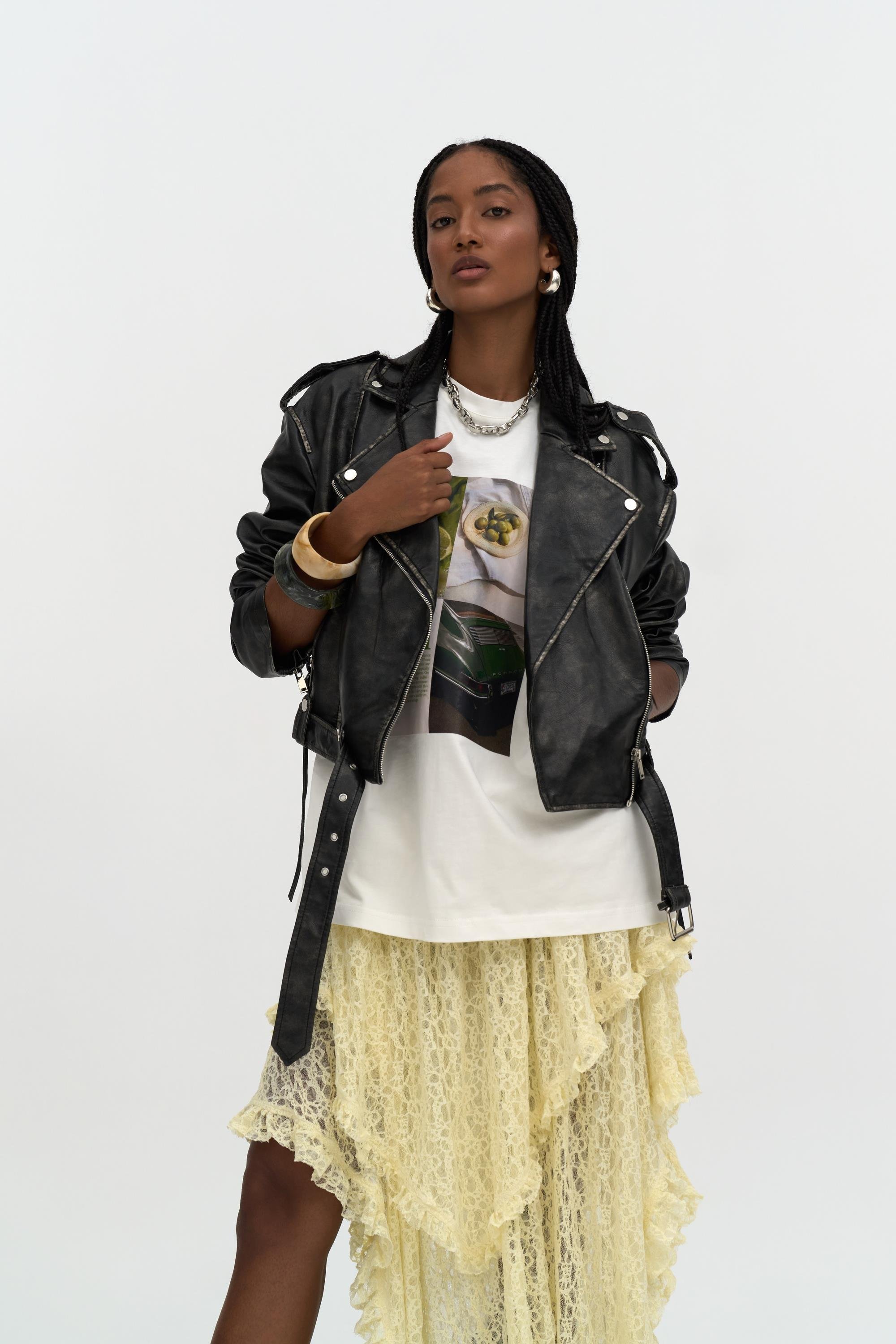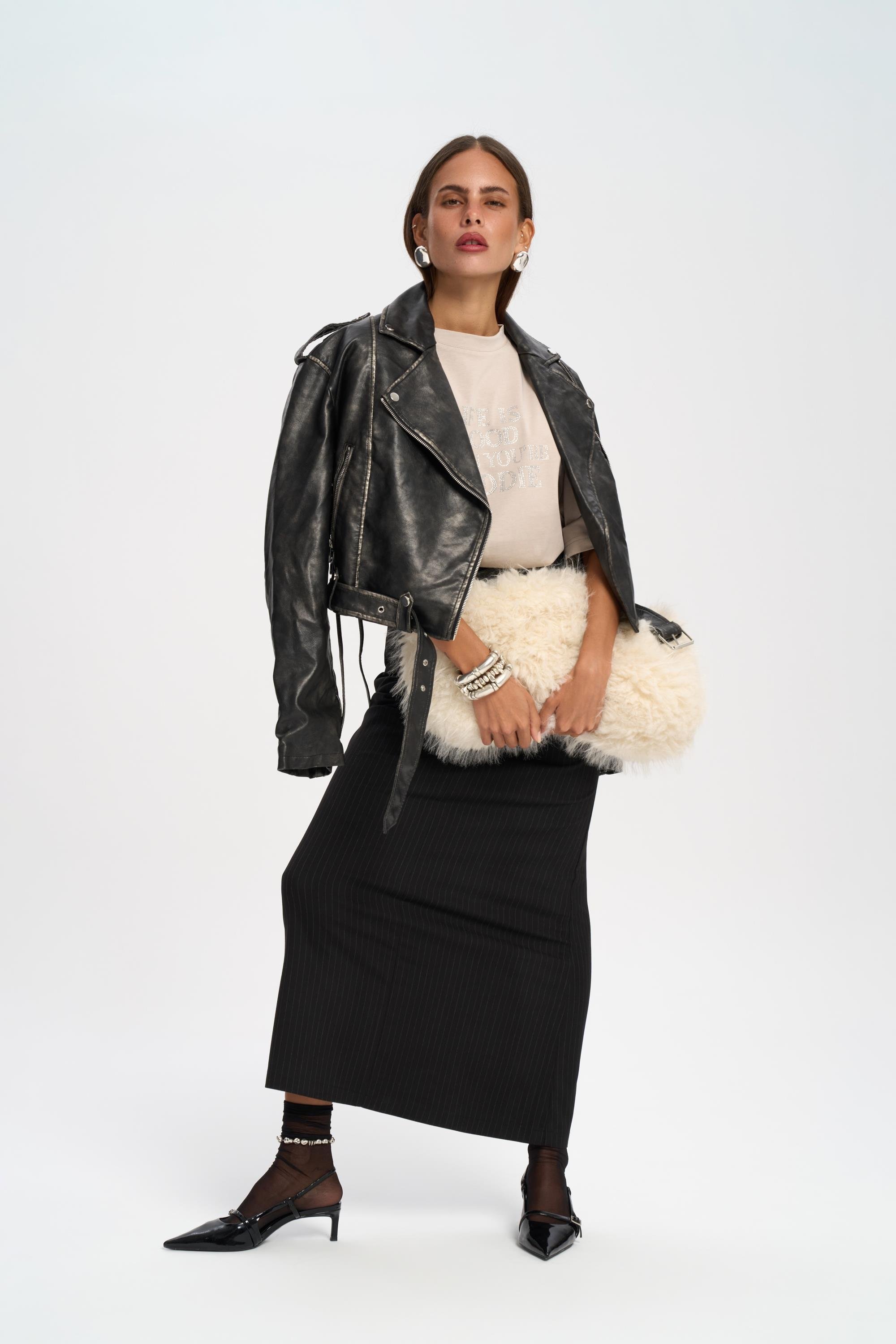 Asimetrik fermuar kapamalı, bedene oturan formda. Arka korsaj detaylı, metal aksesuarlı, suni deri ceket.
