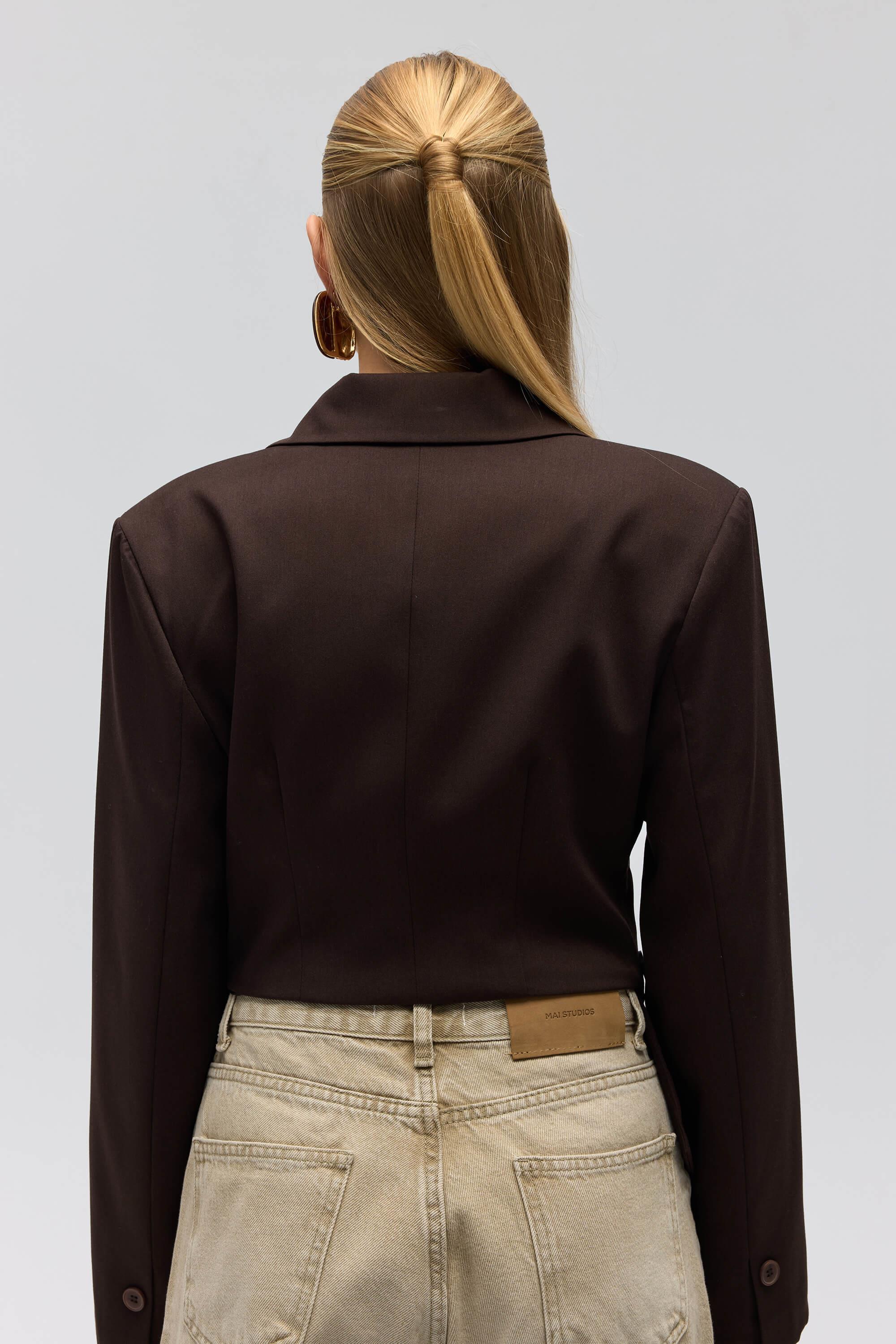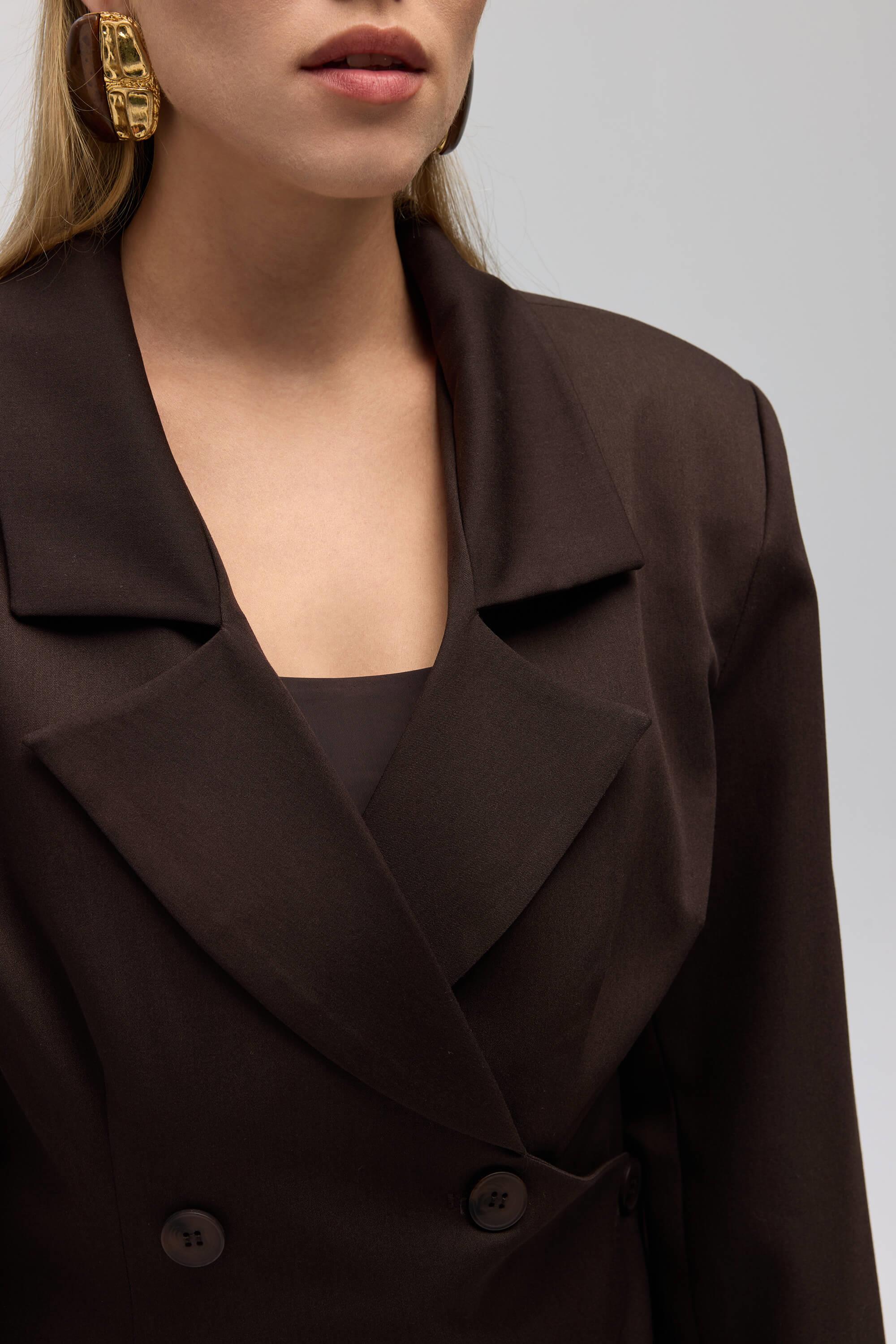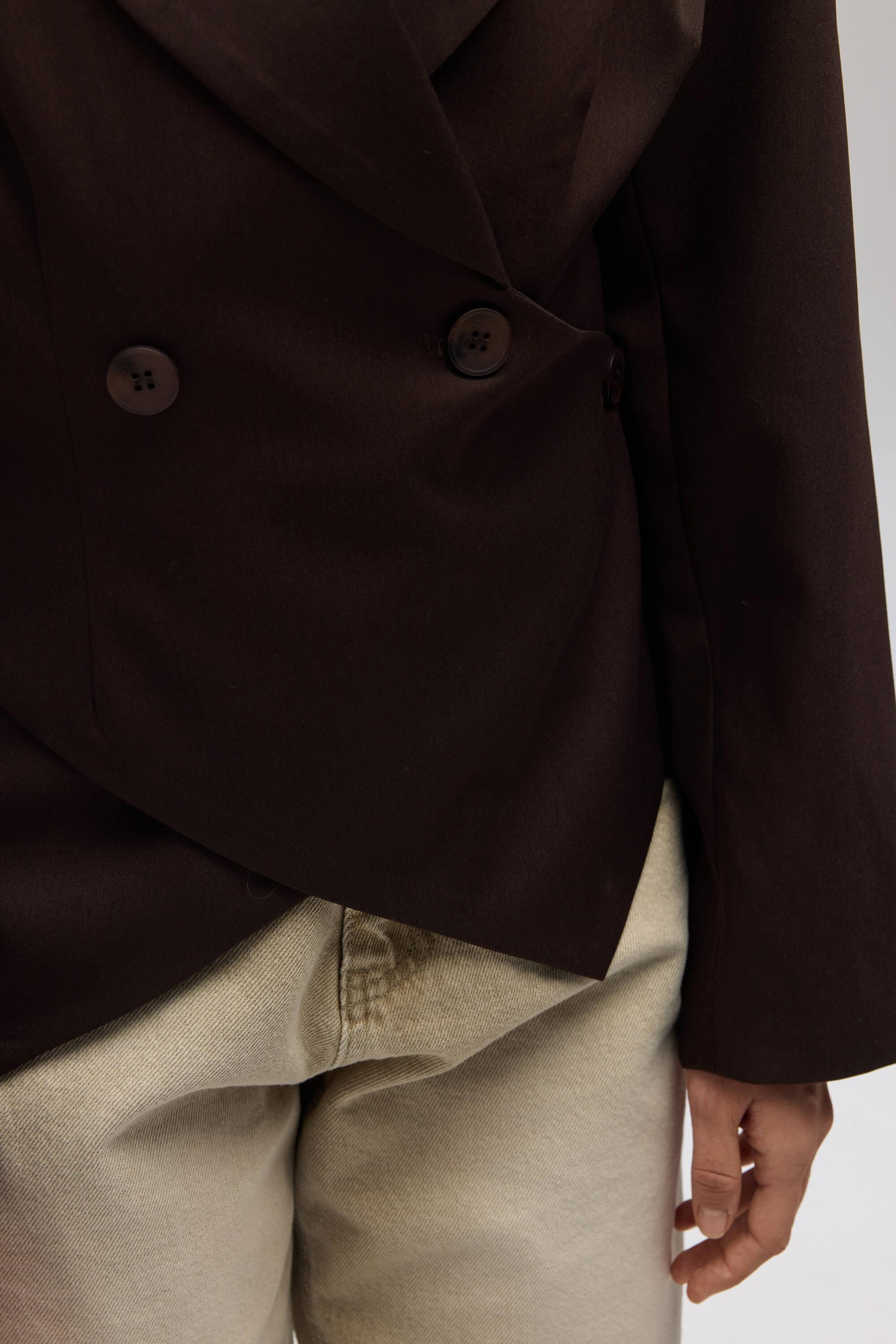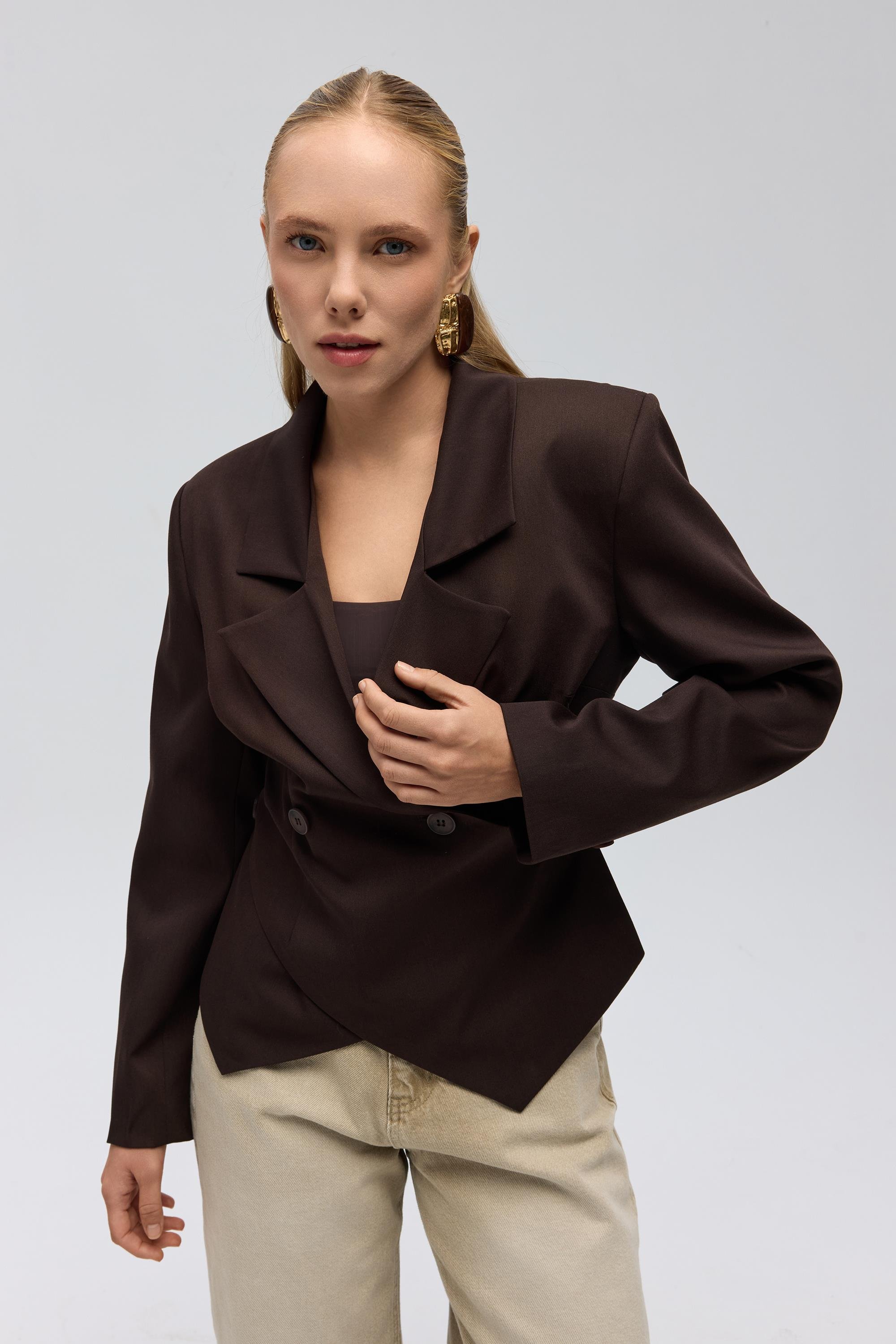 Ön kısımda çapraz asimetrik kesim detaylı tasarım blazer ceket. Belden oturtmalı, omuzları vatkalı, uzun kollu, manşetleri düğmeli, yalancı cep görünümlü. Kruvaze düğme kapamlı. Astarlı özel tasarım.