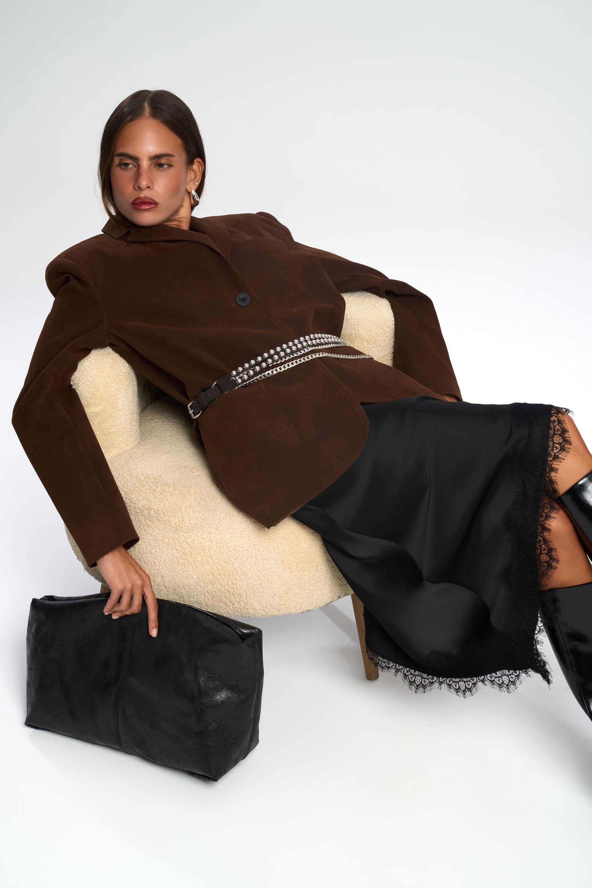 Oversize, düz formlu düşük omuz, vatkalı önü çift düğmeli ve kullanılabilir yan cepli, süs peto cepli süet blazer ceket.