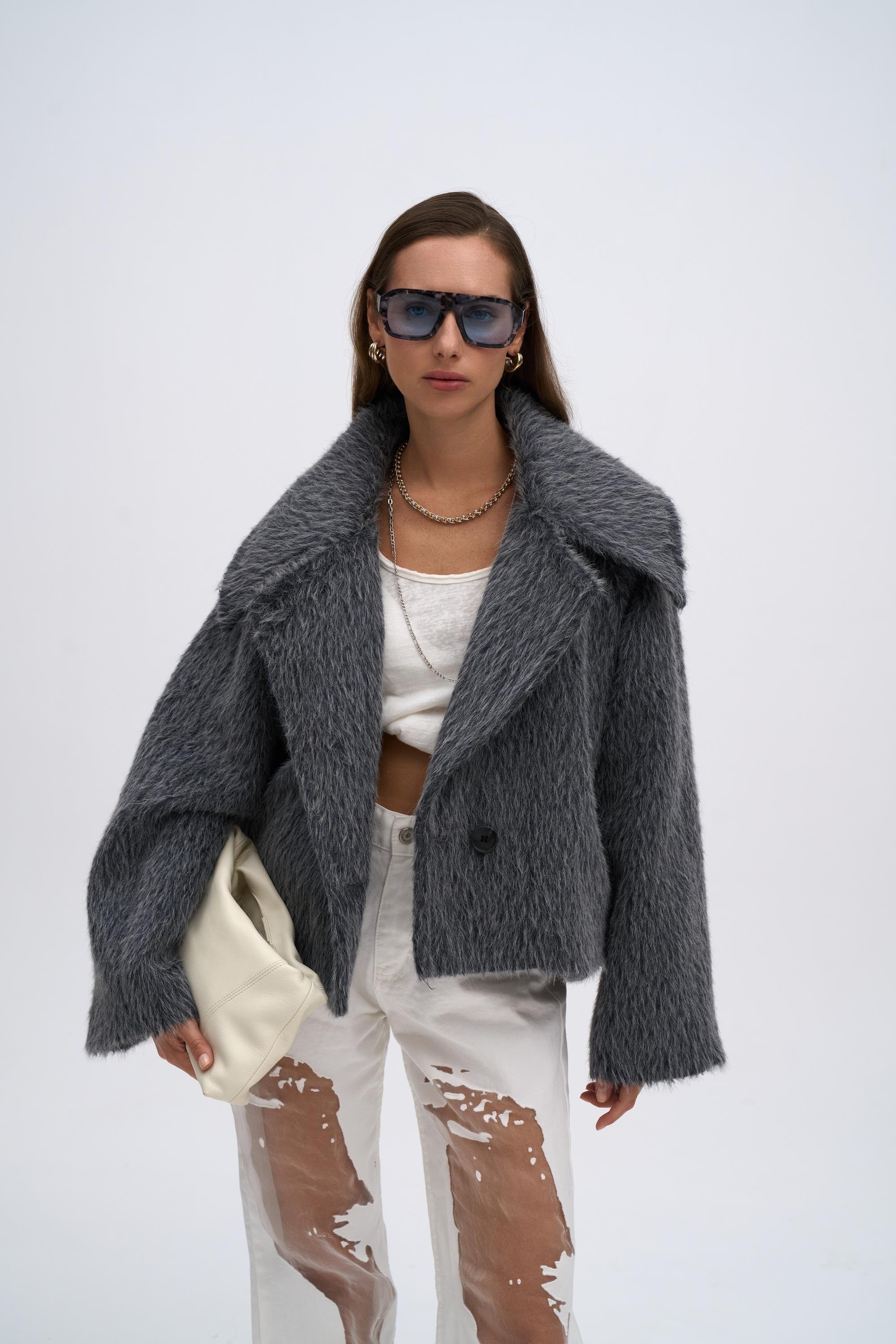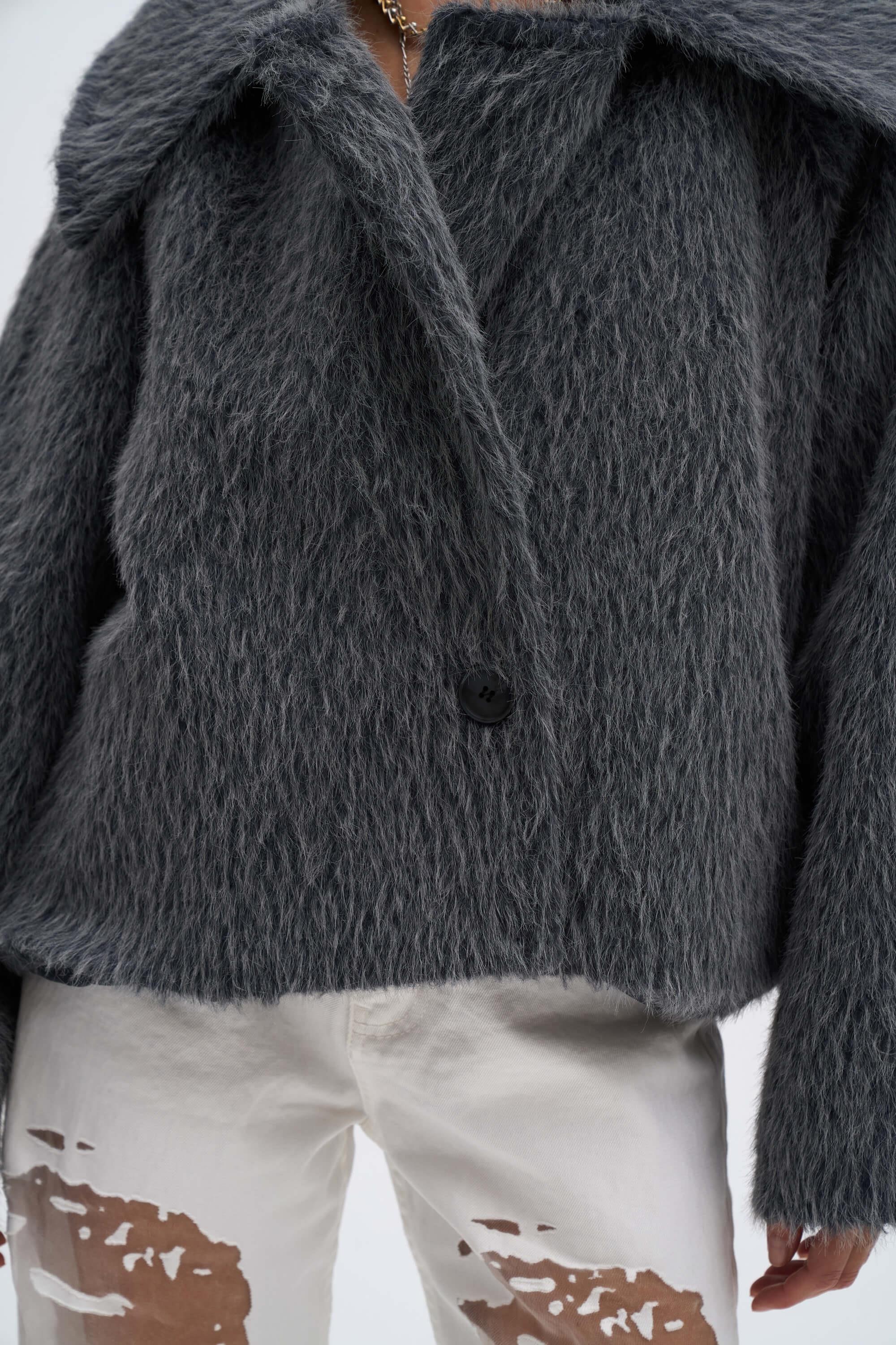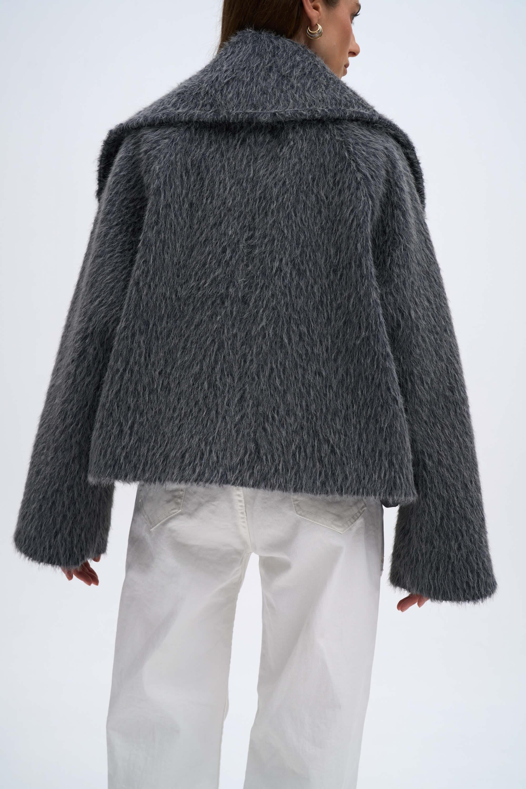 Reglan kol, rahat kalıp, geniş yakalı ve tek düğme detaylı. Kalın, kısa ceket.