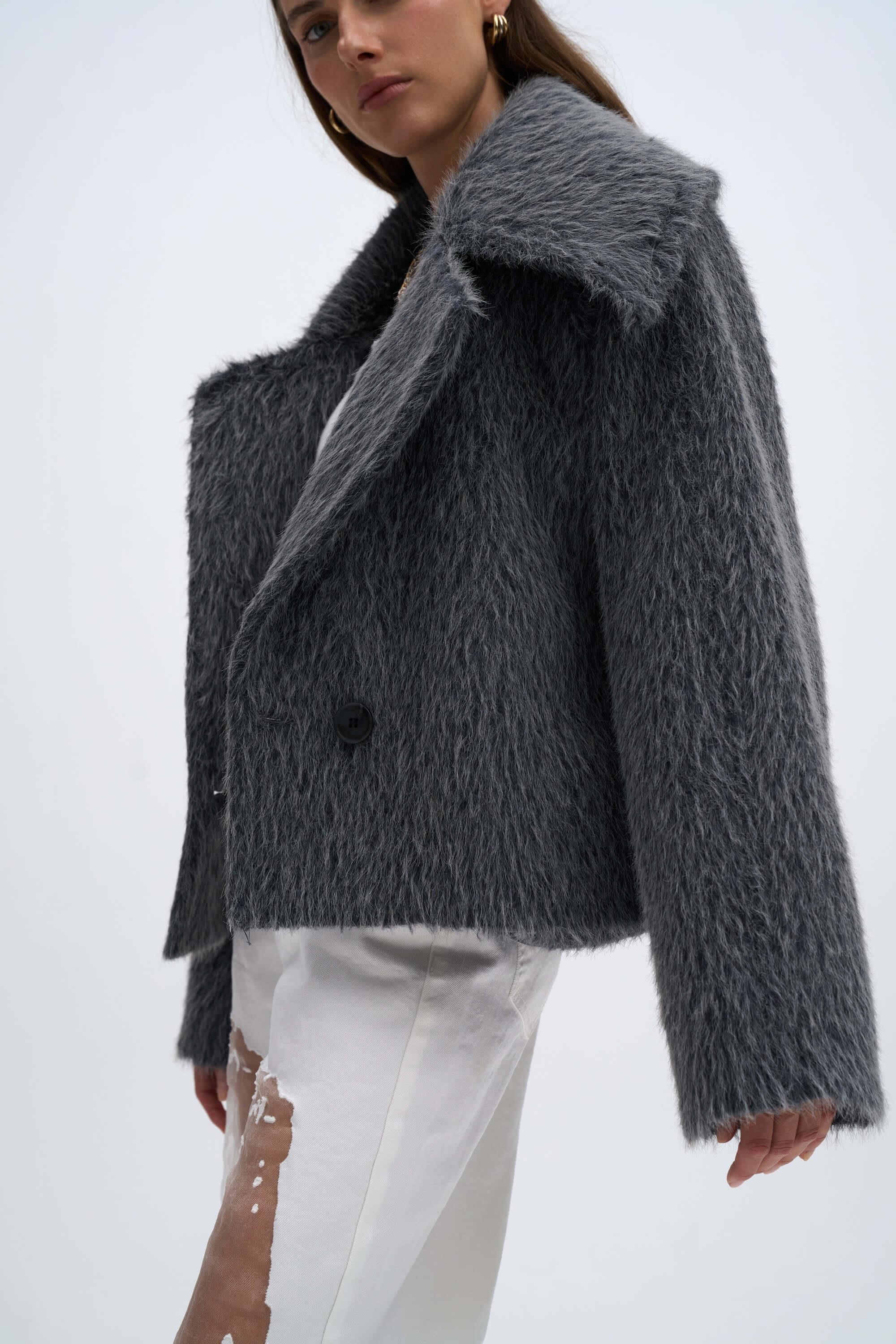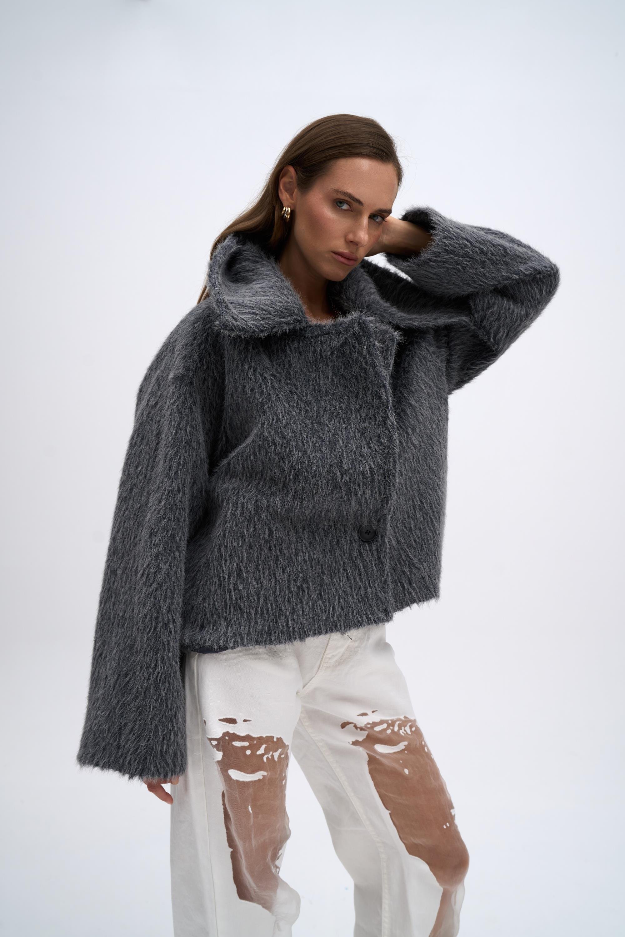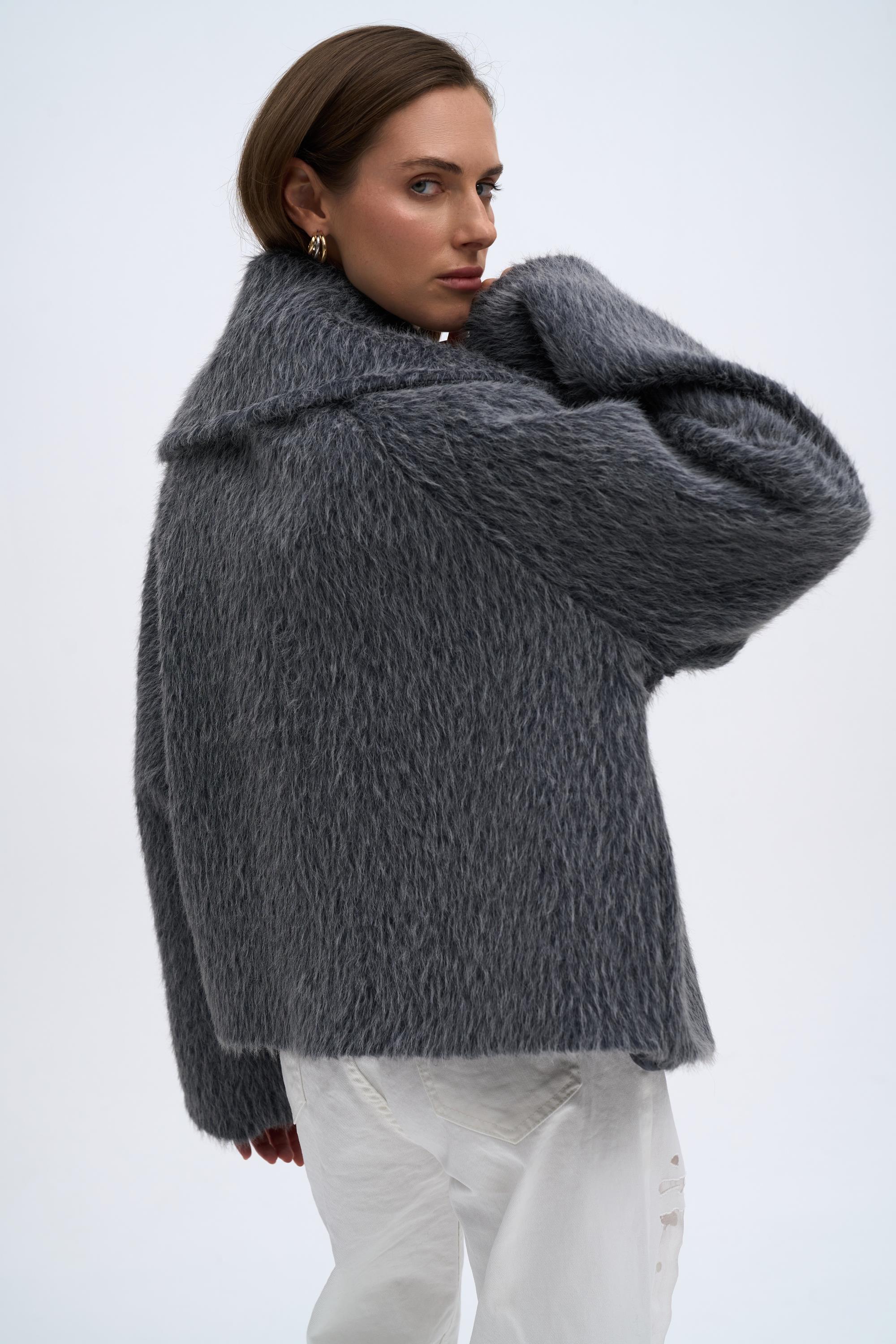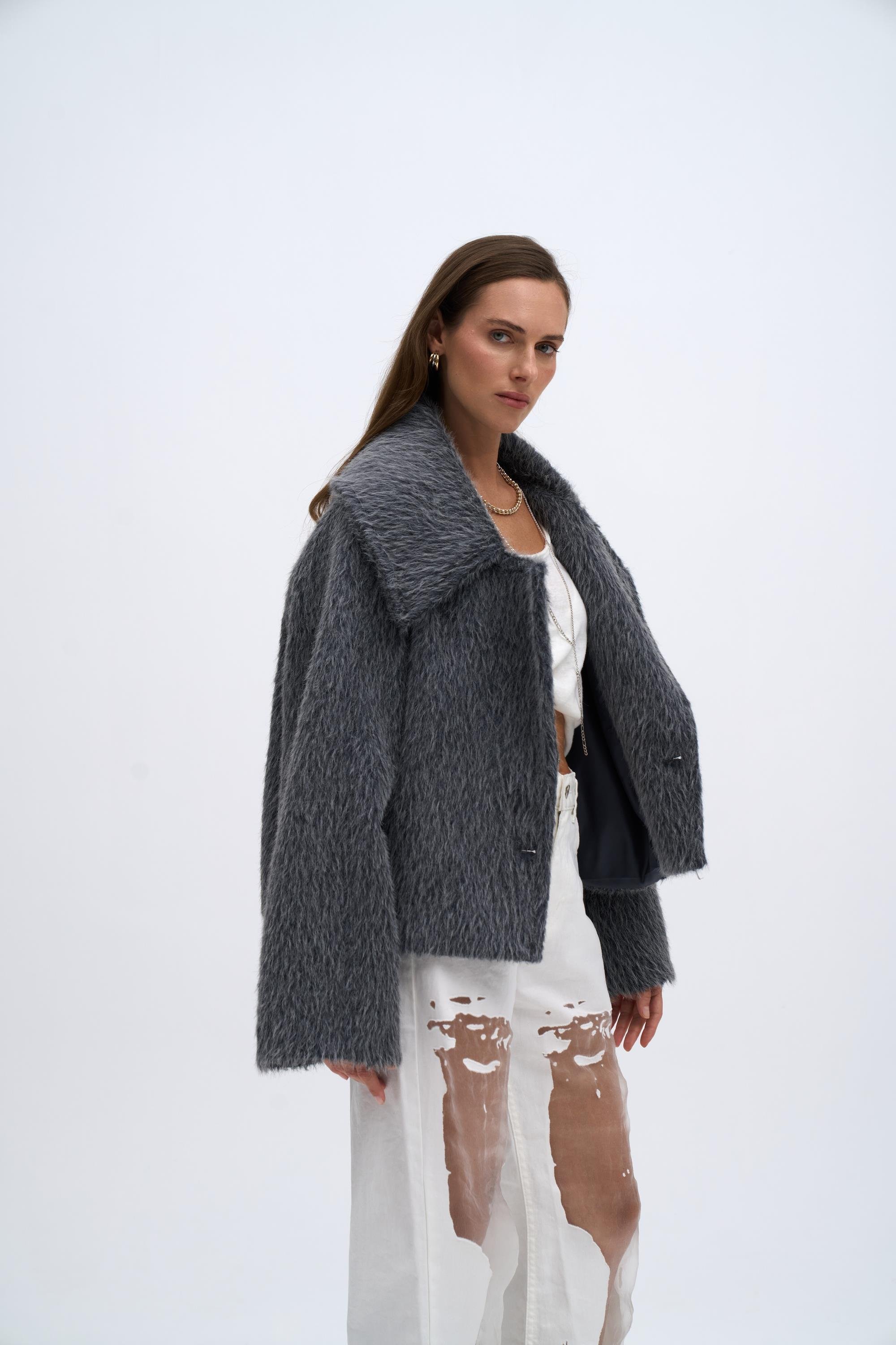 Reglan kol, rahat kalıp, geniş yakalı ve tek düğme detaylı. Kalın, kısa ceket.