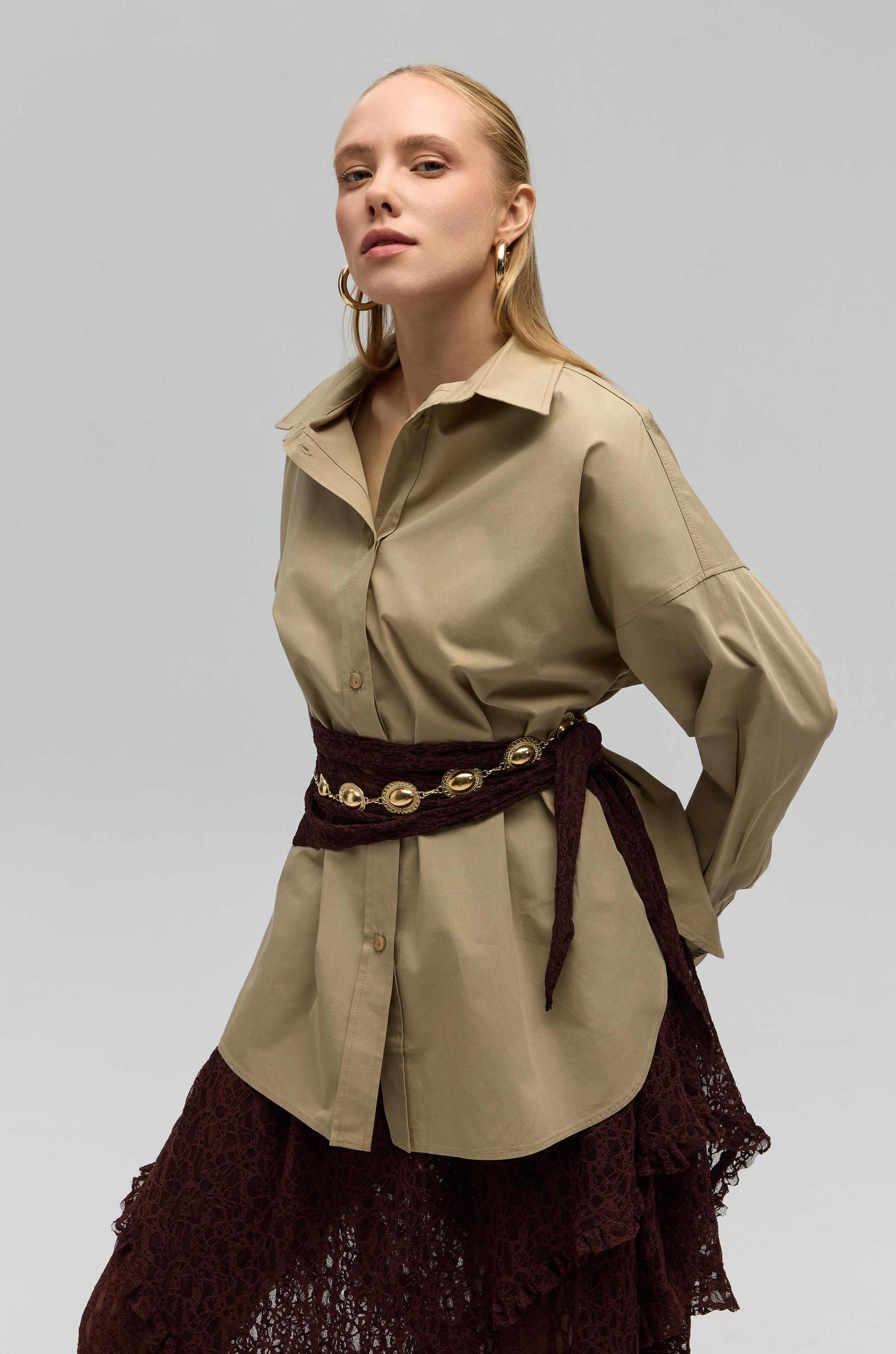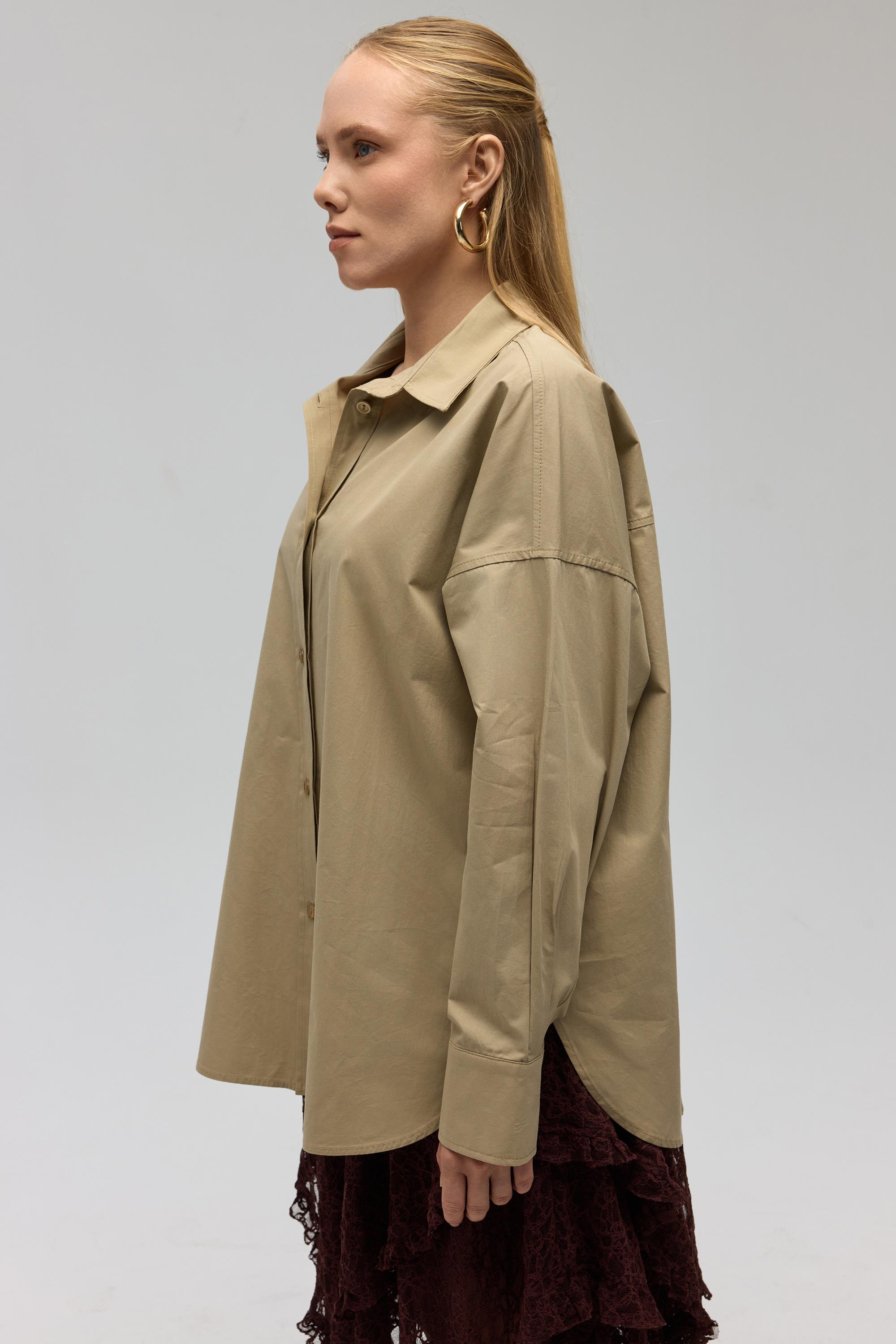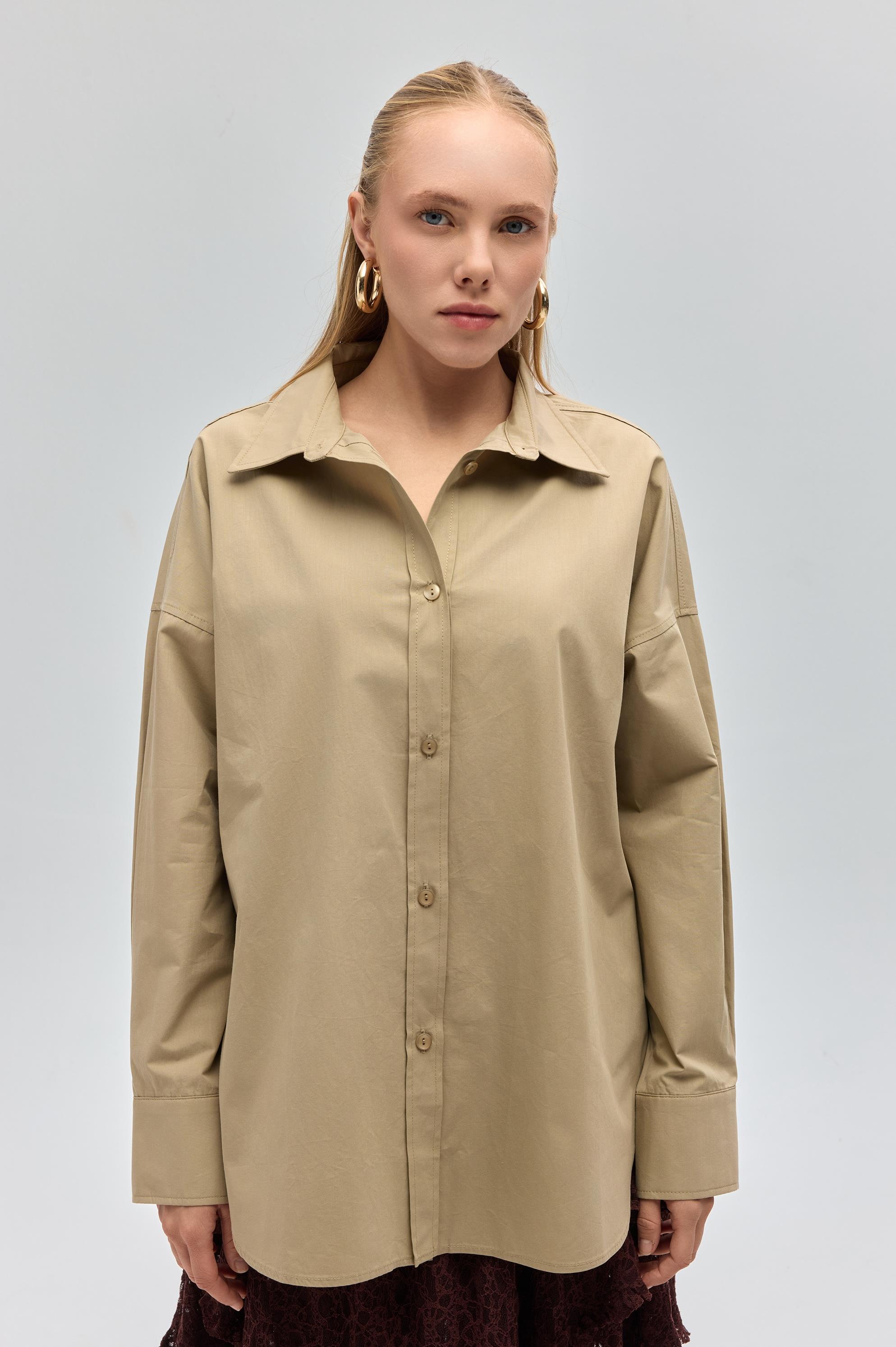 Gömlek yaka, uzun kollu ve önü düğmeli oversize gömlek.