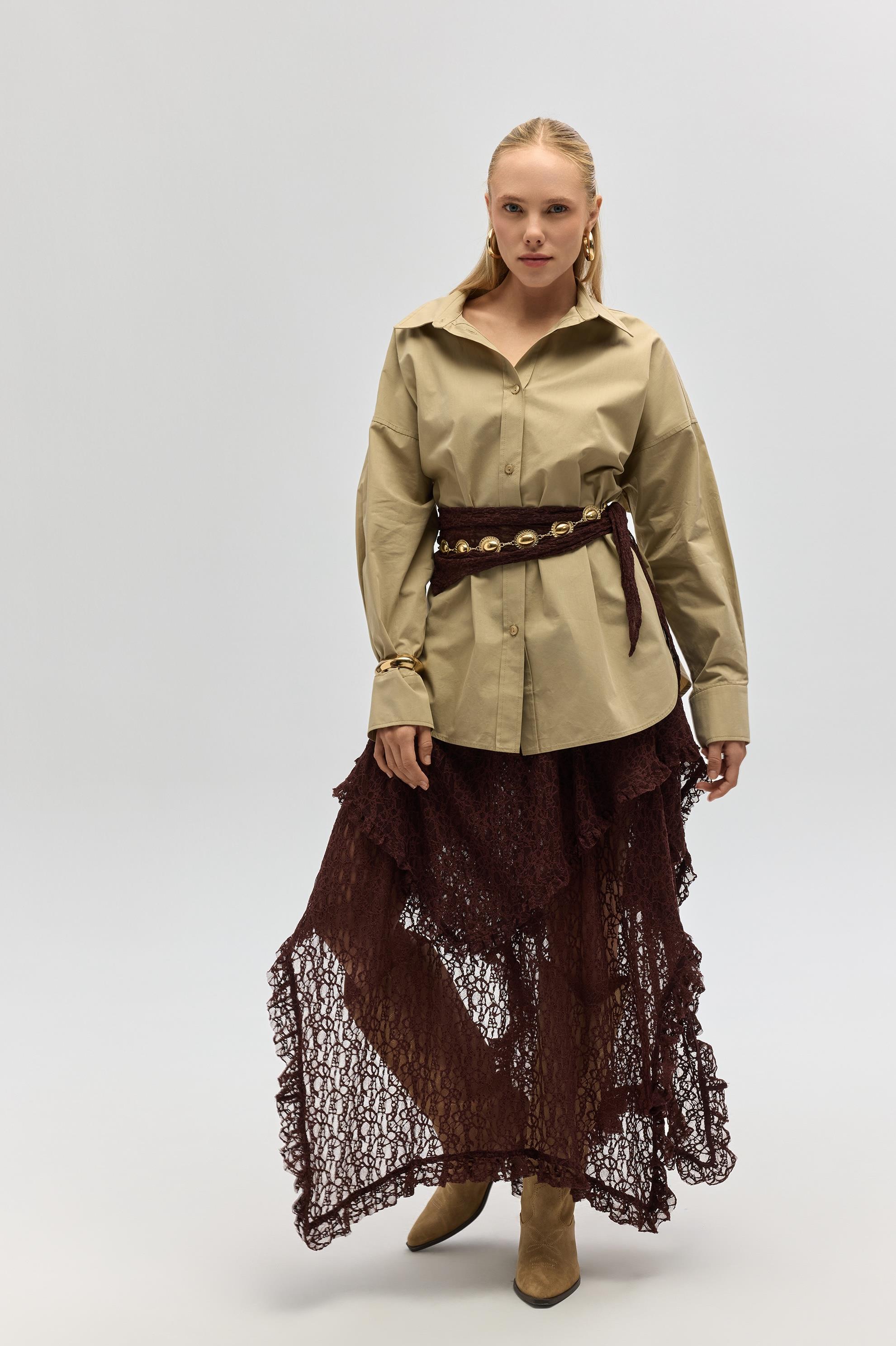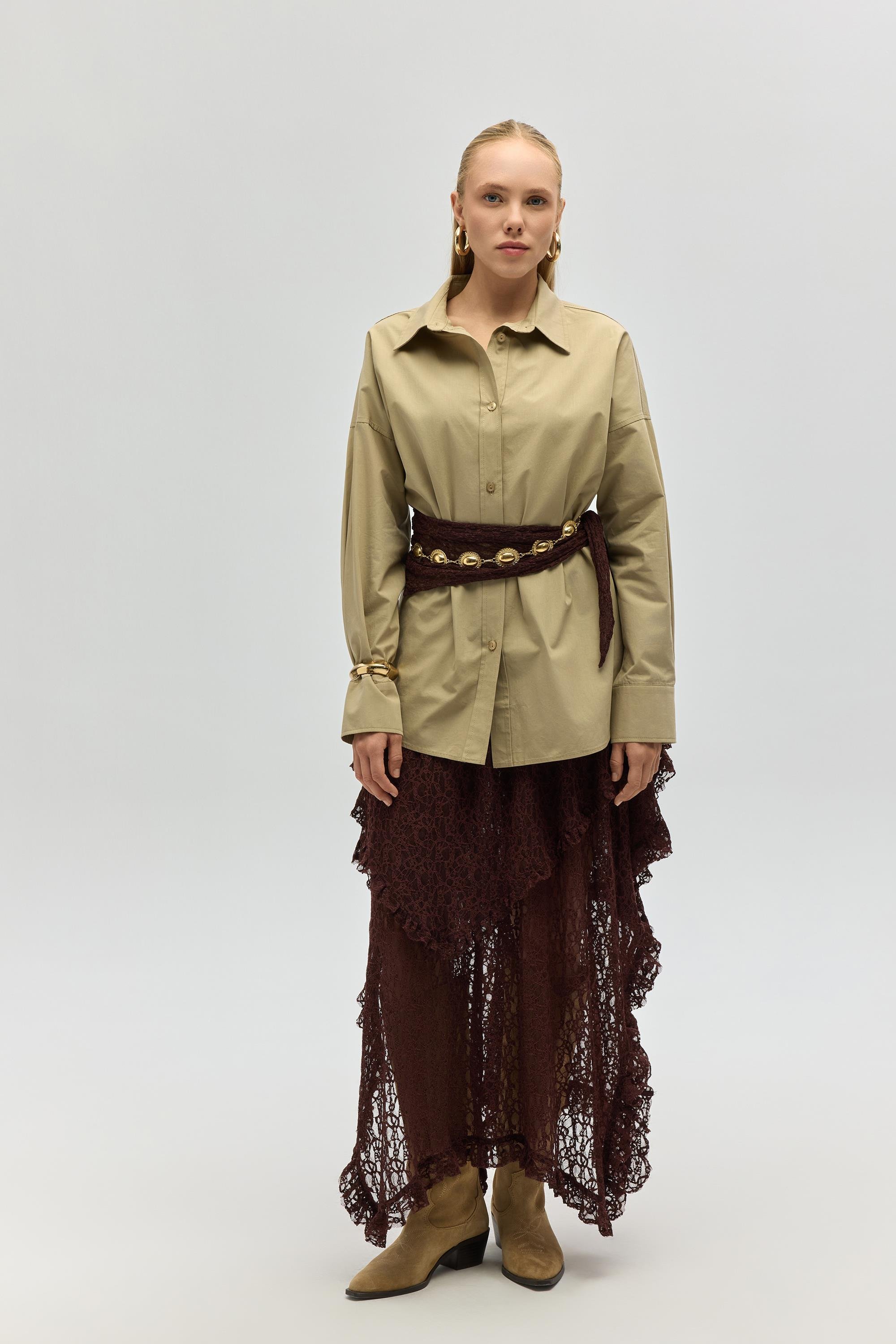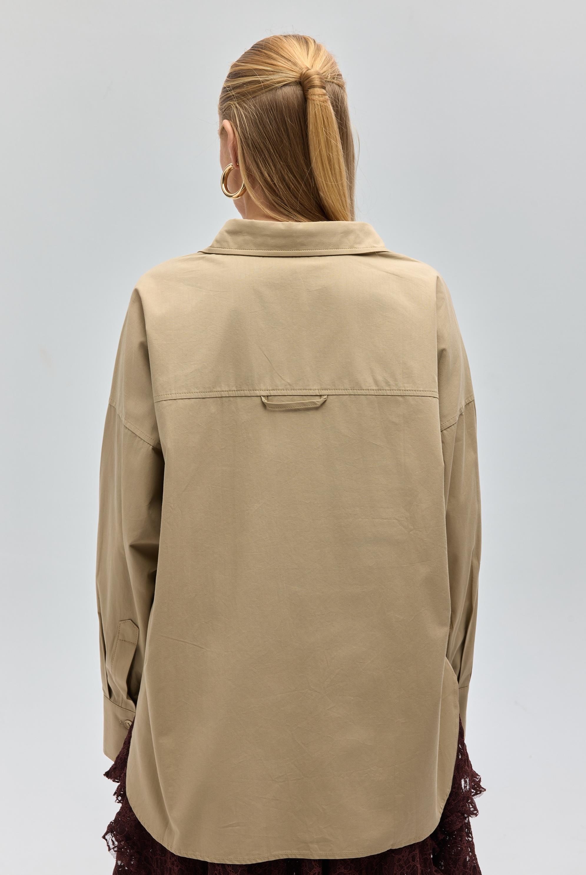Gömlek yaka, uzun kollu ve önü düğmeli oversize gömlek.