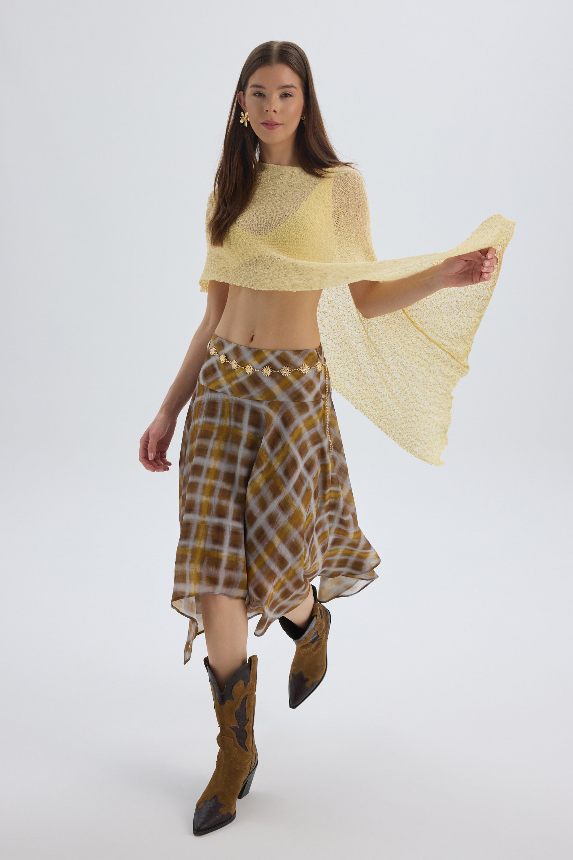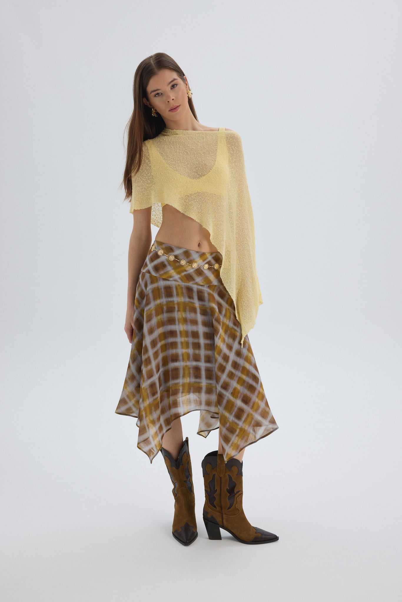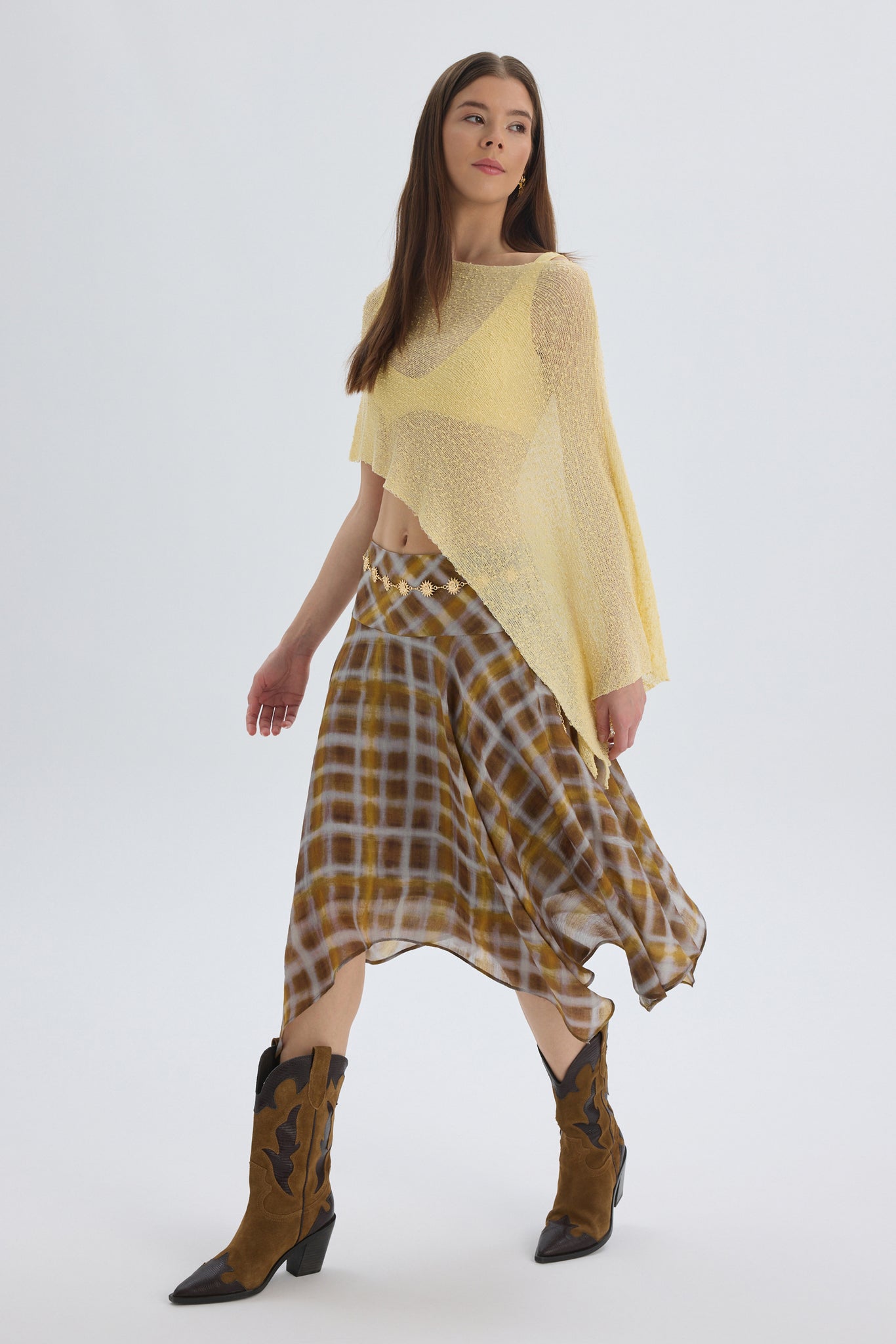 Amorette Asimetrik Ekoseli Sarı Midi Etek