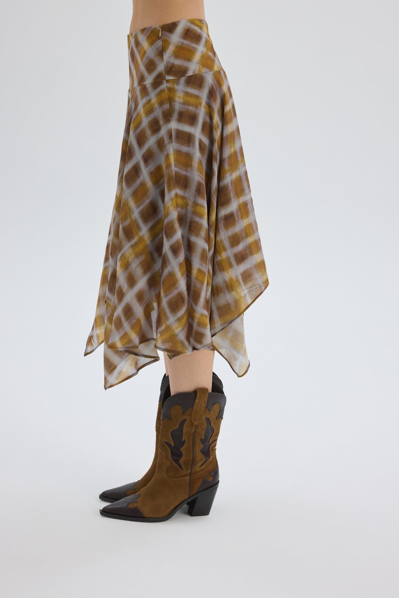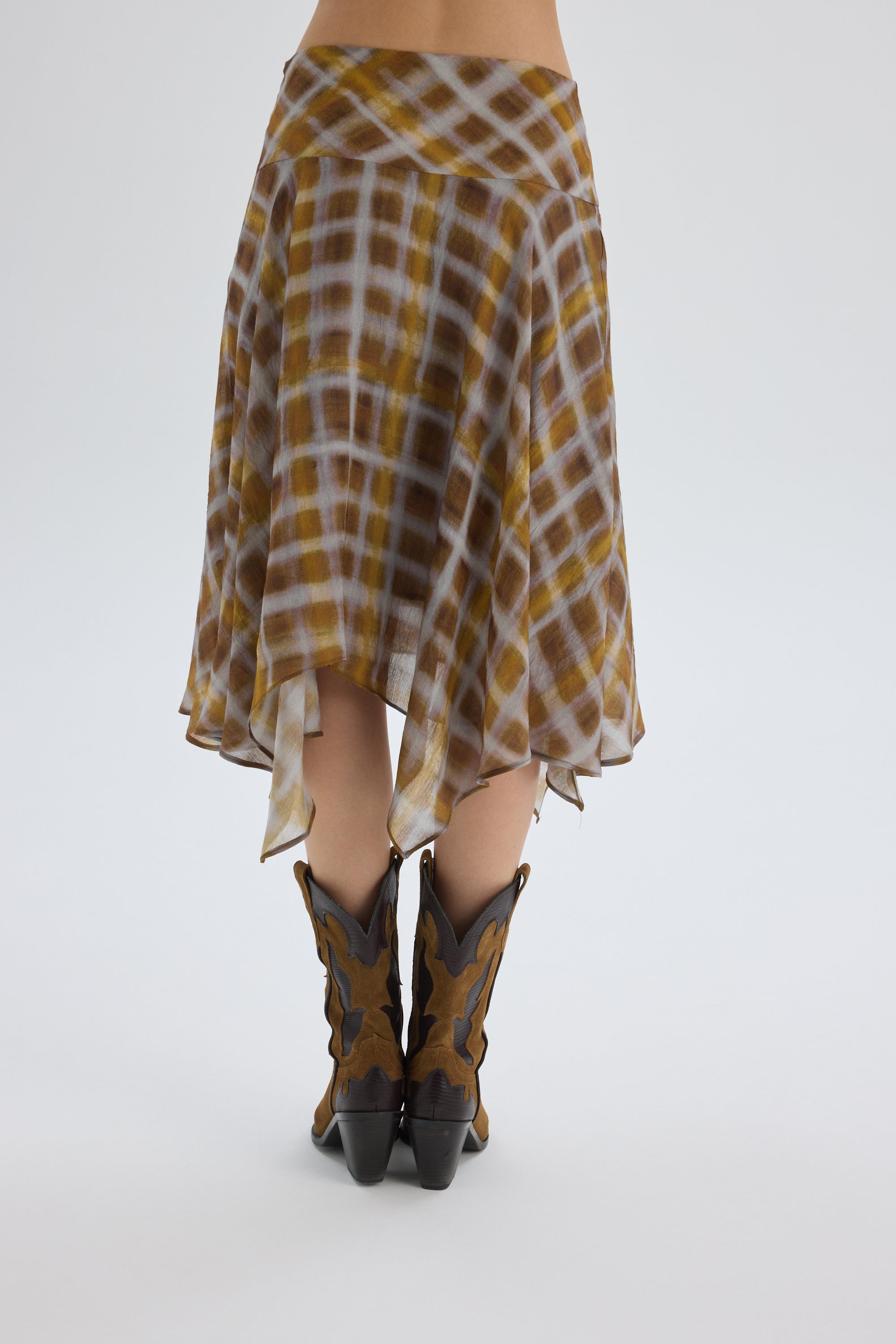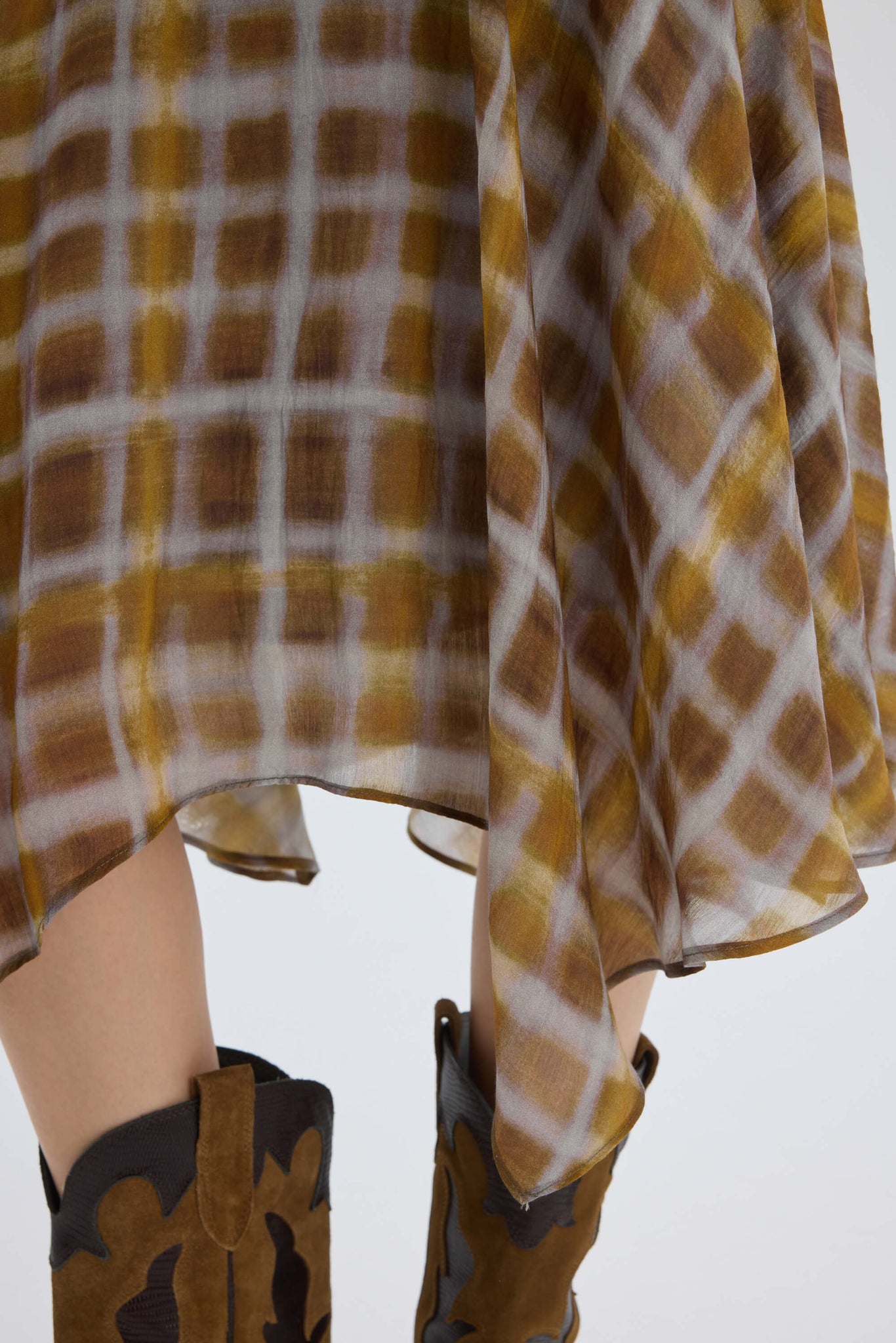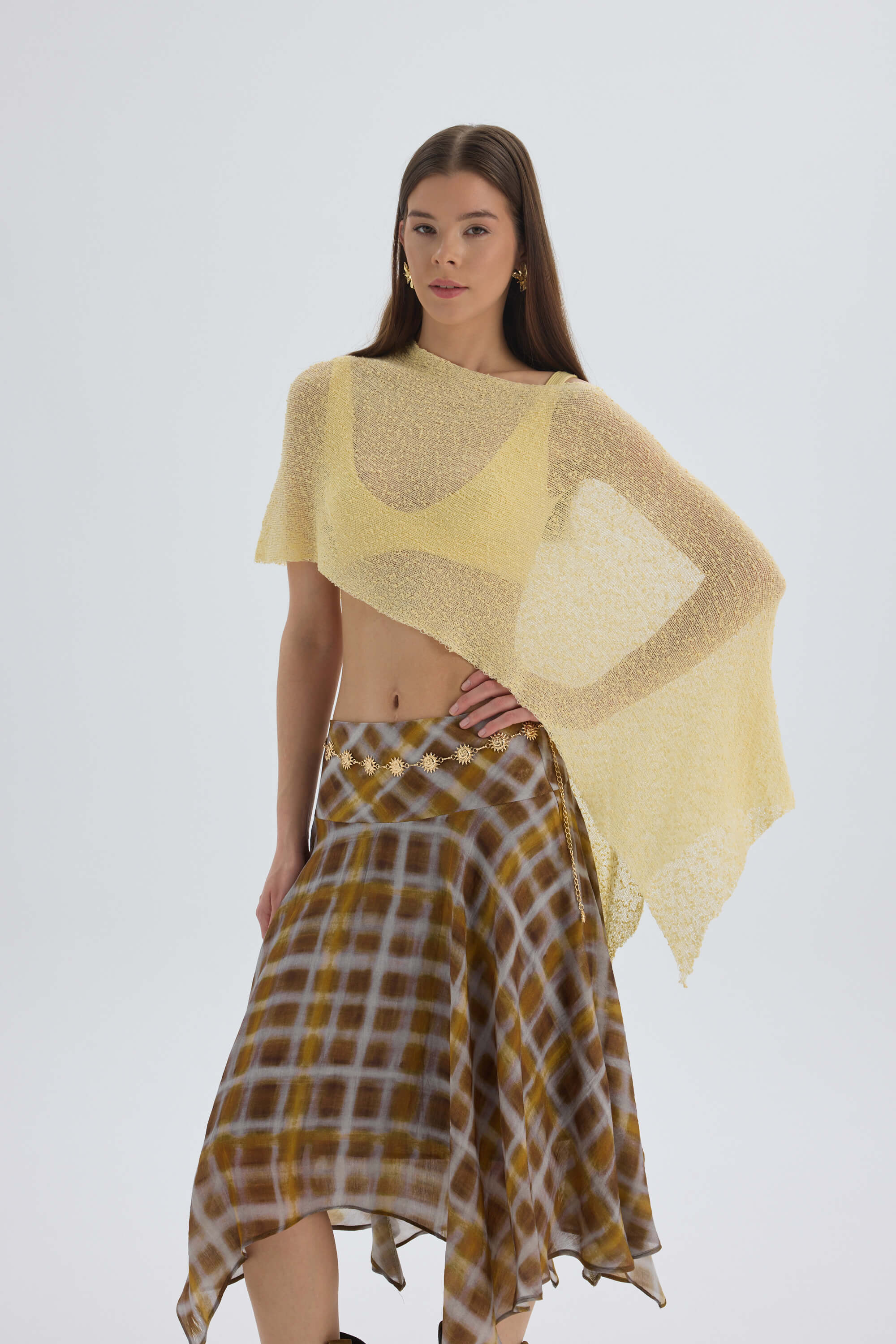 Amorette Asimetrik Ekoseli Sarı Midi Etek