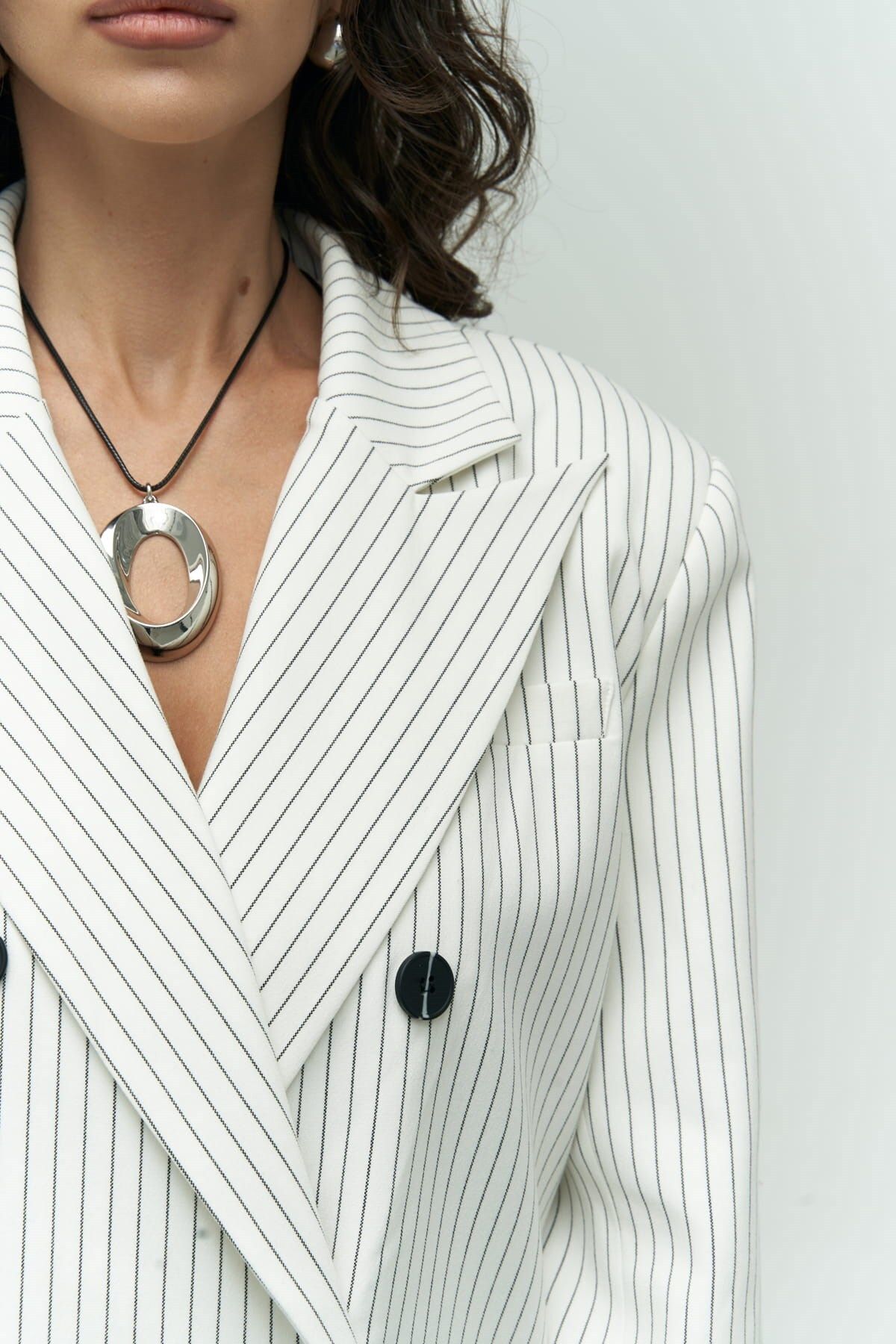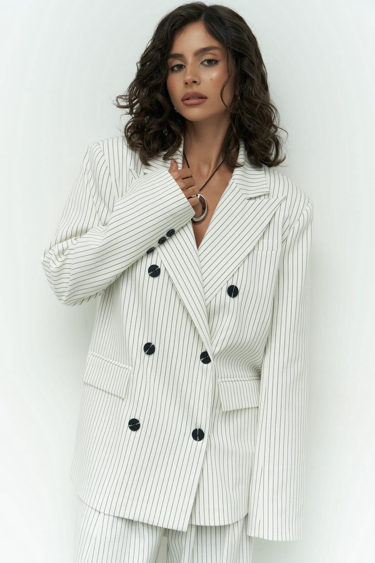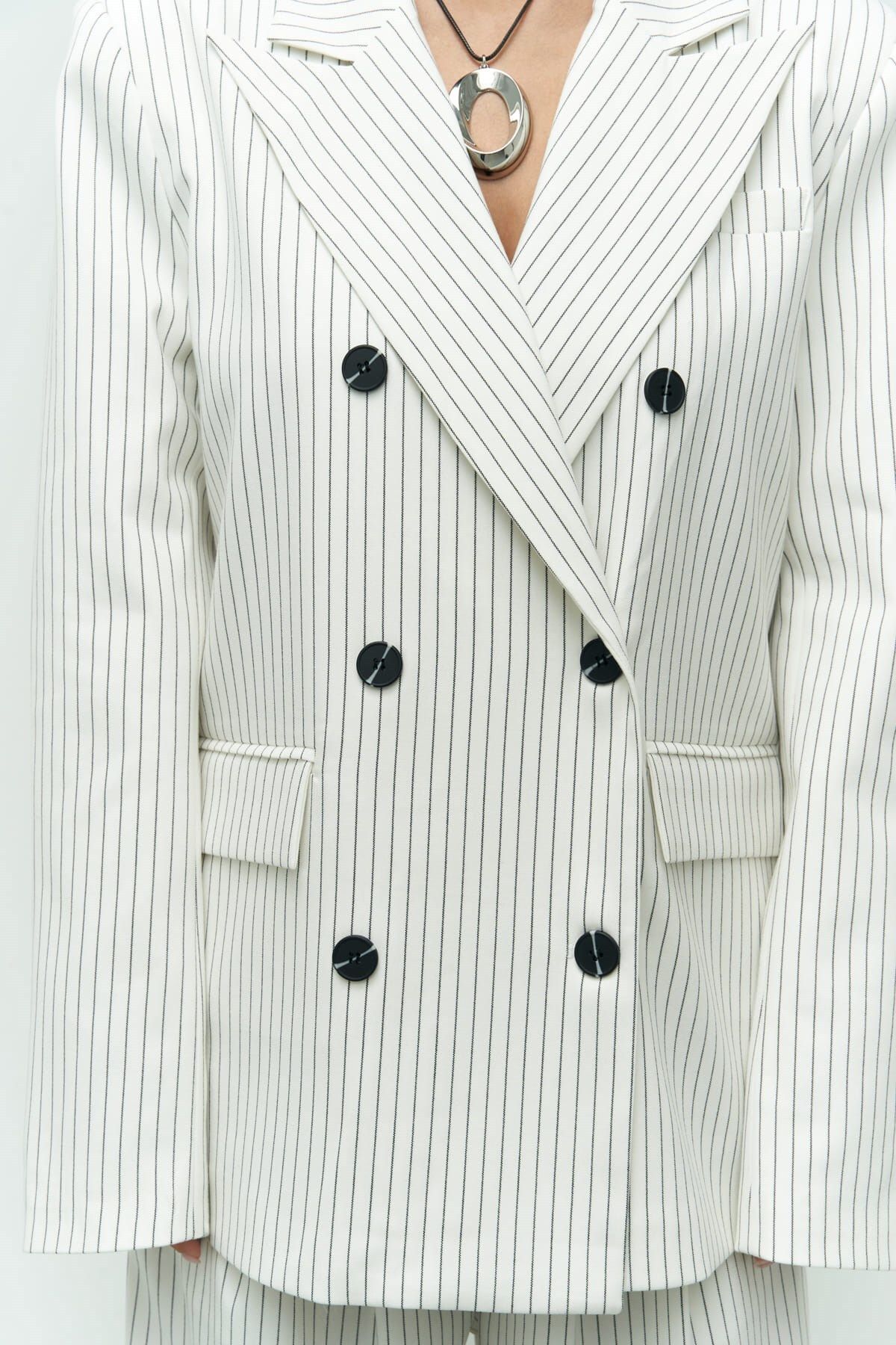 Omzu vatkalı, maskülen düz formda, önde altı düğme ve kruvaze kapamalı. Cepli blazer ceket.